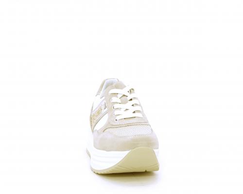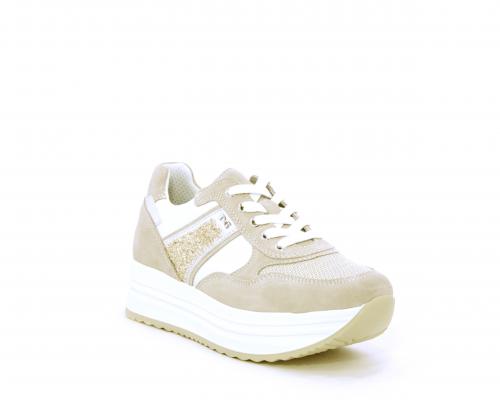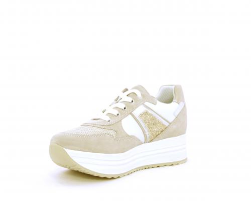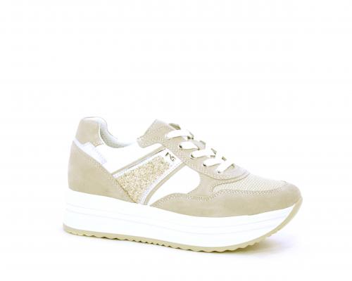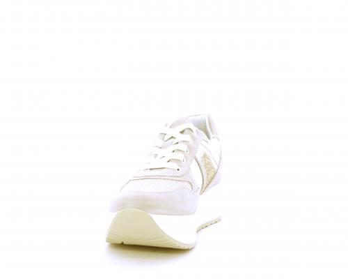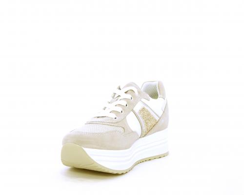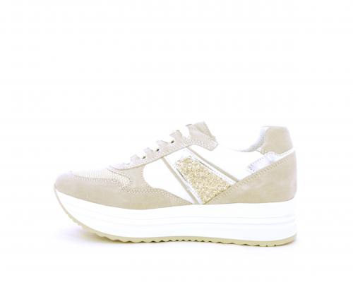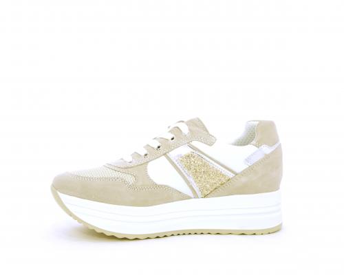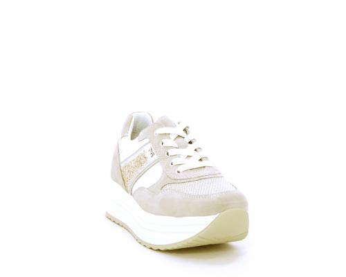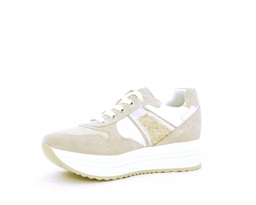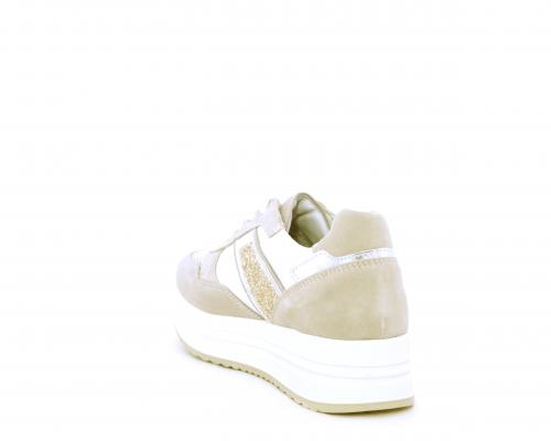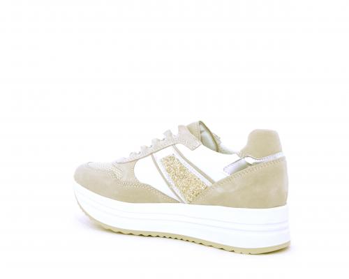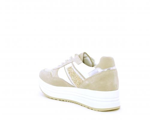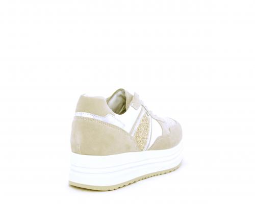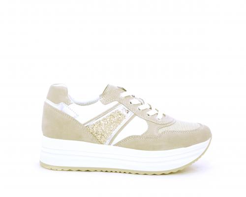 Sneakers allacciata in nabuk con parti in pelle e tessuto, banda in lurex nella parte laterale sia interna sia esterna della scarpa, sottopiede e fodera in pelle, plantare estaribile con sistema DryGo, che assprbe l'umidità quando si indossa la calzatura e si asciuga rapidamente quando si toglie la scarpa