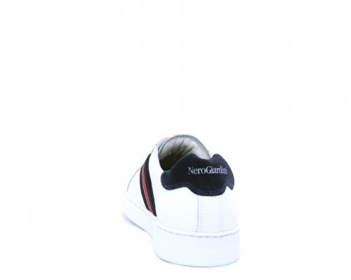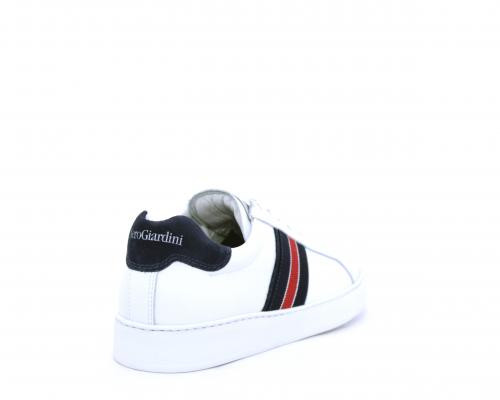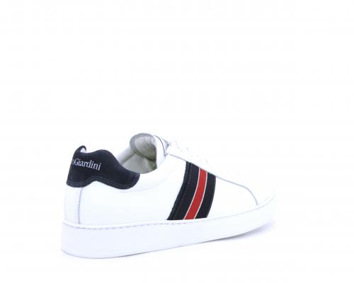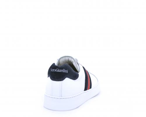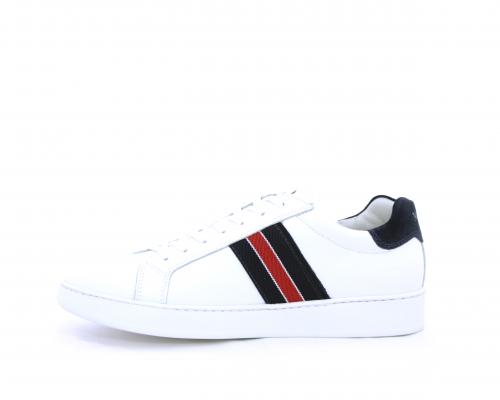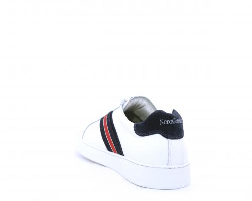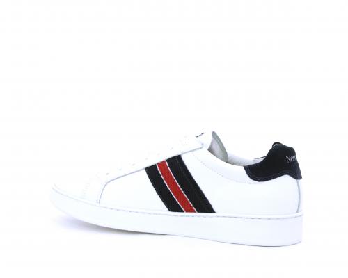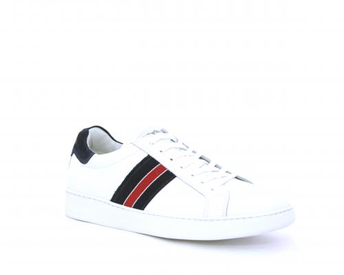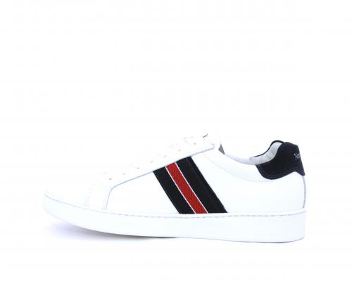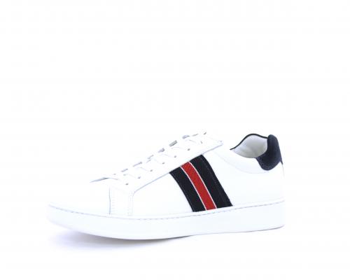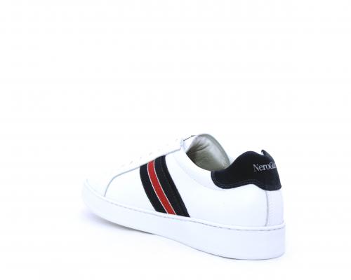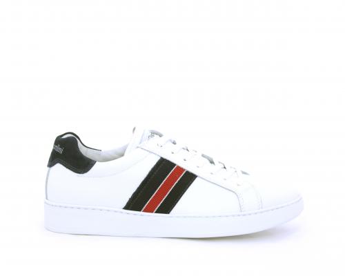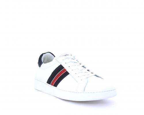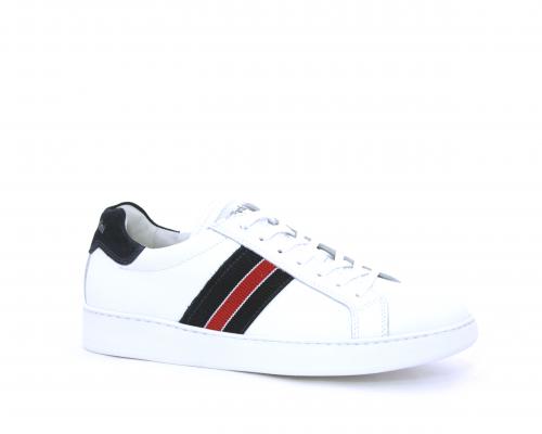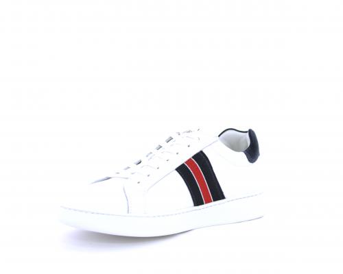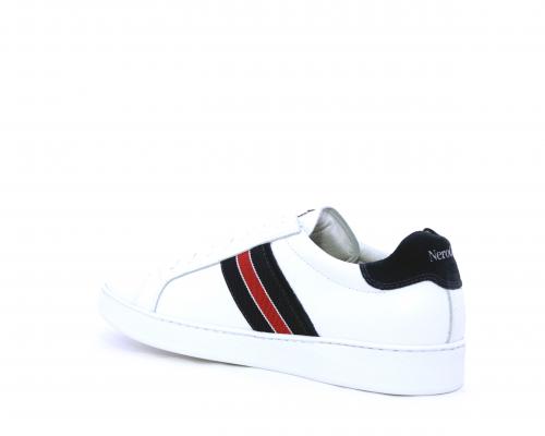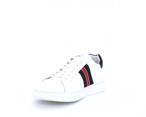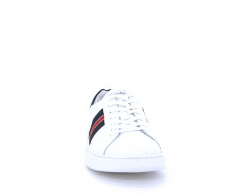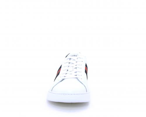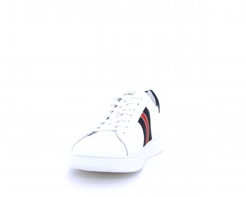 Sneakers bianca con banda laterale in tessuto blu er ossa allacciata in pelle, sottopiede e fodera in pelle, plantare estraibile con sistema DryGo con doppia azione che assorbe il sudore quando la scarpa è indossata e tolta la calzatura l'umidità si asciuga rapidamente