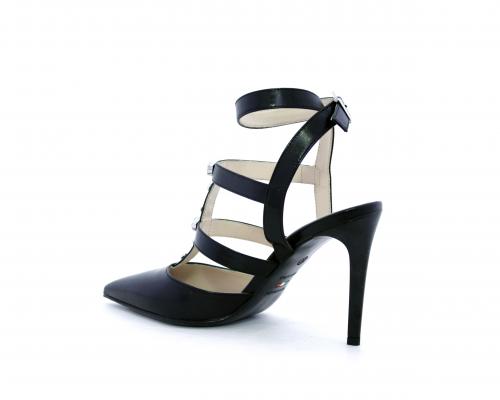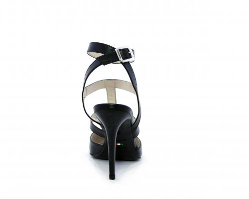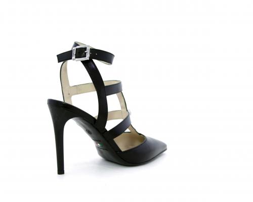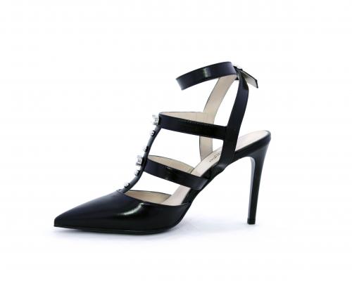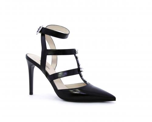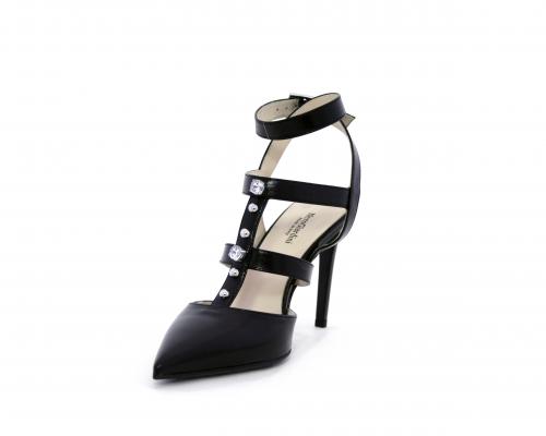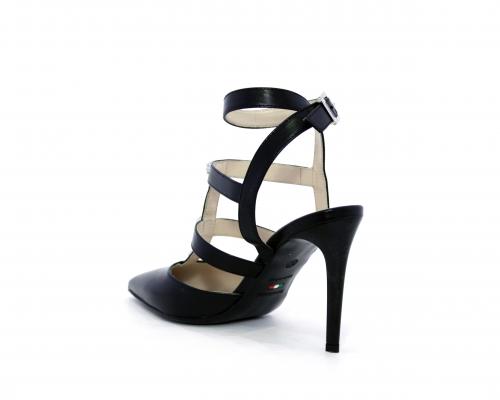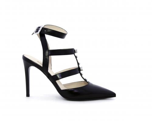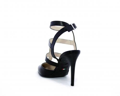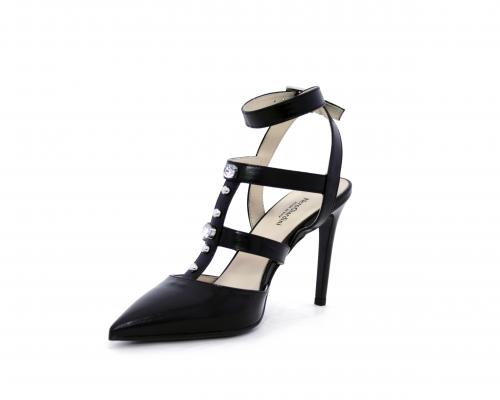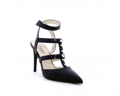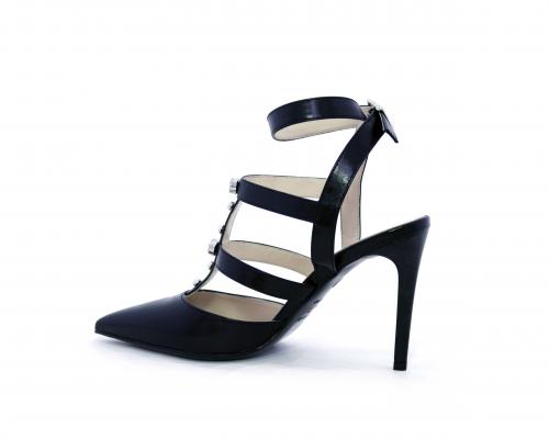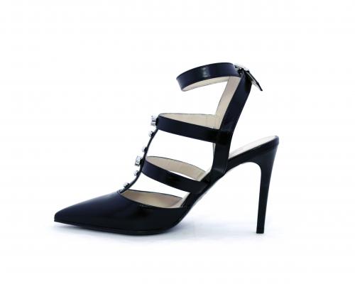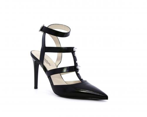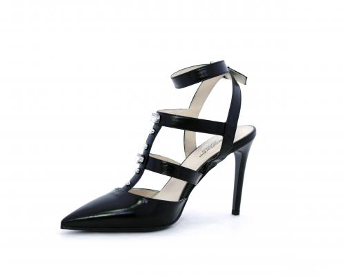 T-strap in pelle, con cinturino alla caviglia, e strass sul cinturino sul collo del piede, sottopiede e fodera in pelle, fondo in cuoio con mezza soletta in gomma
