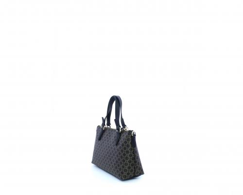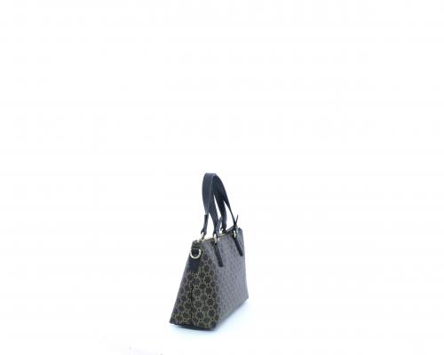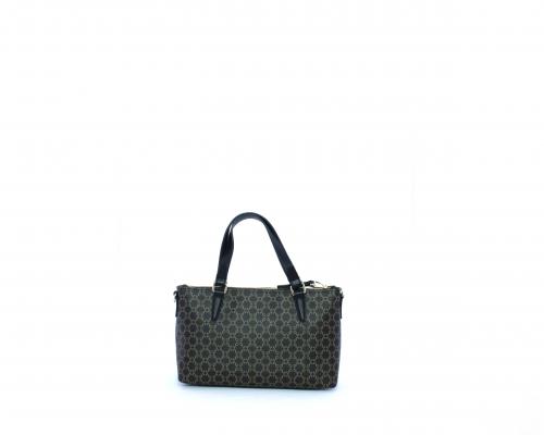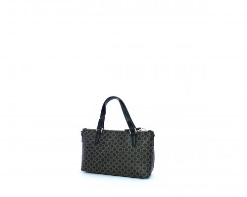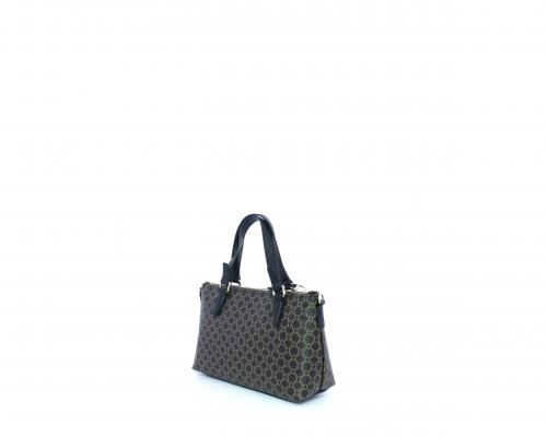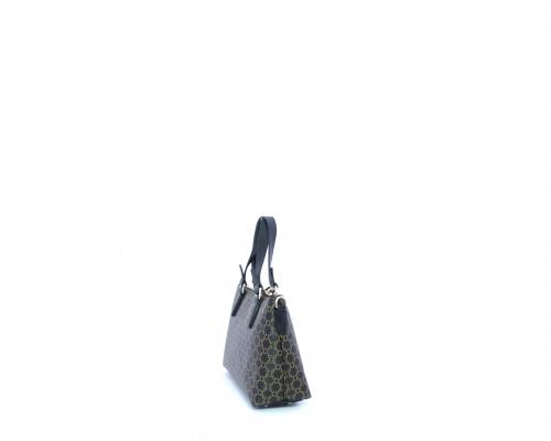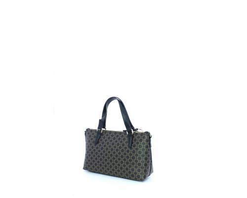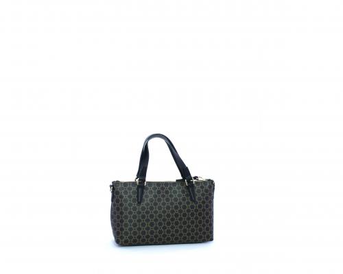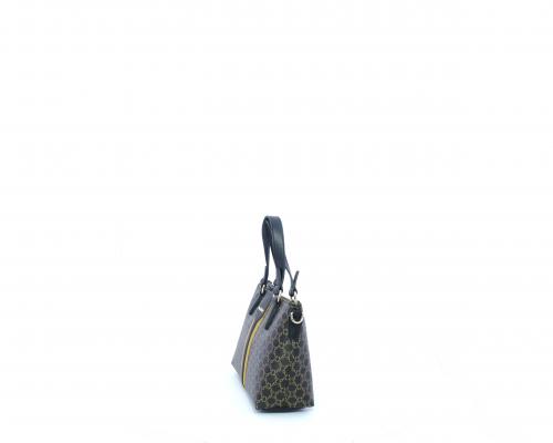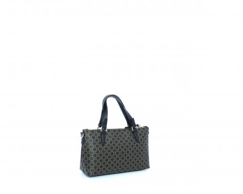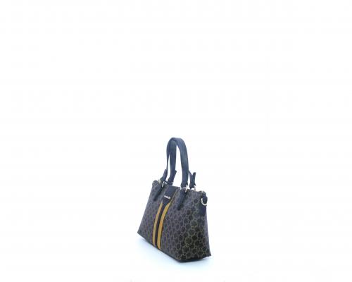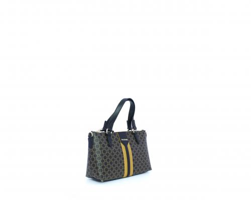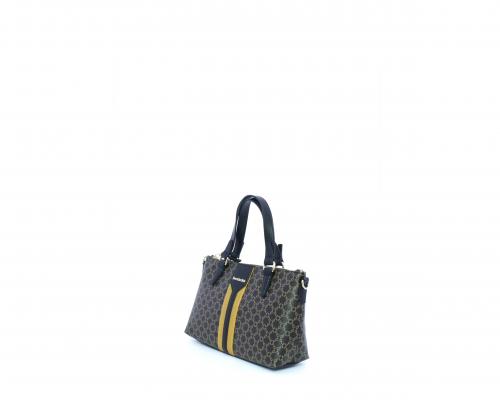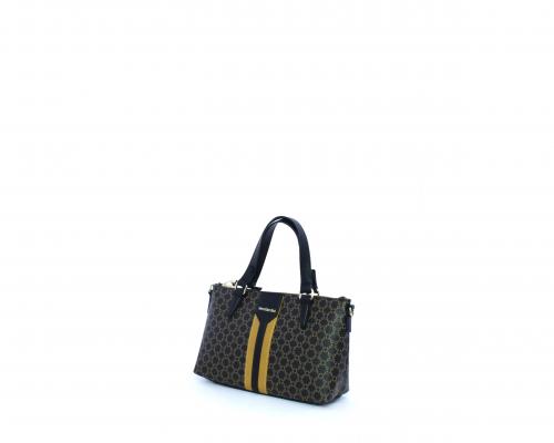 Borsa rettangolare con doppio manico corto e possibilità di aggiungere tracolla in pelle regolabile, stampa con logo NG e fascia colorata in pelle, chiusura con zip, interno in tessuto con due taschini uno aperto e uno chiuso.