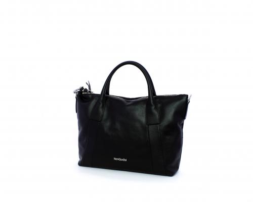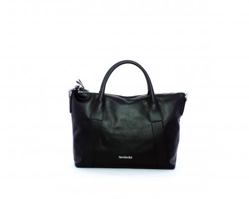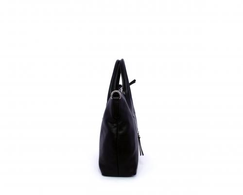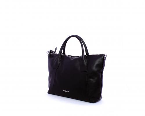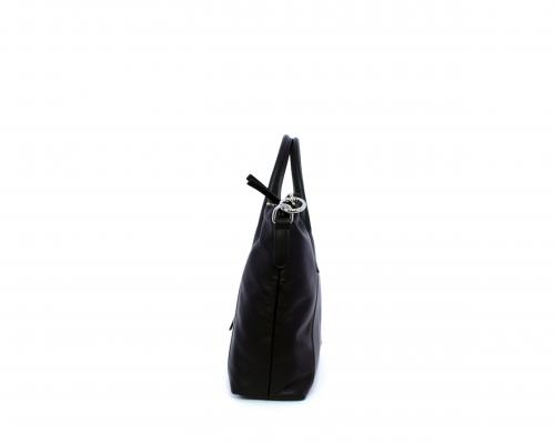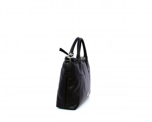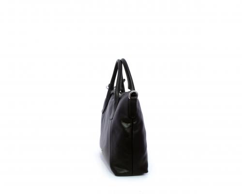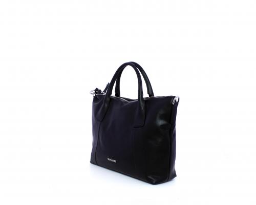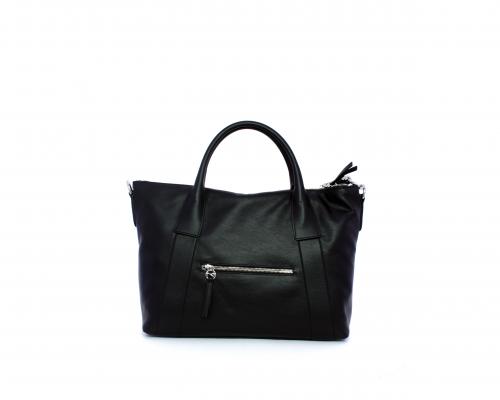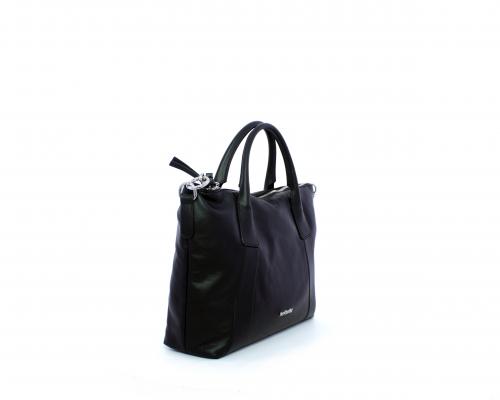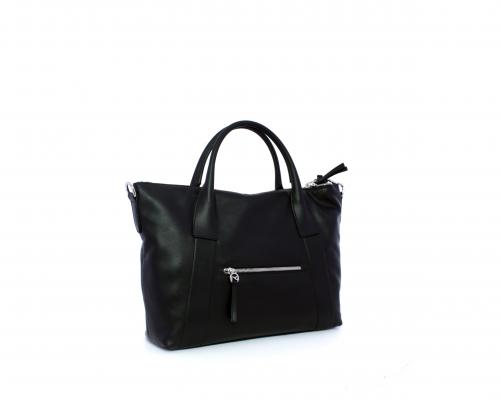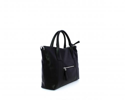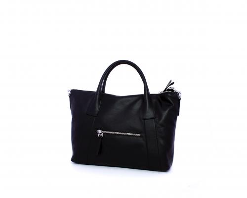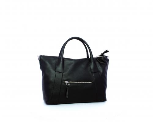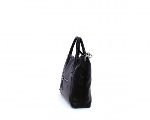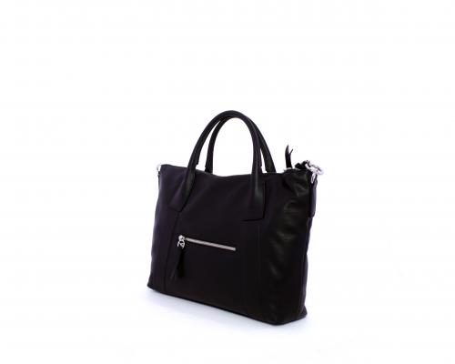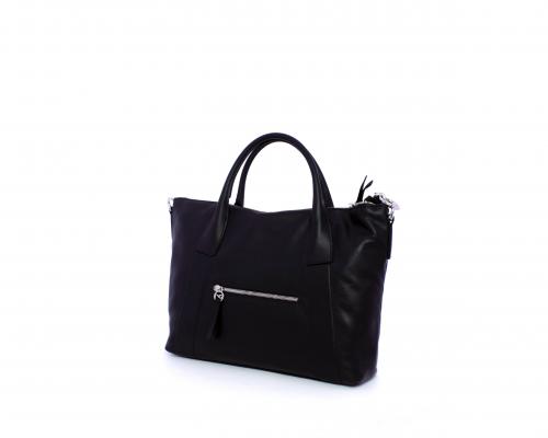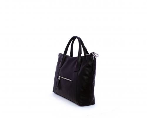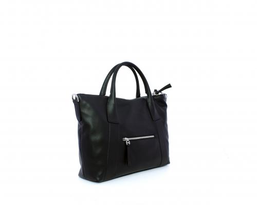 Borsa in vera pelle, forma rettangolare con manico corto e tracolla costituita dalla catena in acciaio intrecciata con la pelle, taschino chiuso con zip nella parte posteriore della borsa, fodera interna con due taschini uno aperto e uno chiuso tramite zip.