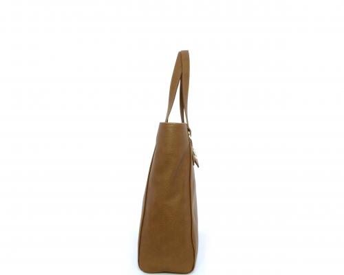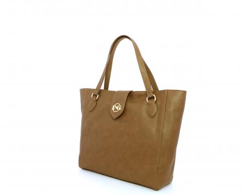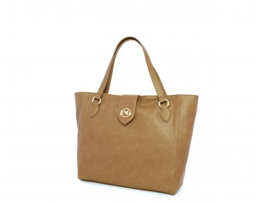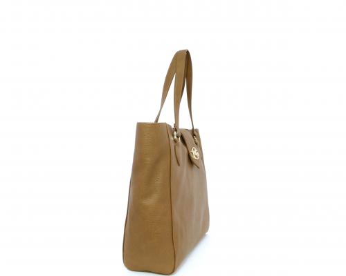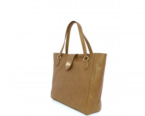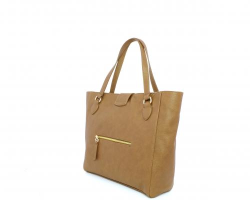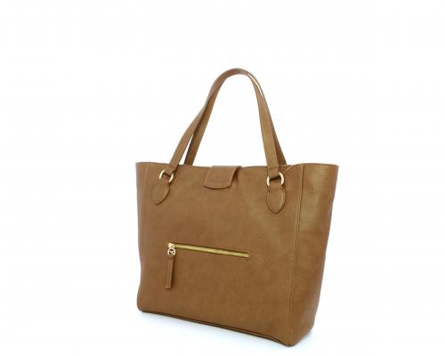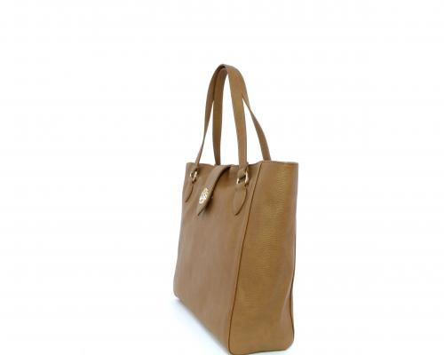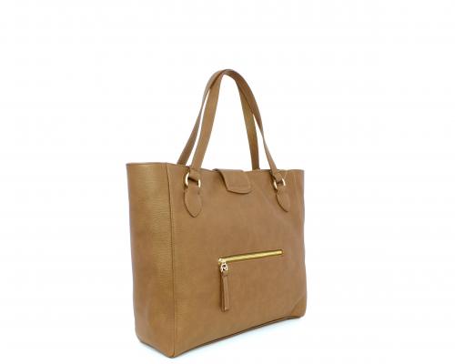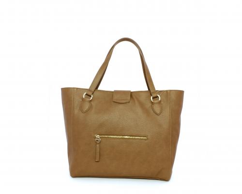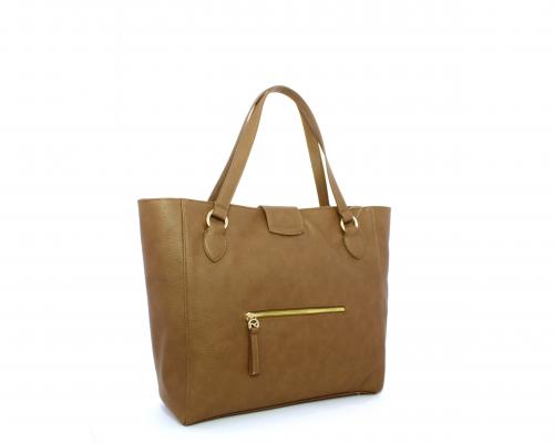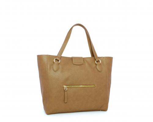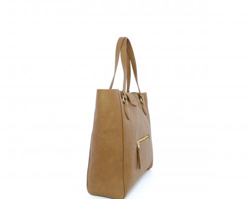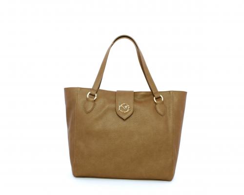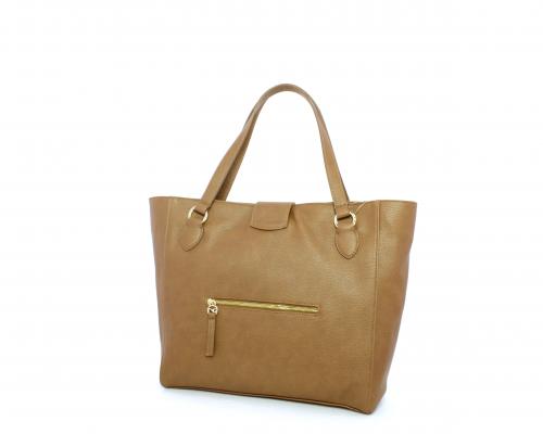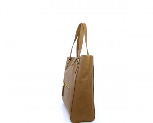 Borsa in vera pelle monospalla con doppio manico in pelle, con inserti color oro, ribaltina in pelle con clip, chiusura generale della borsa con zip, fodera in tessuto con due taschini uno aperto e uno chiuso con zip.