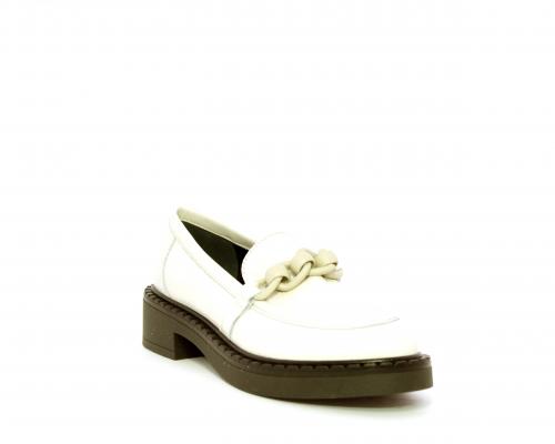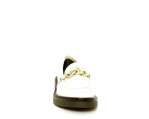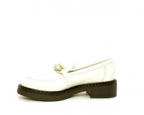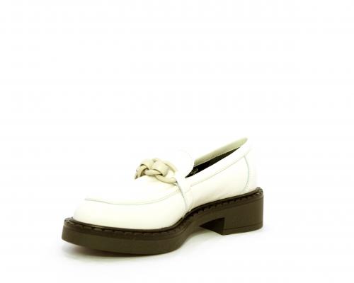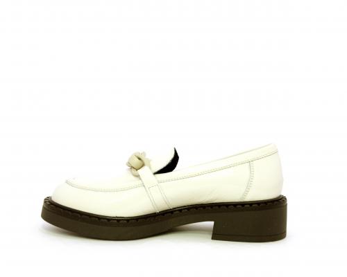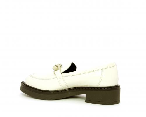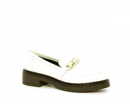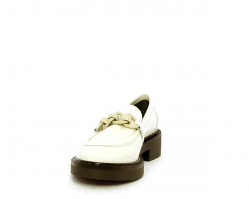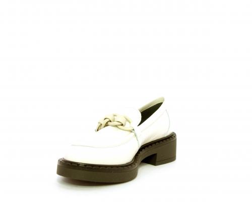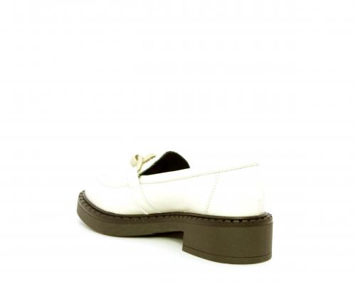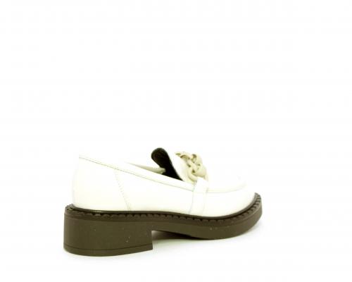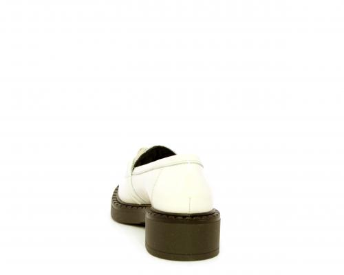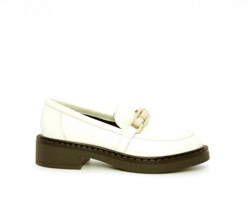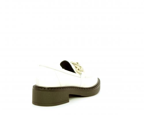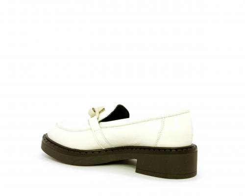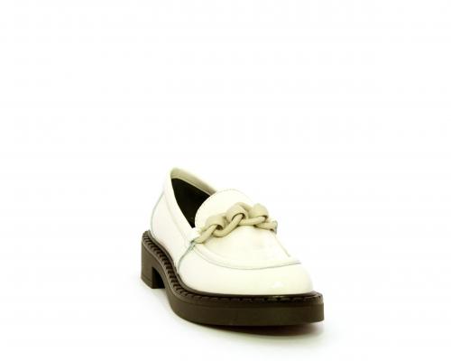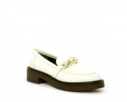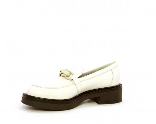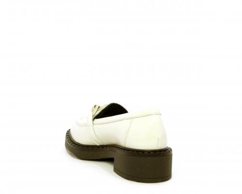 Mocassino in vernice con catena sul collo, sottopiede per metà in pelle e metà in cuio, fodera in pelle.