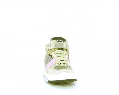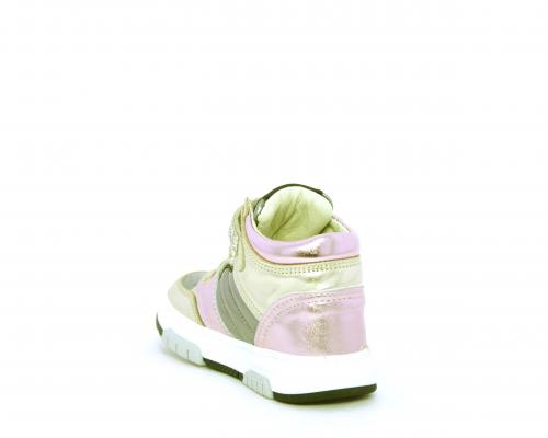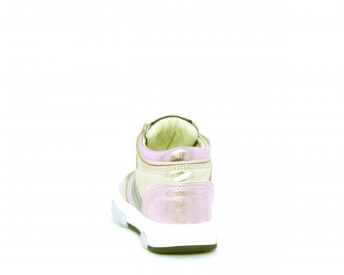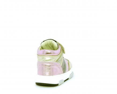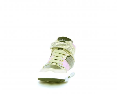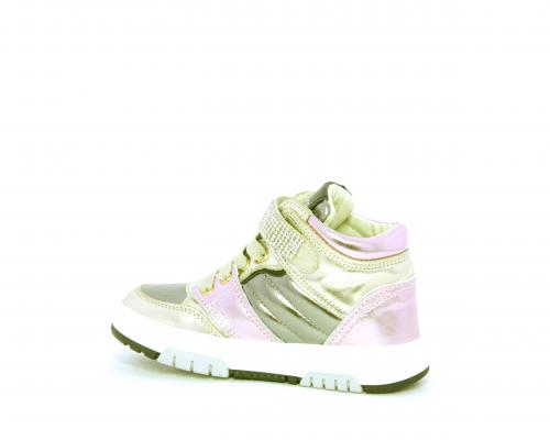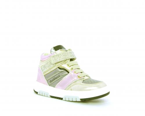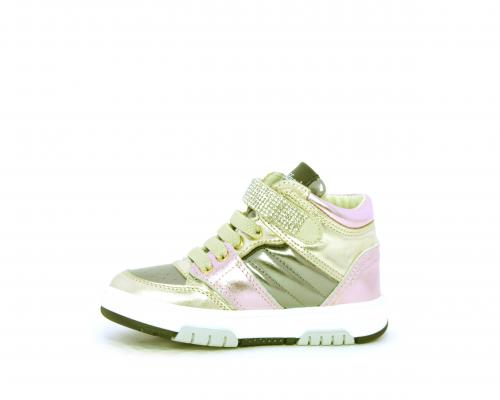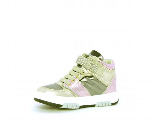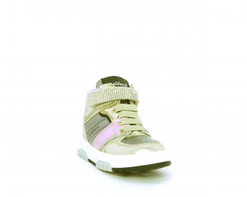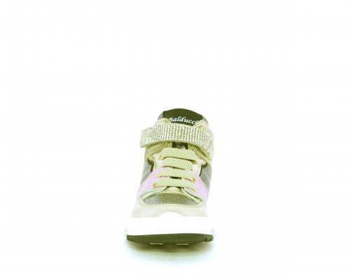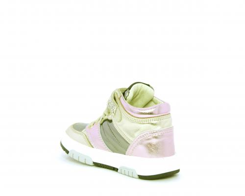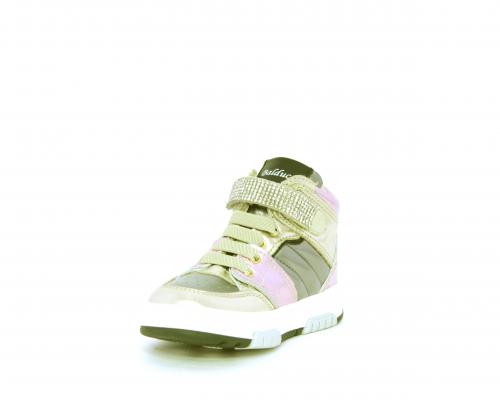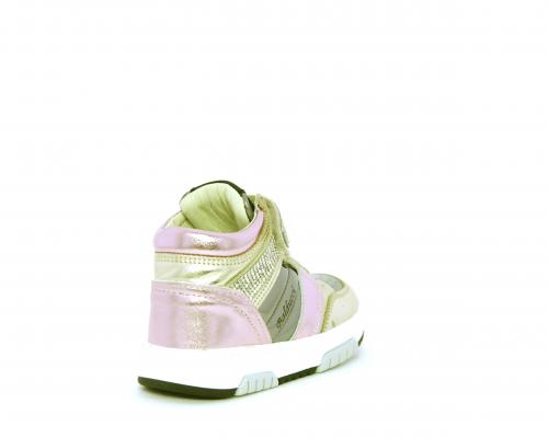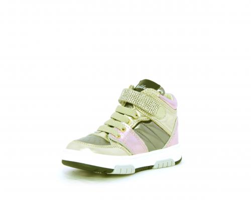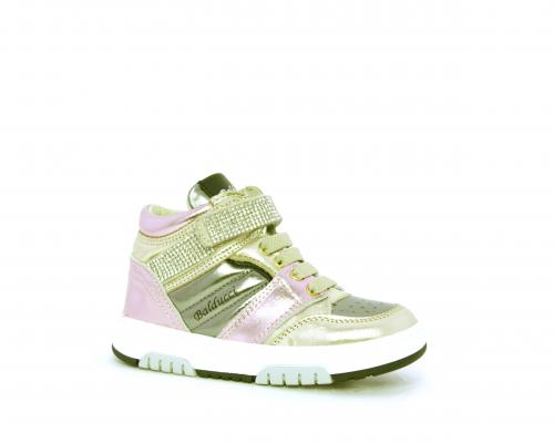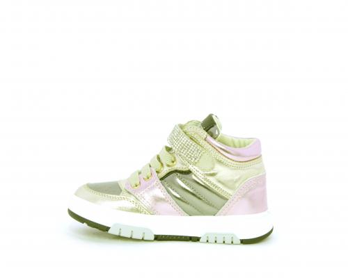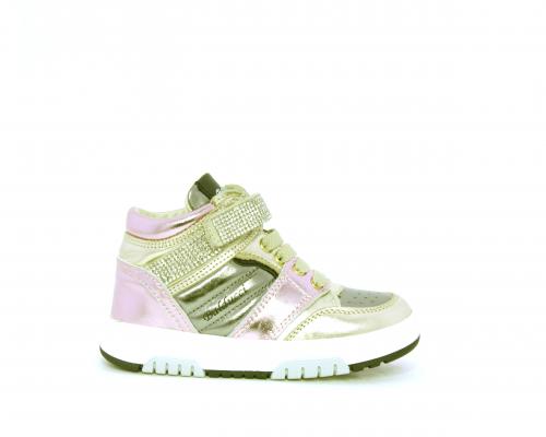 Sneakers in pelle laminata, lacci e velcro con strass, fodera e sottopiede in pelle, fusbet estraibile
