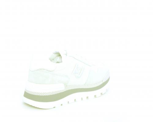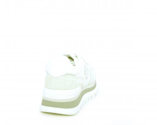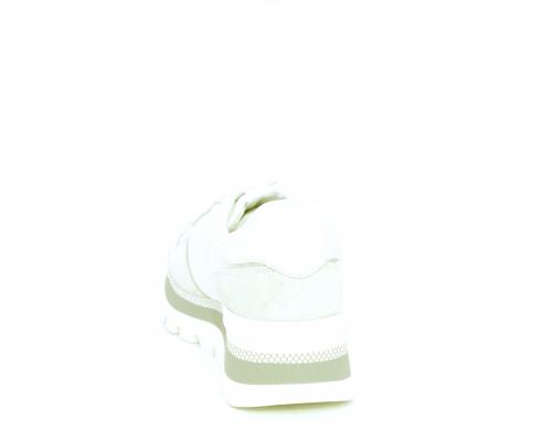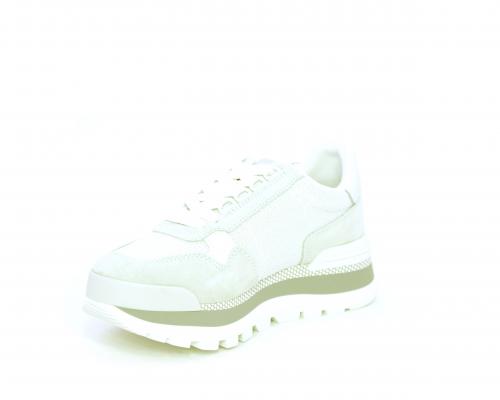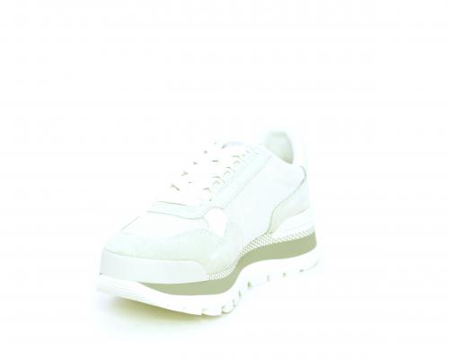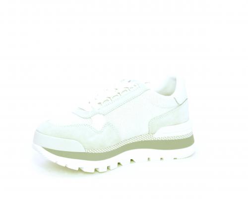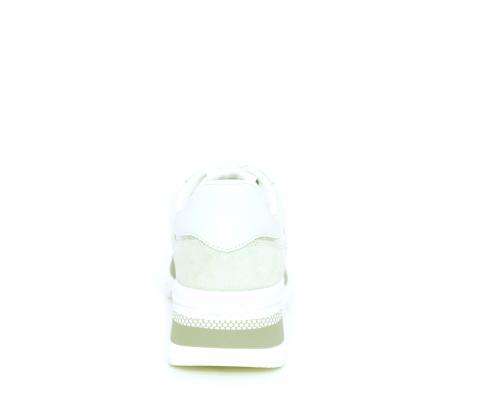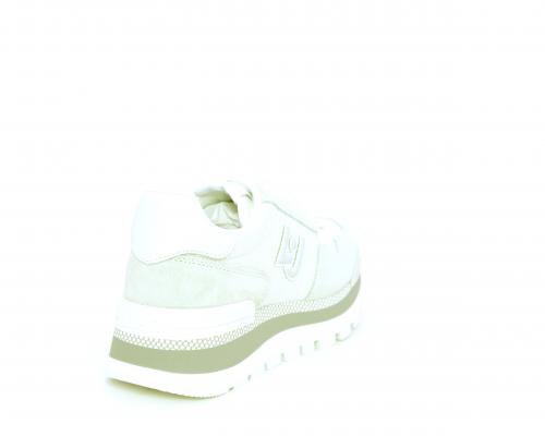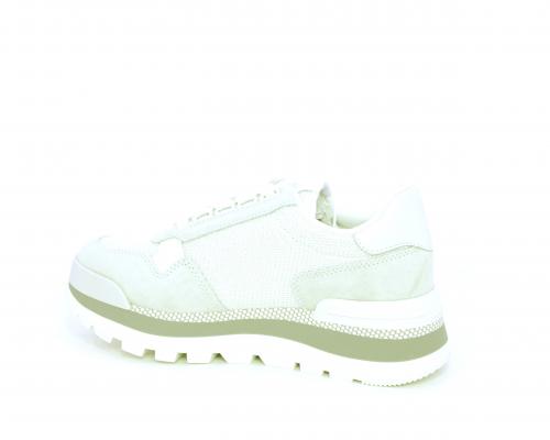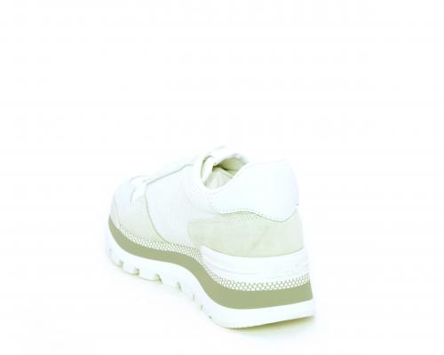 Sneakers allacciata in nabuk e tessuto in lurex, con zeppa lavorata, sottopiede e fodera interna in tessuto, fusbet estraibile.