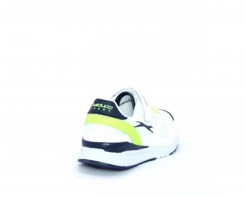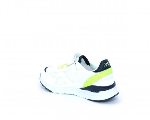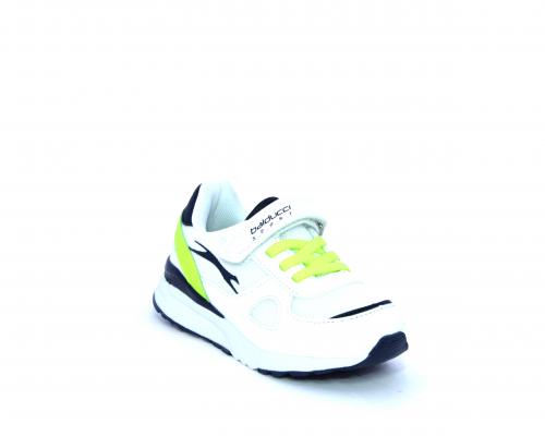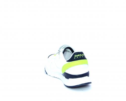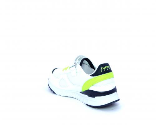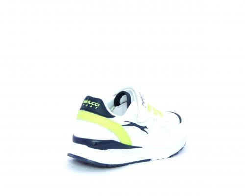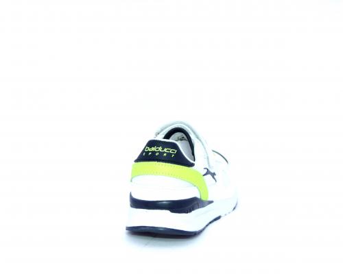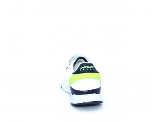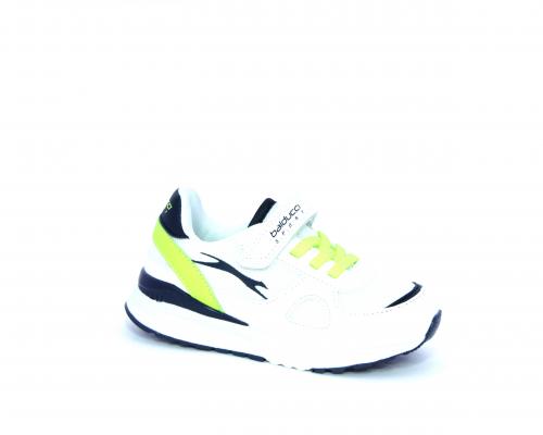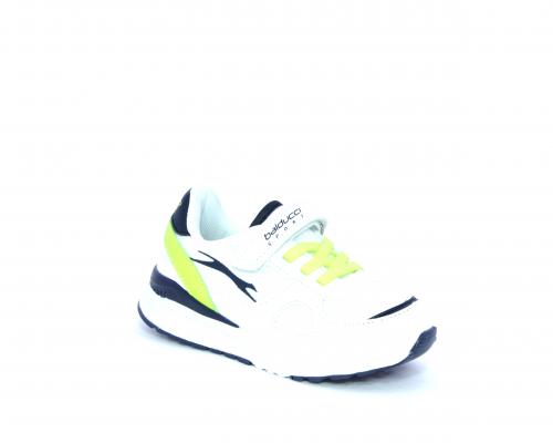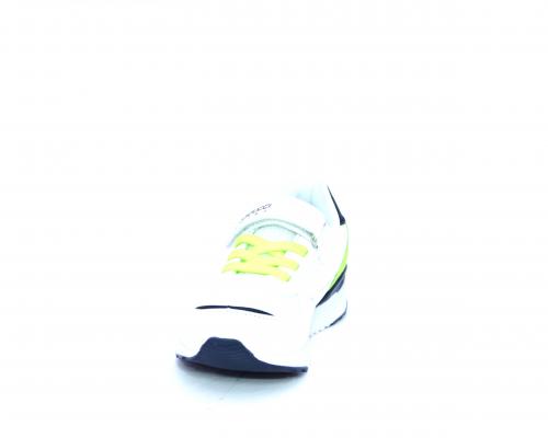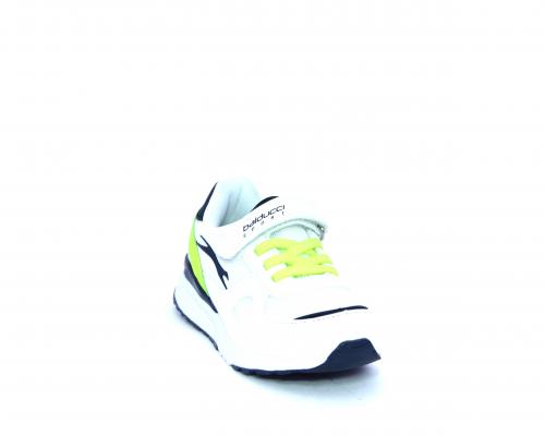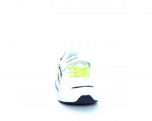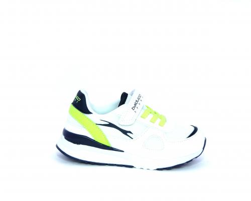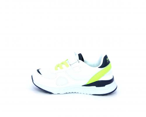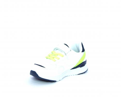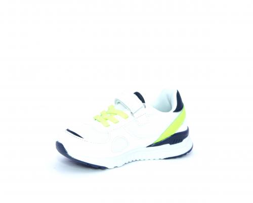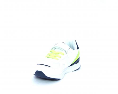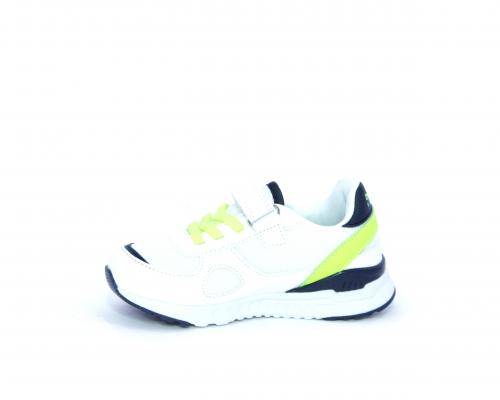 Sneakers in pelle e tessuto con velcro e lacci elasticizzati, sottopiede in pelle, fodera interna in tessuto, fusbet estraibile.