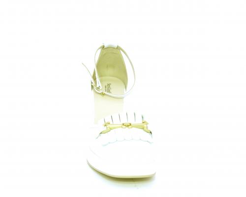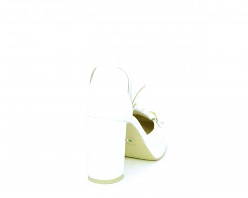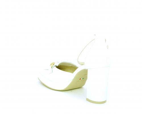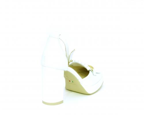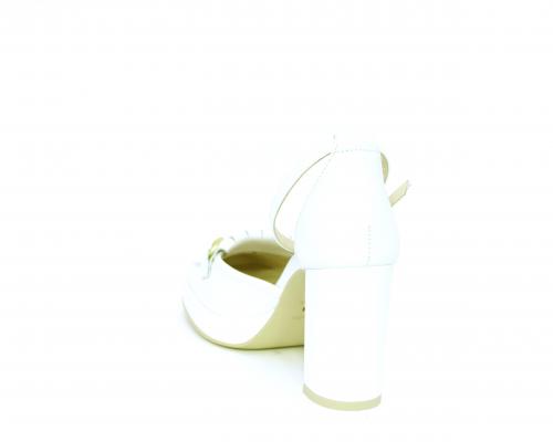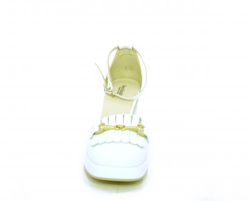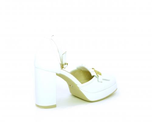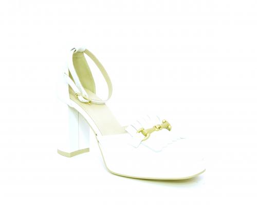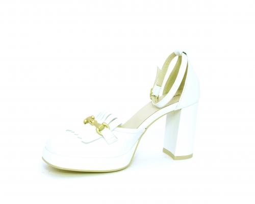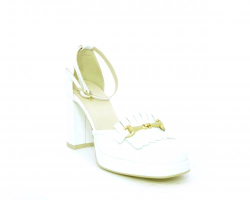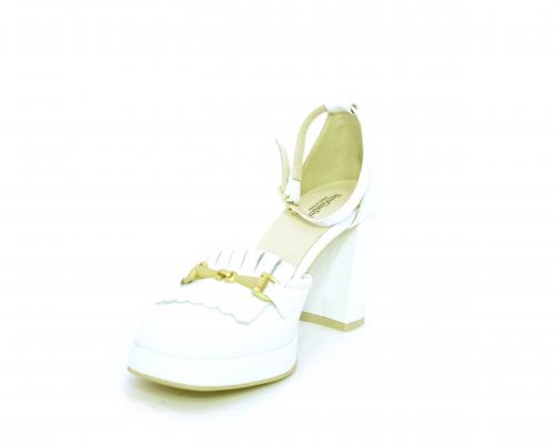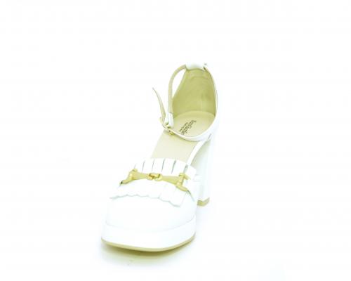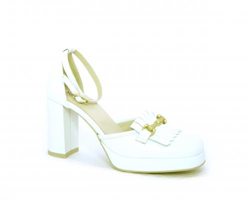 Chanel in pelle, con tacco largo e plateaux sempre in pelle, cinturino regolabile intorno alla caviglia, rifiniture color oro, sottopiede e fodera interna in pelle, fusbet con memory.