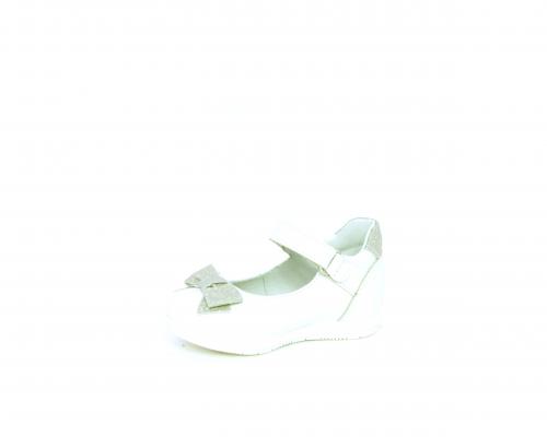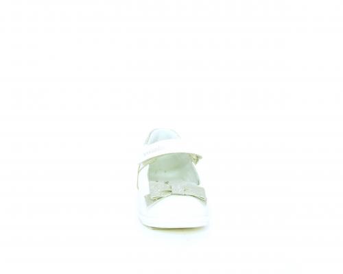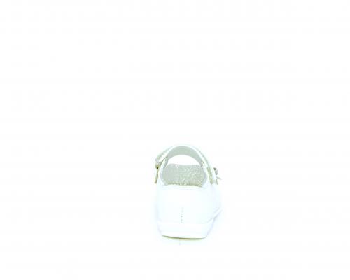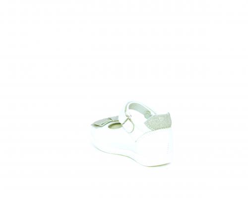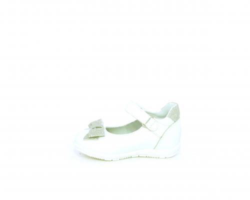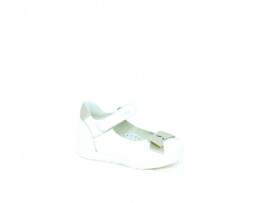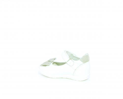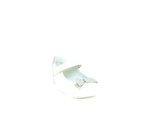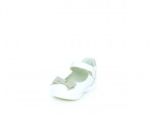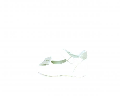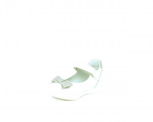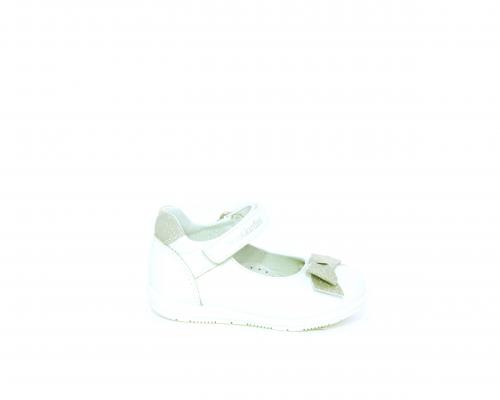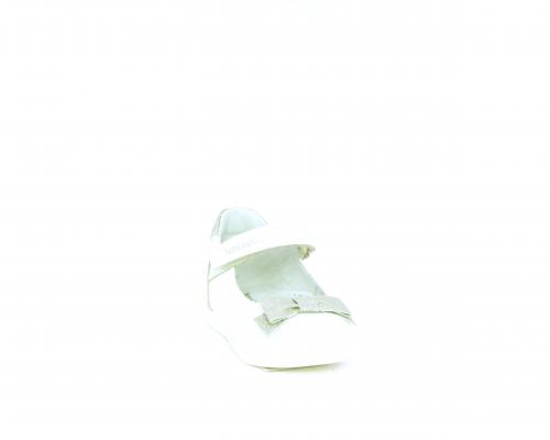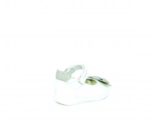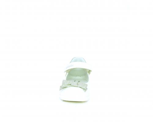 Ballerina in pelle con velcro, fiocchetto in lurex argento, sottopiede e fodera interna in pelle.