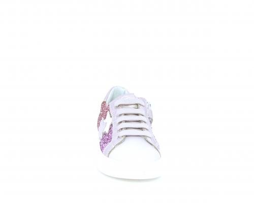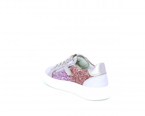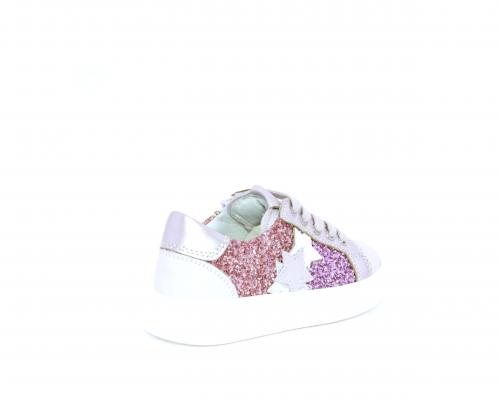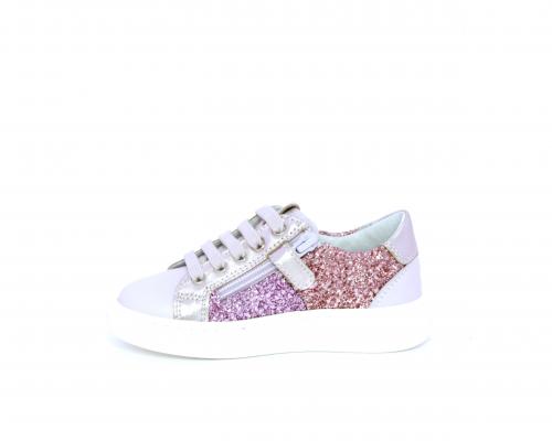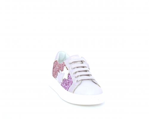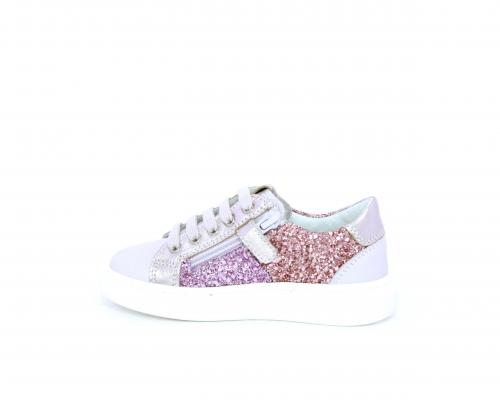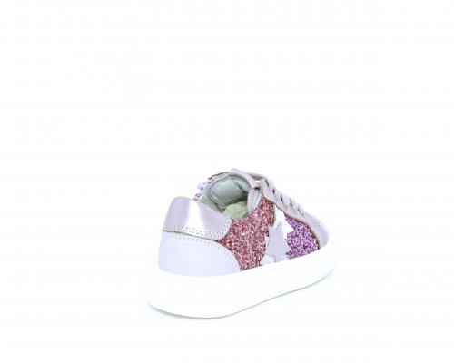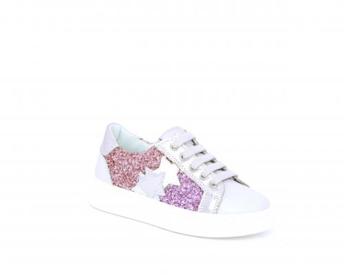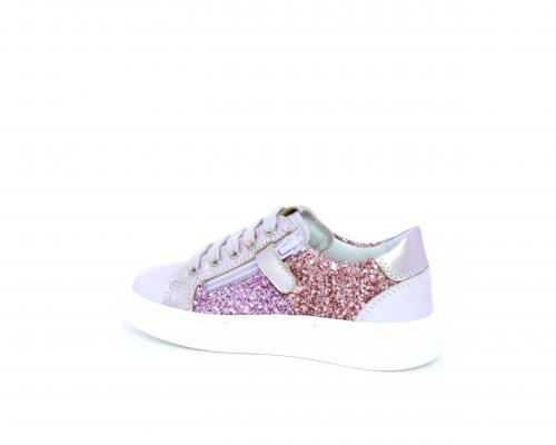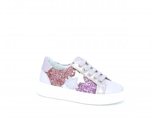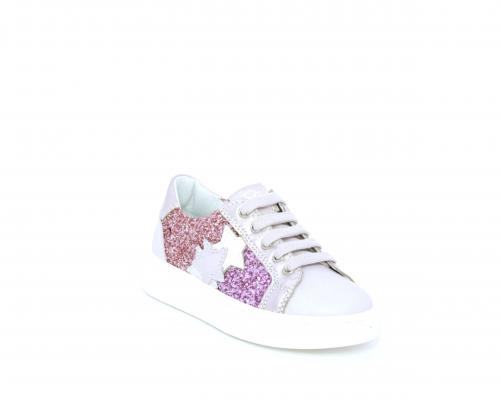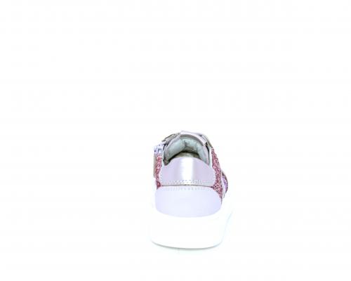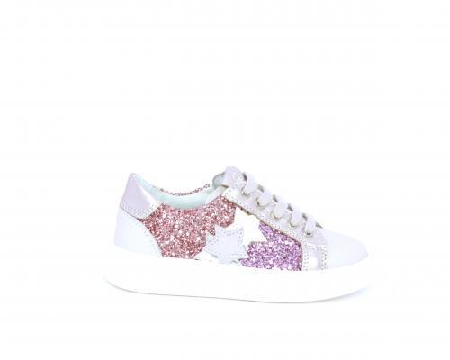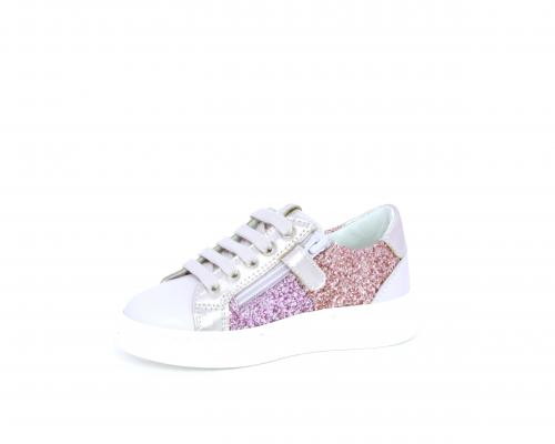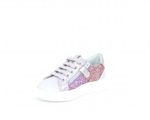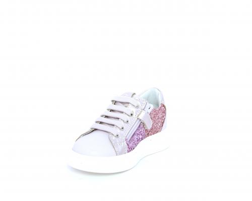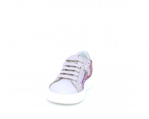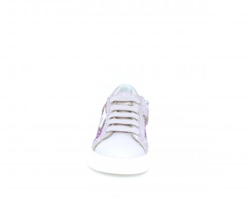 Sneakers allacciata con chiusura laterale per facilitare la calzata, tomaia in pelle con parte in lurex, sottopiede e fodera interna in pelle, fusbet estraibile.