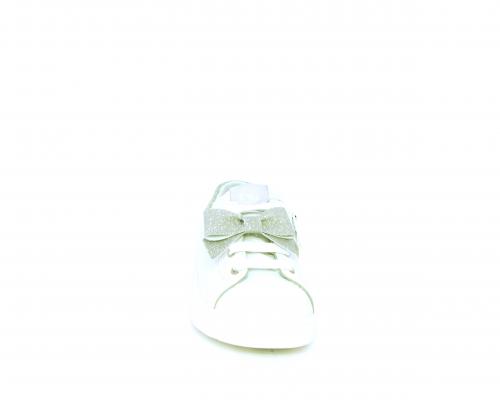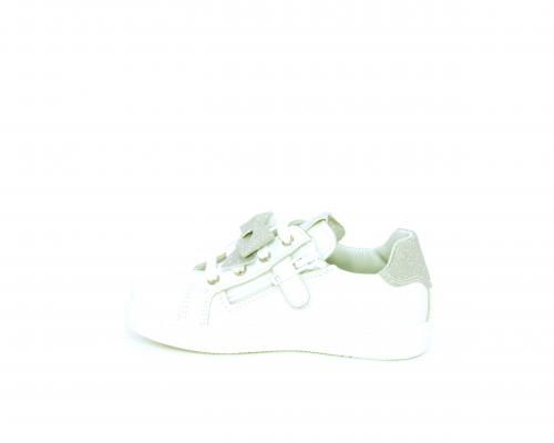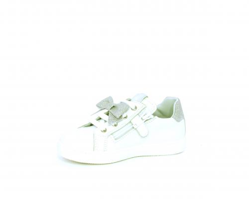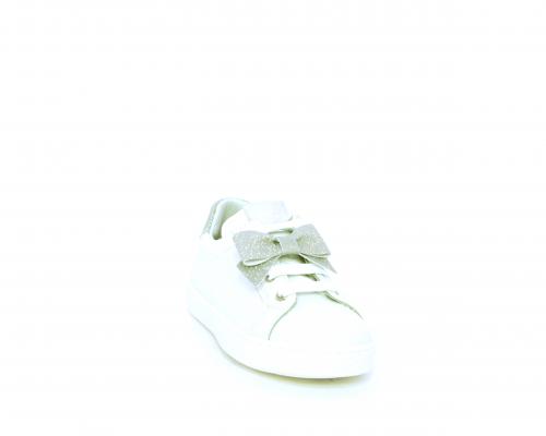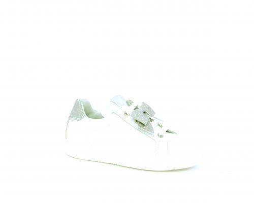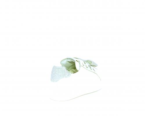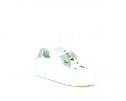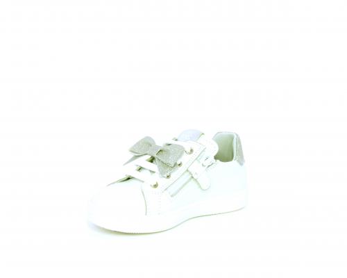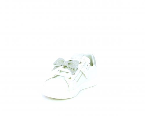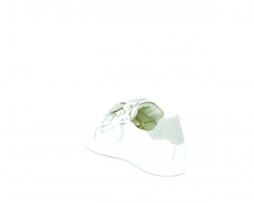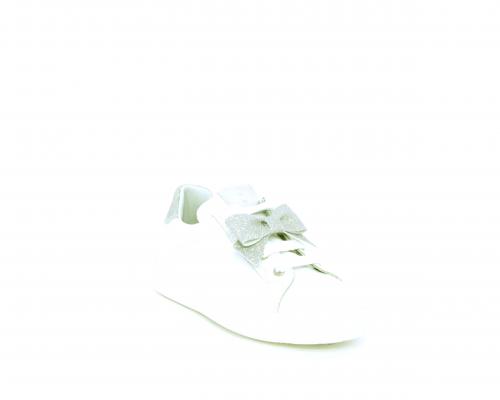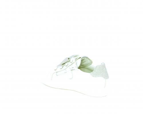 Sneakers allacciata con chiusura laterale per facilitare la calzata, tomaia in pelle con fiocchetto in lurex argentato removibile, sottopiede e fodera interna in pelle, fusbet estraibile.