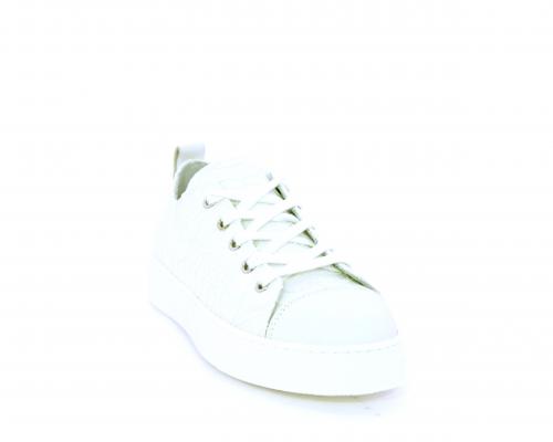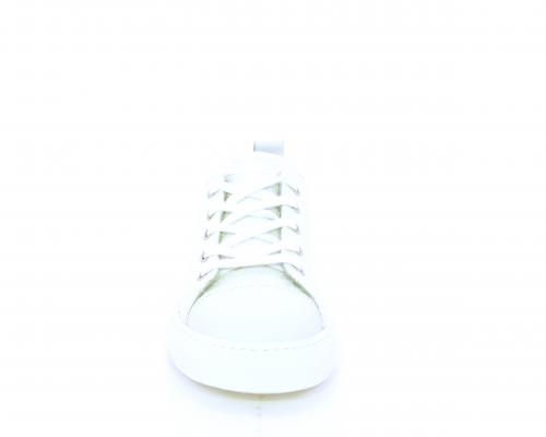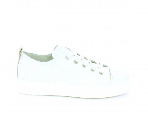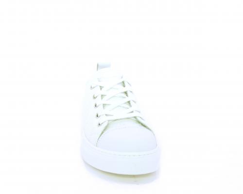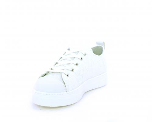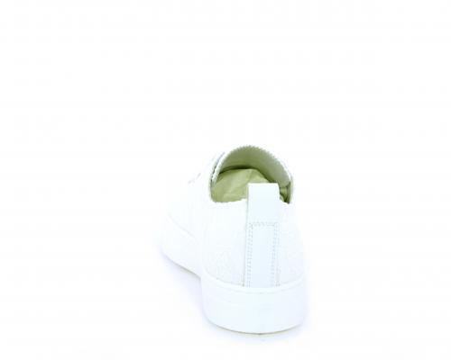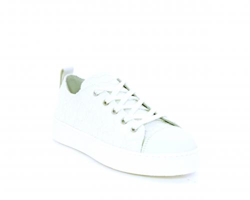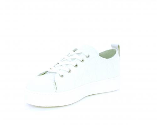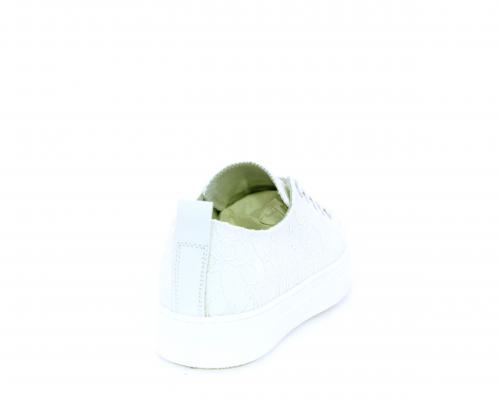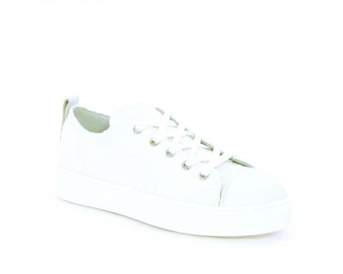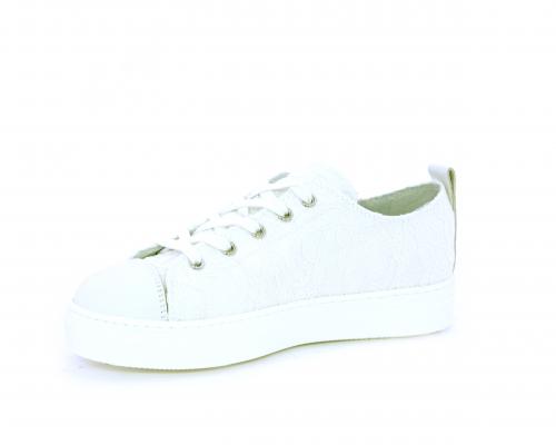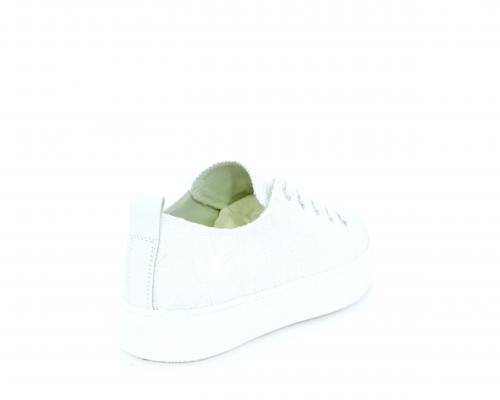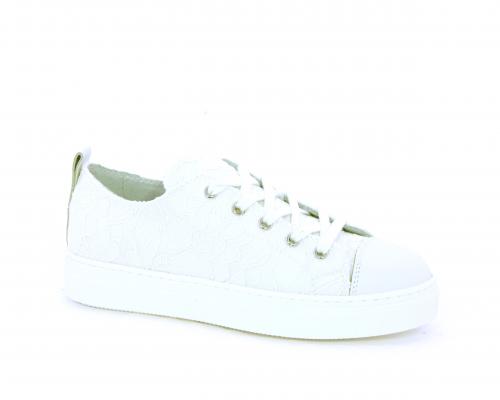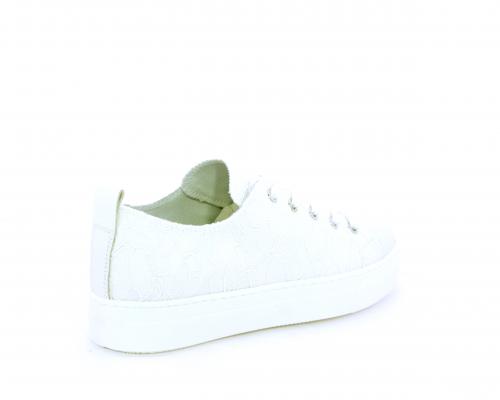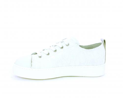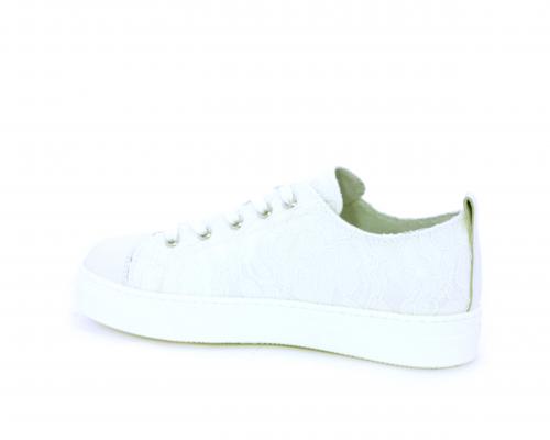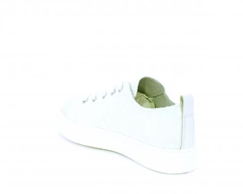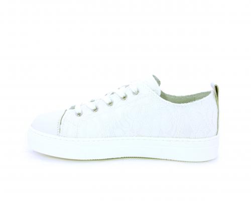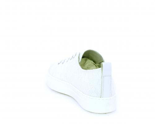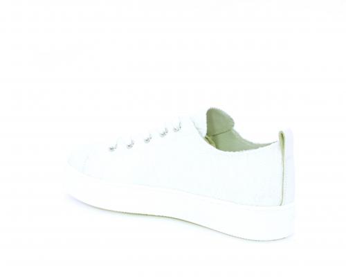 Sneakers allacciata, tomaia in tessuto ricamato punta in pelle bianca, sottopiede e fodera interna in pelle, fusbet estraibile.