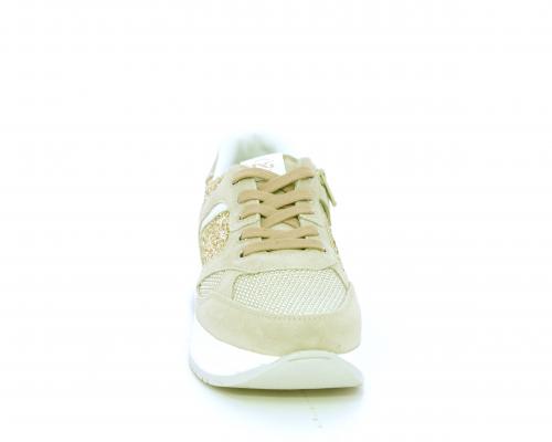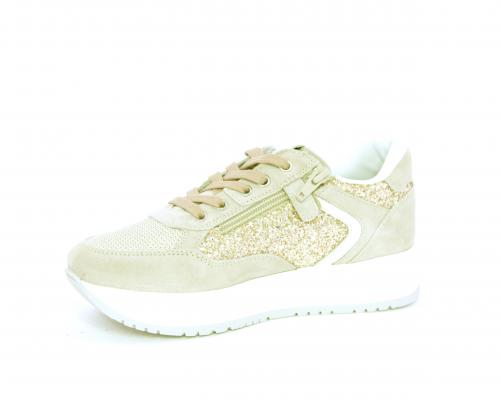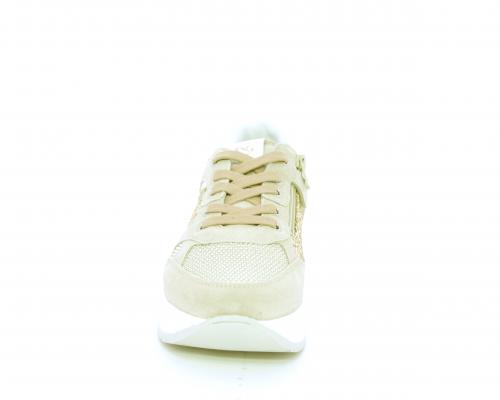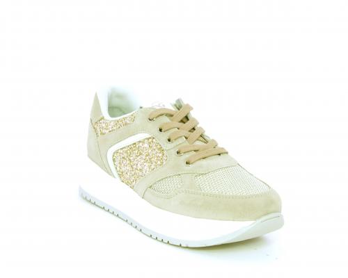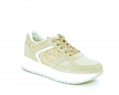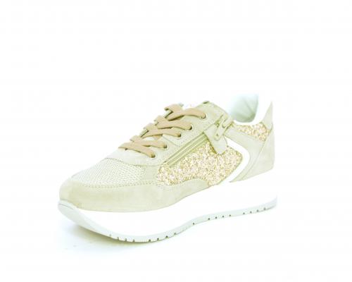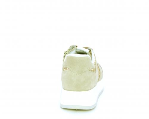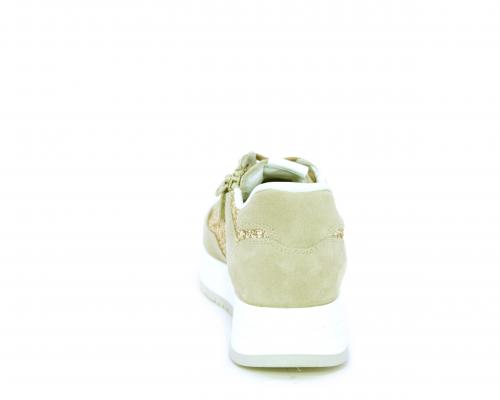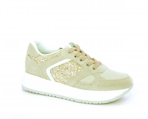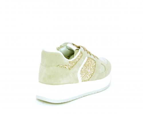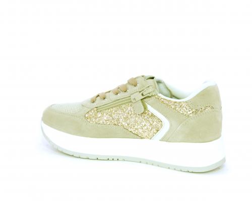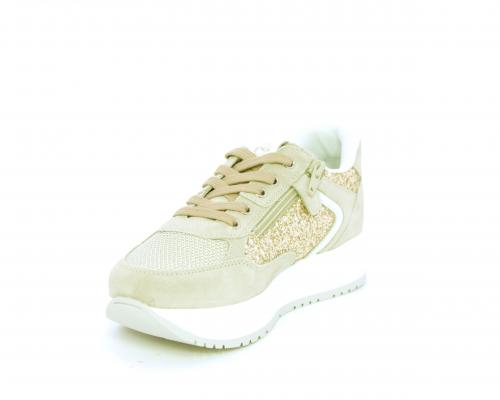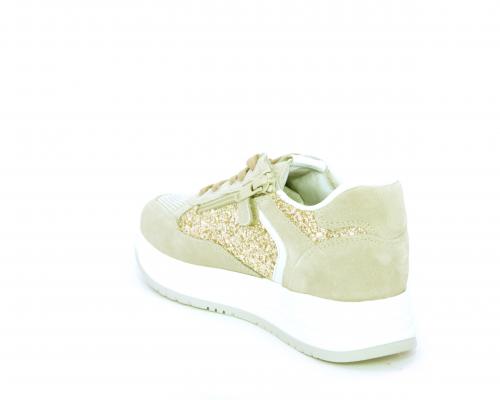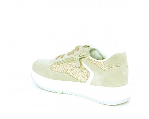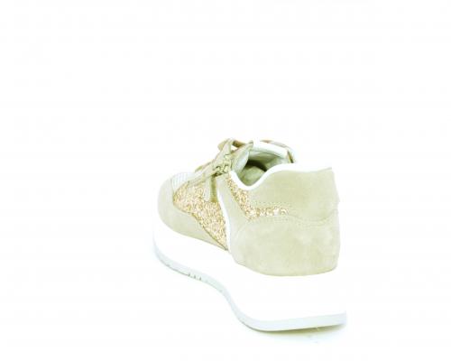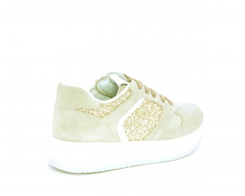 Sneakers allacciata con chiusura laterale per facilitare la calzata, tomaia in nabuk e tessuto con parti in lurex, nella parte intorno alla caviglia cuscinetto morbido in tessuto, sottopiede e fodera interna in pelle.