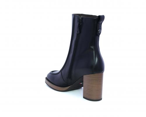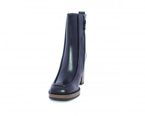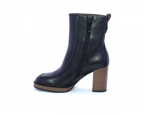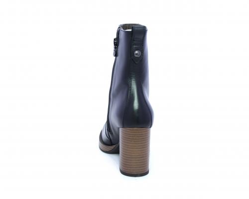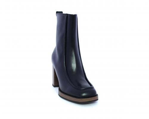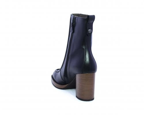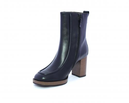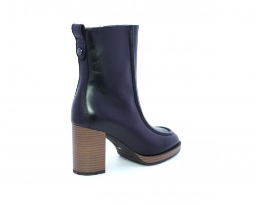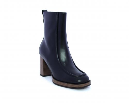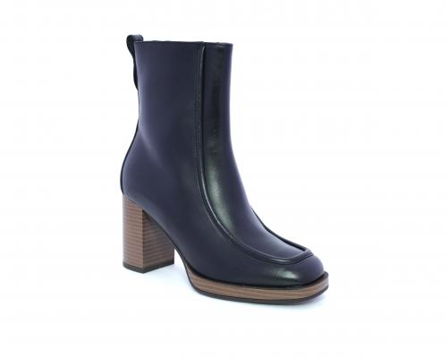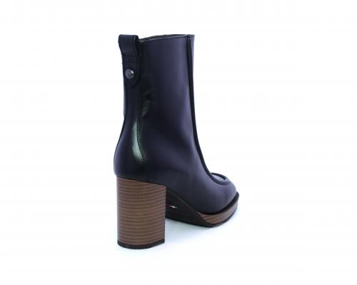Tronchetto in pelle stile ingegnere, con tacco largo e plateaux effetto legno, sottopiede e fodera interna in pelle, fusbet anatomico.