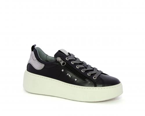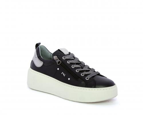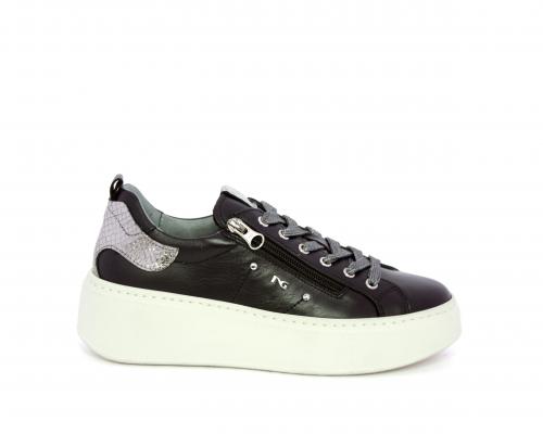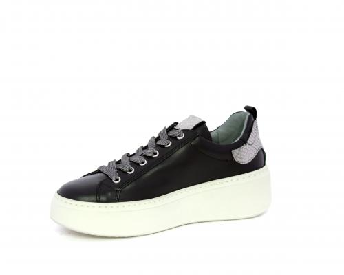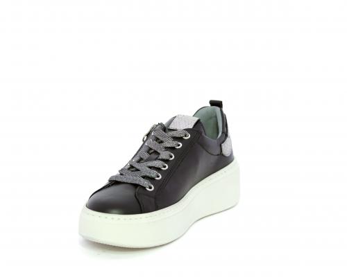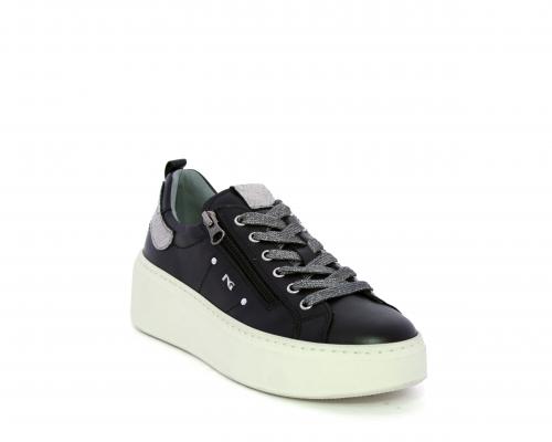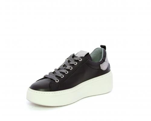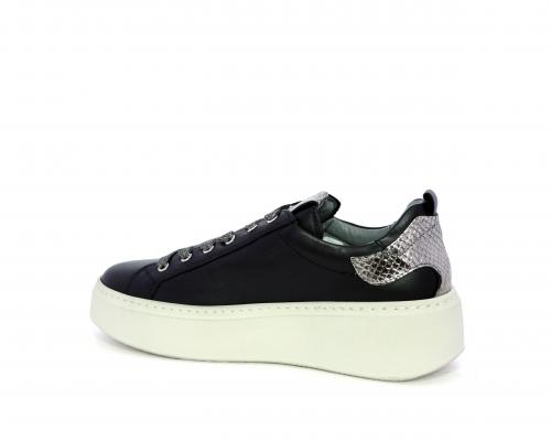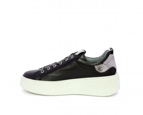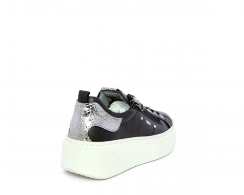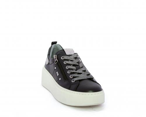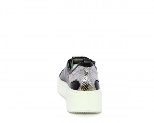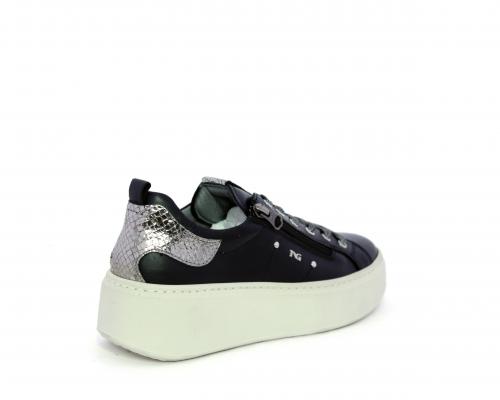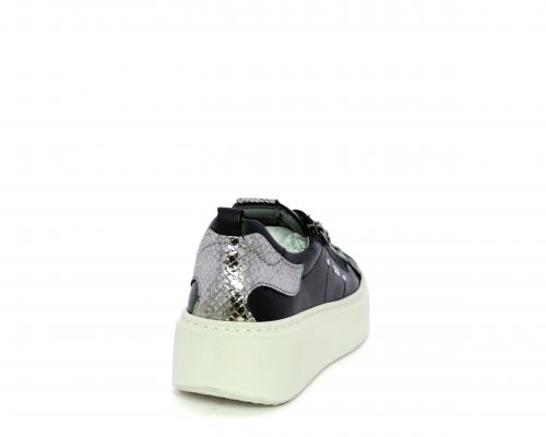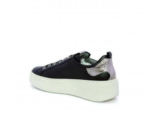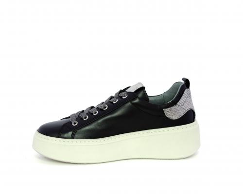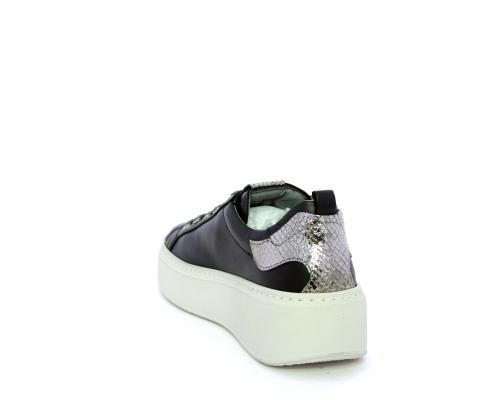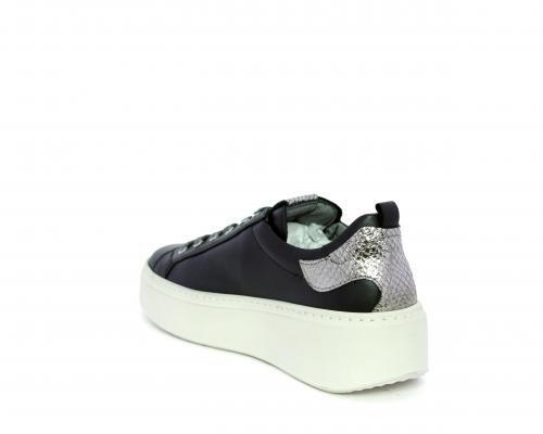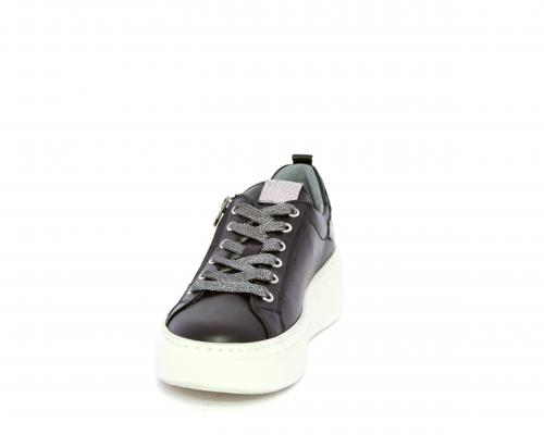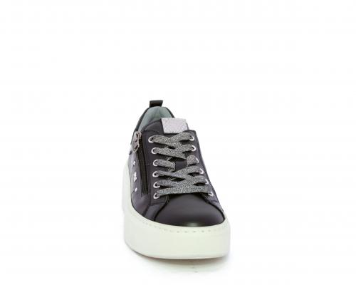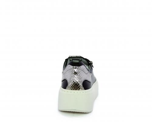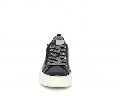 Sneakers allacciata con chisura laterale per facilitare la calzata, tomaia in pelle con rifiniture color acciaio, sottopiede e fodera interna in pelle, fusbet estraibile con sistema DryGo, che svolge una doppia azione assorbe l'umidità quando la scarpa è indossata e si asciuga rapidamente quando si toglie la calzatura.