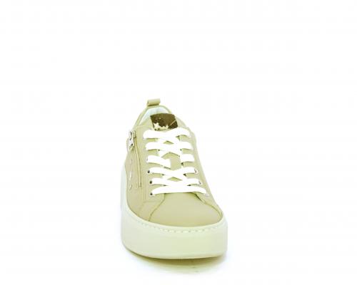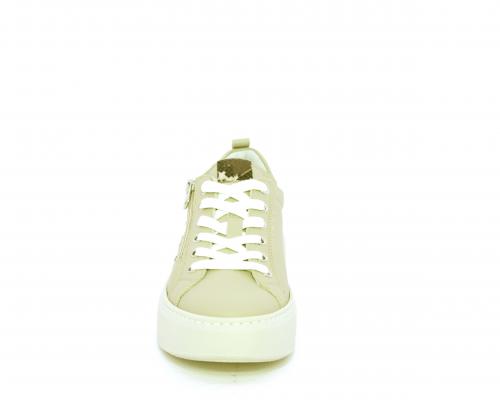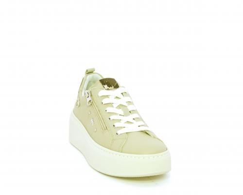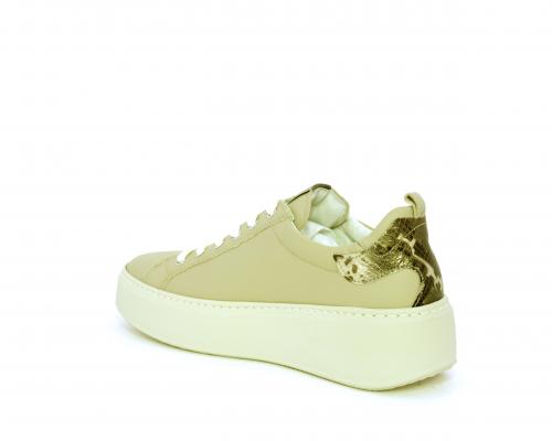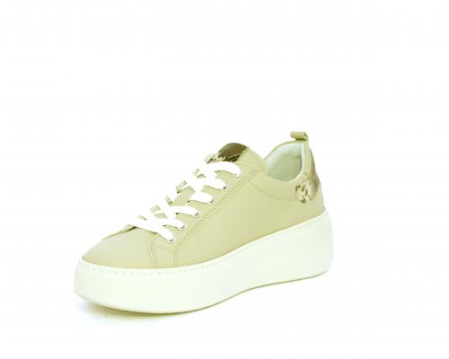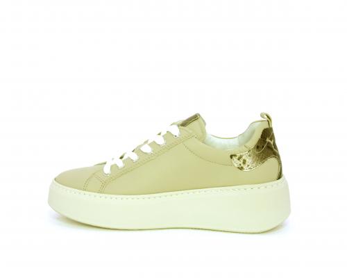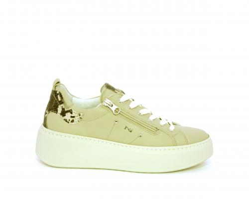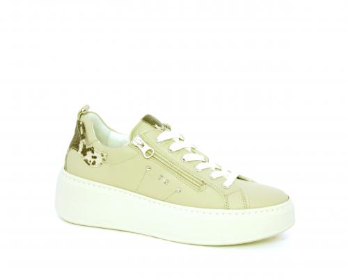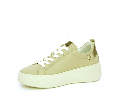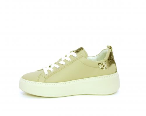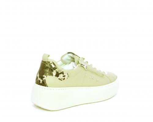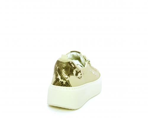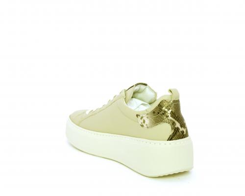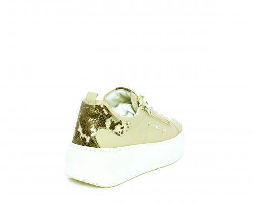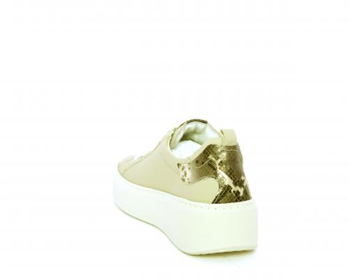 Sneakers allacciata con chisura laterale per facilitare la calzata, tomaia in pelle con rifiniture color acciaio e nella parte dietro al tallone inserto pitonato, sottopiede e fodera interna in pelle, fusbet estraibile con sistema DryGo, che svolge una doppia azione assorbe l'umidità quando la scarpa è indossata e si asciuga rapidamente quando si toglie la calzatura.
