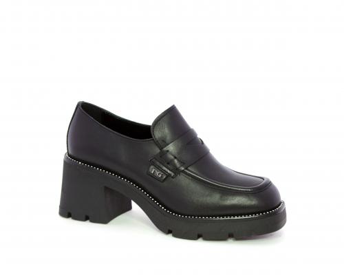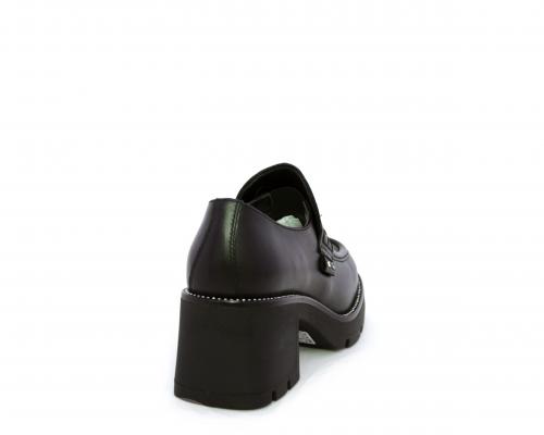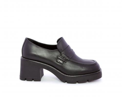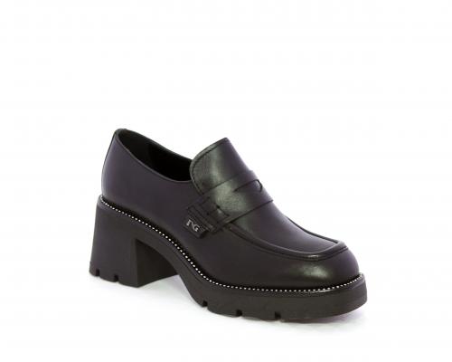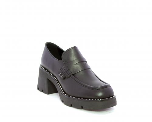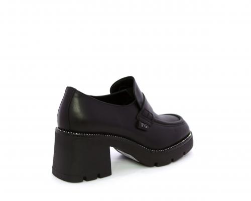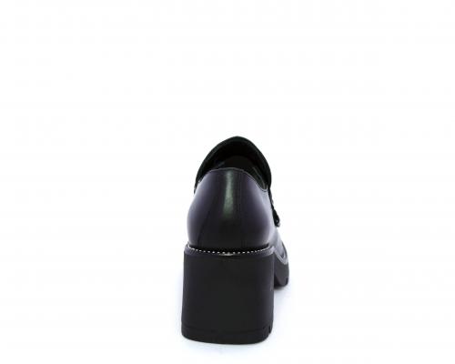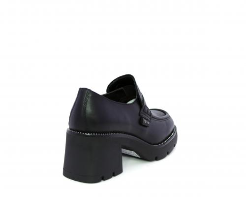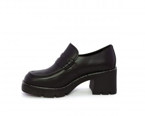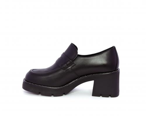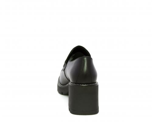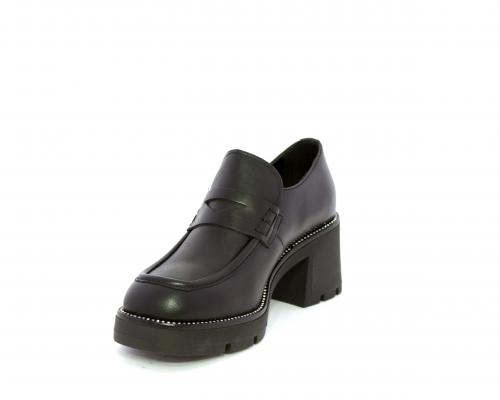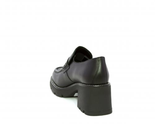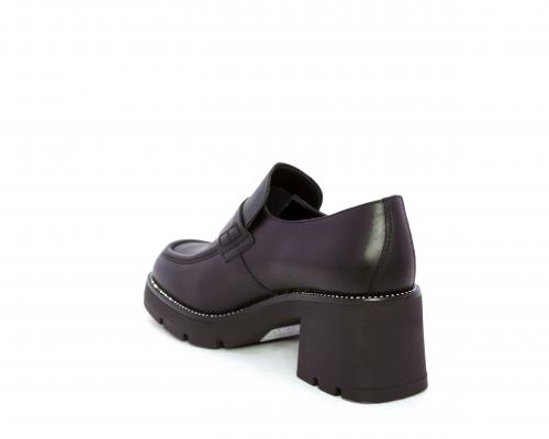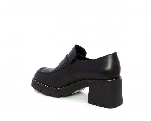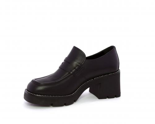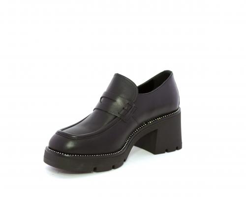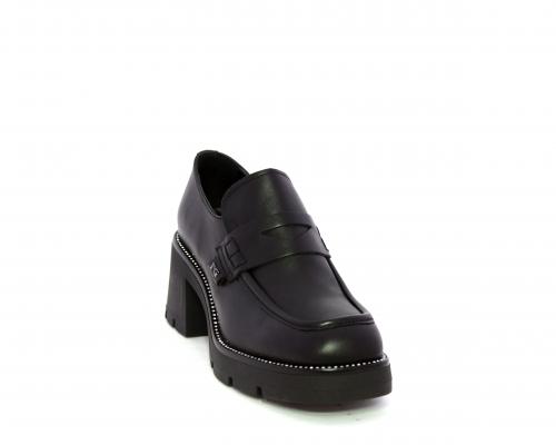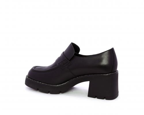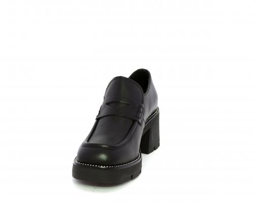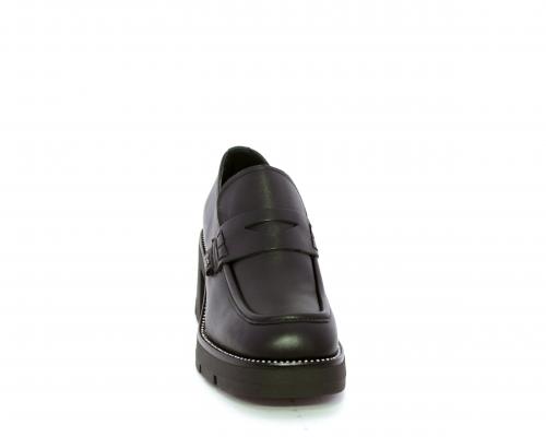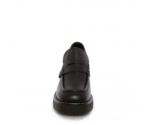 Mocassino in pelle, nella parte interna del collo del piede elestico per facilitare la calzata, banda di brillantini sul bordo superiore della gomma, sottopiede e fodera interna in pelle, fusbet anatomico.