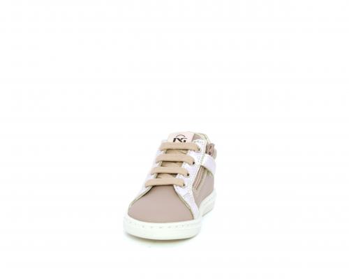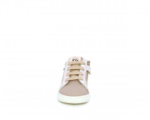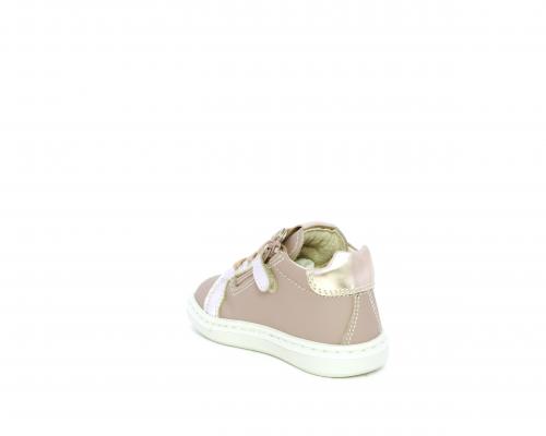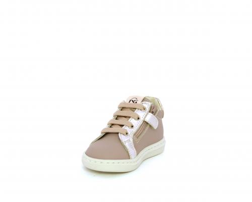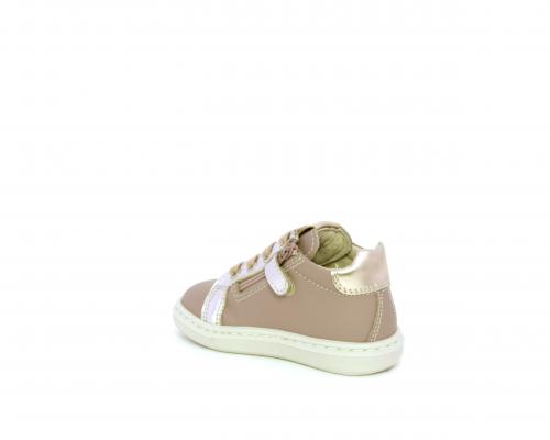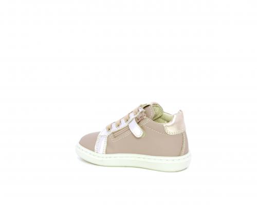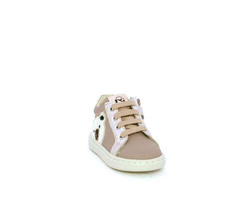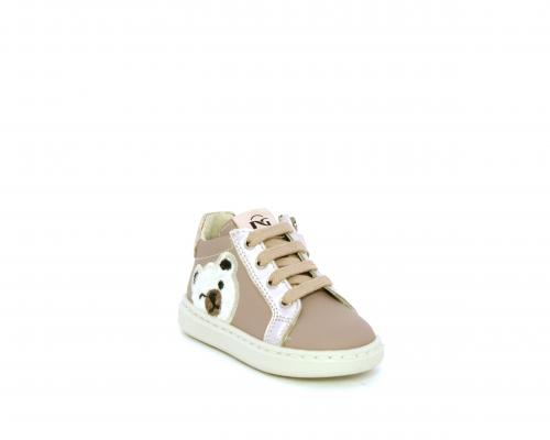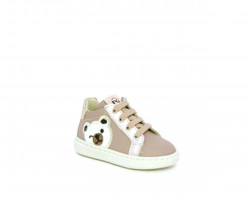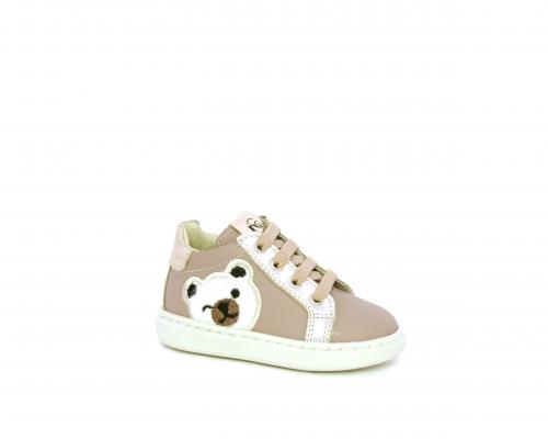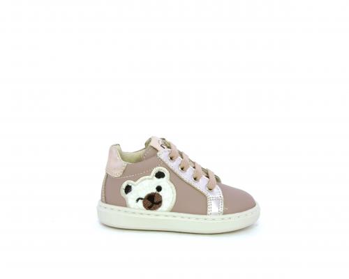 Sneakers primi passi con lacci e chiusura laterale per facilitare la calzata, tomaia in pelle con orsetto in tessuto nella parte laterale, sottopiede e fodera interna in pelle, fusbet estraibile.
