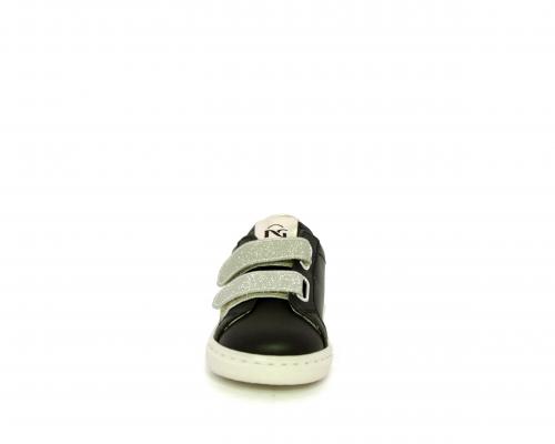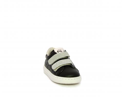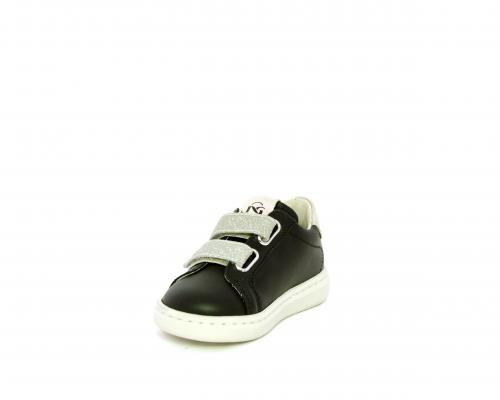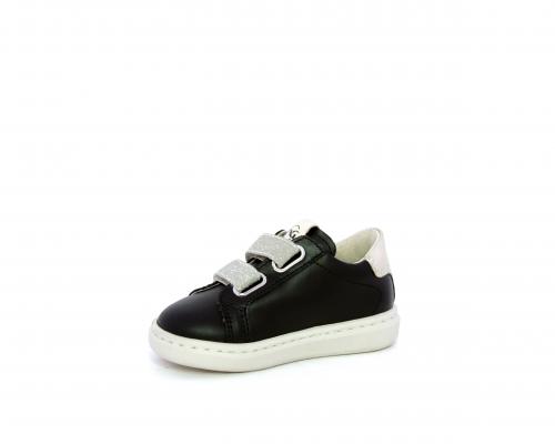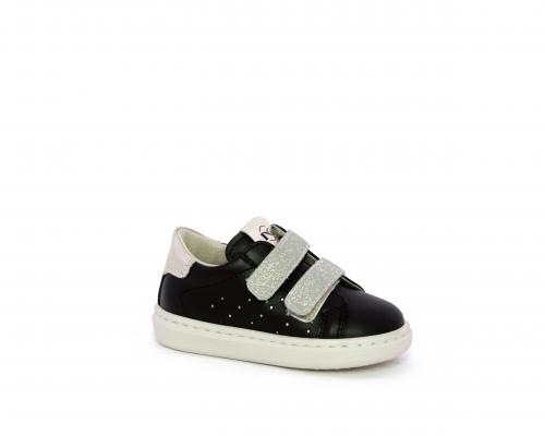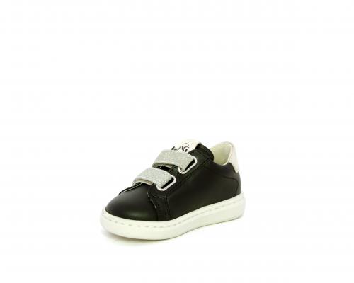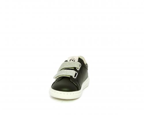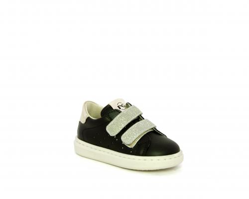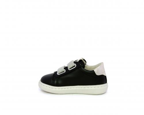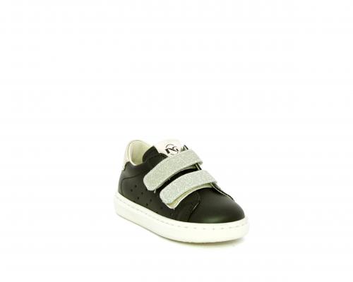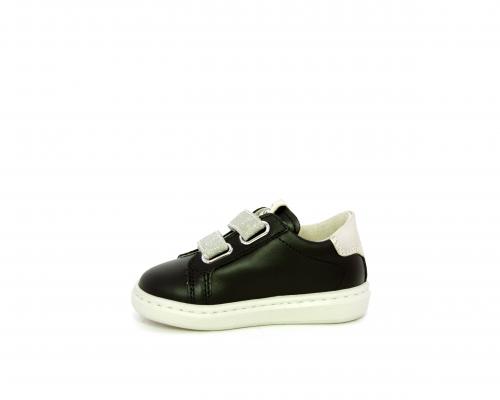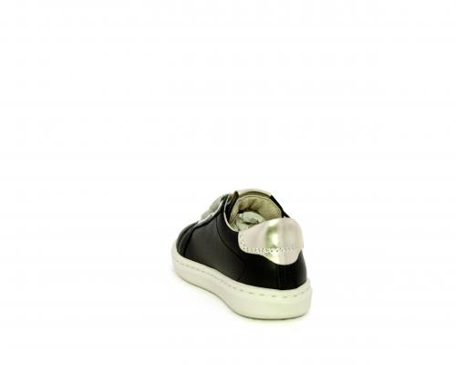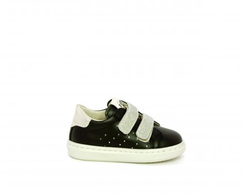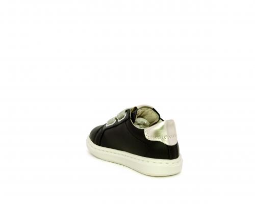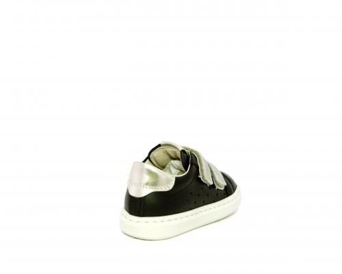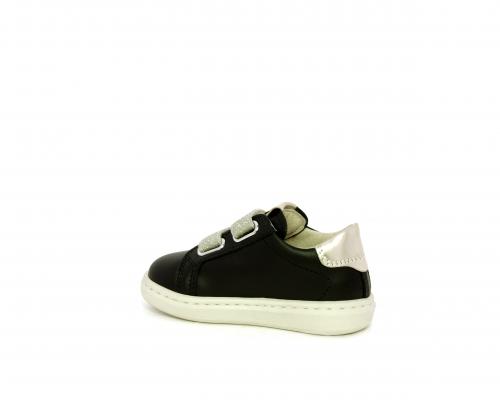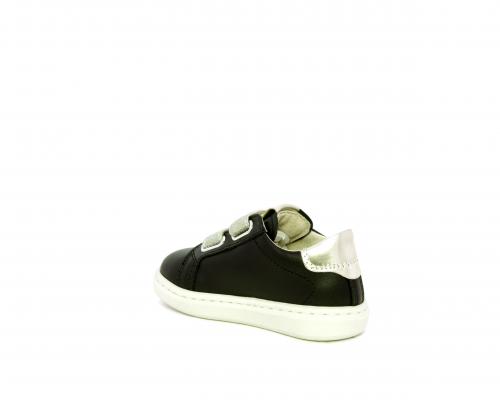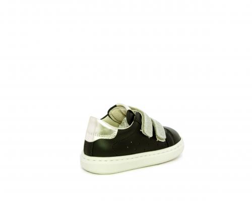 Sneakers in pelle con doppio velcro in lurex, rifiniture color platino, sottopiede e fodera interna in pelle, fusbet estraibile.