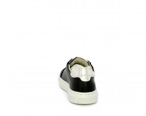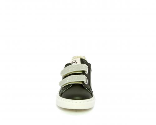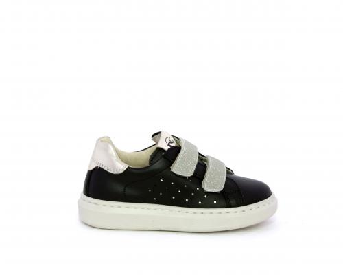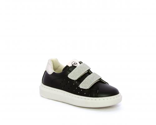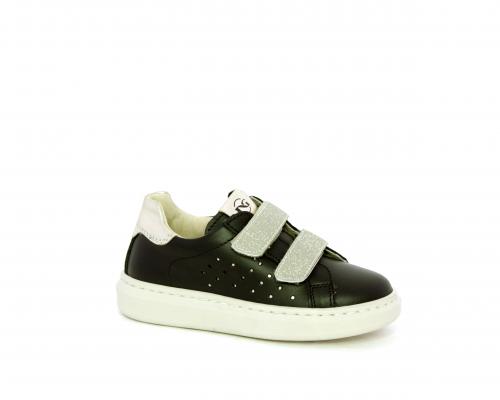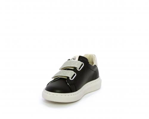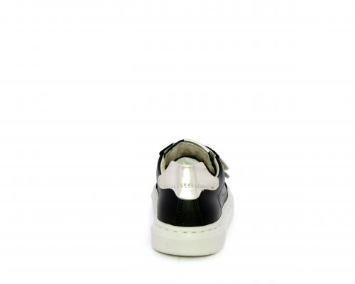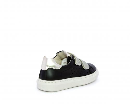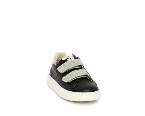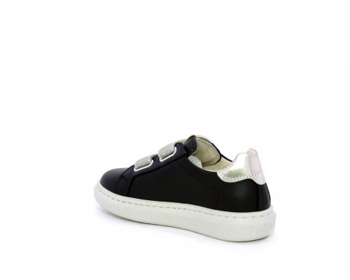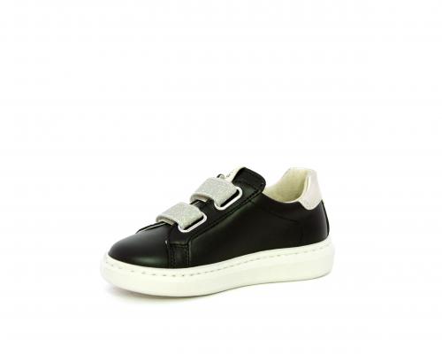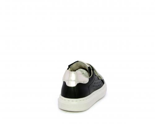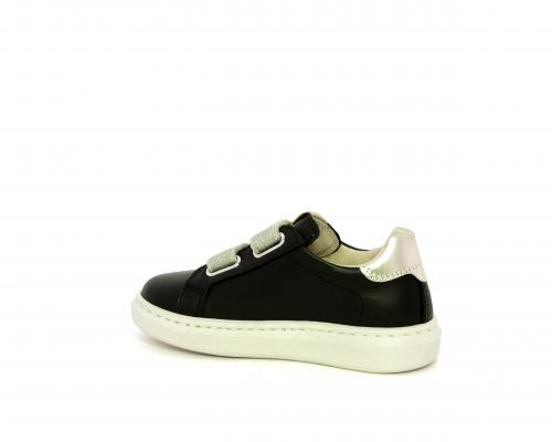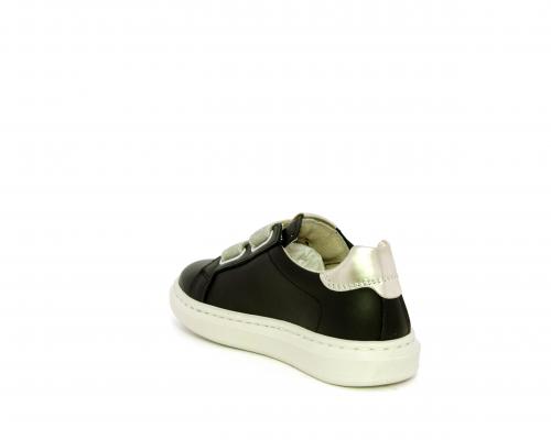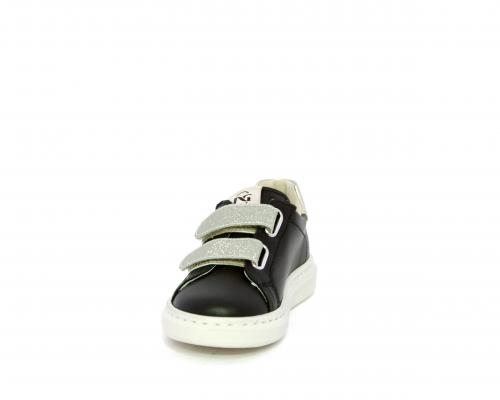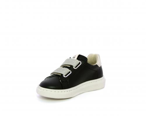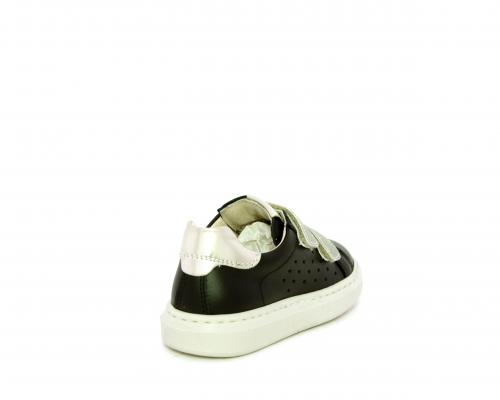 Sneakers in pelle con doppio velcro in lurex, rifiniture color platino, sottopiede e fodera interna in pelle, fusbet estraibile.