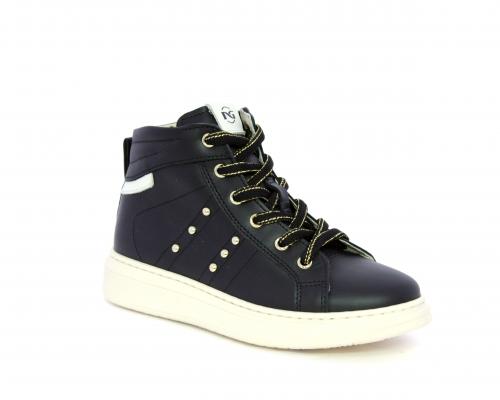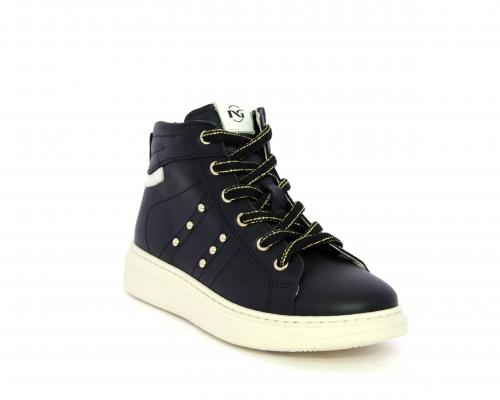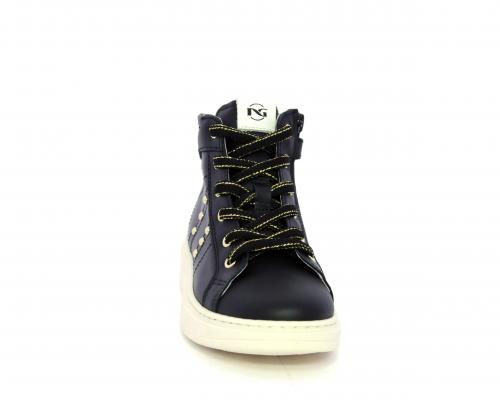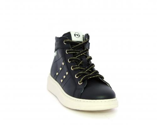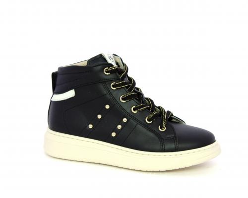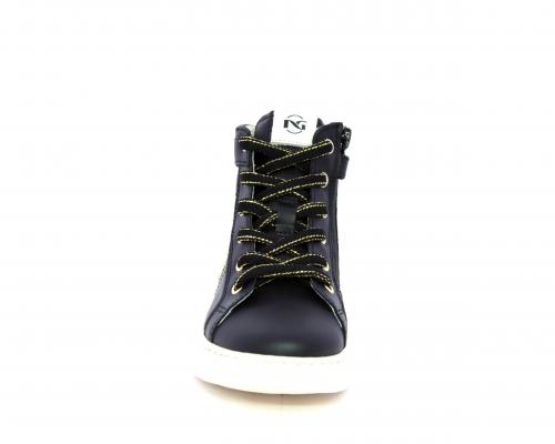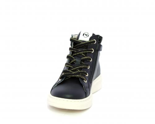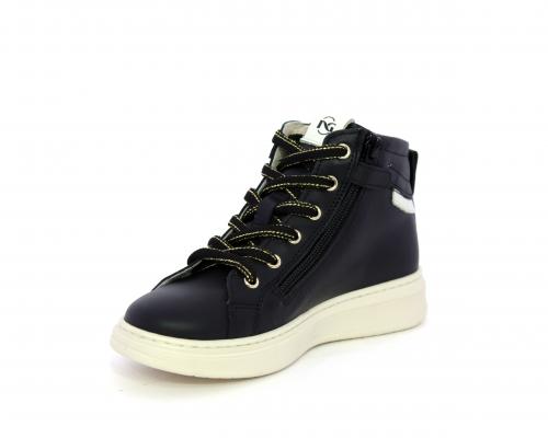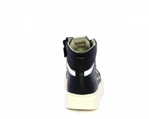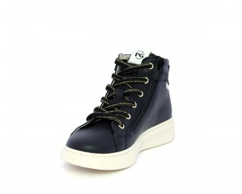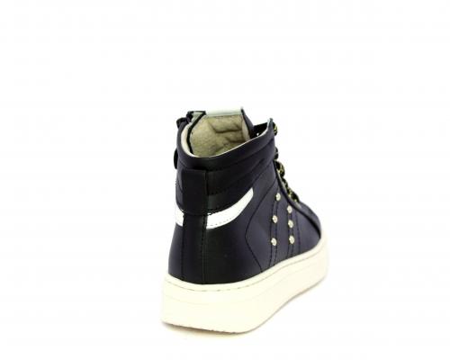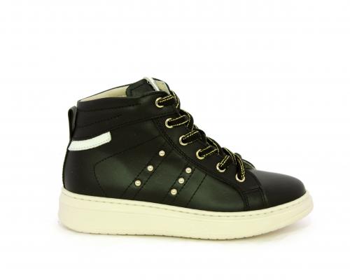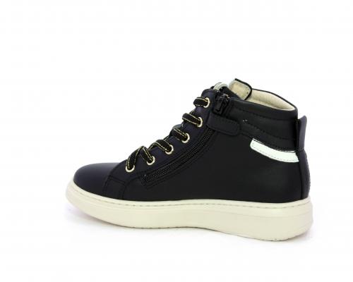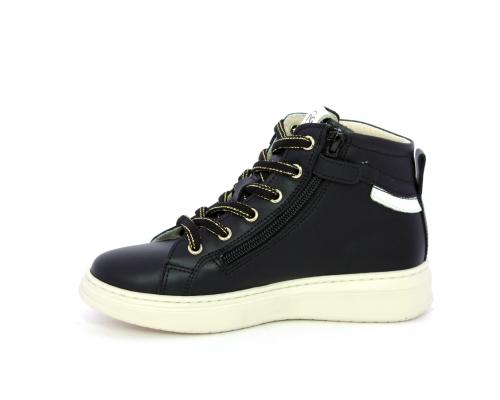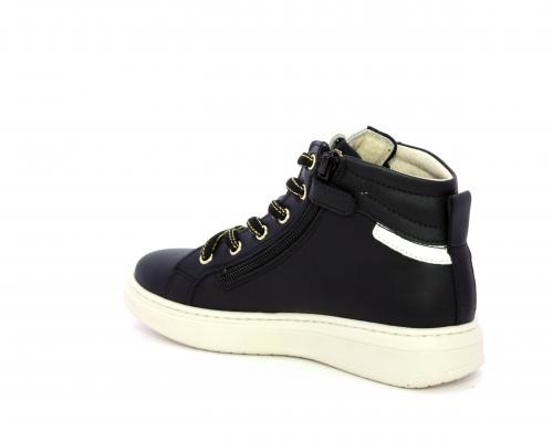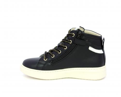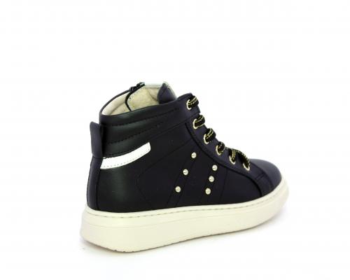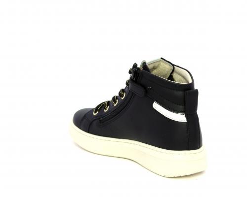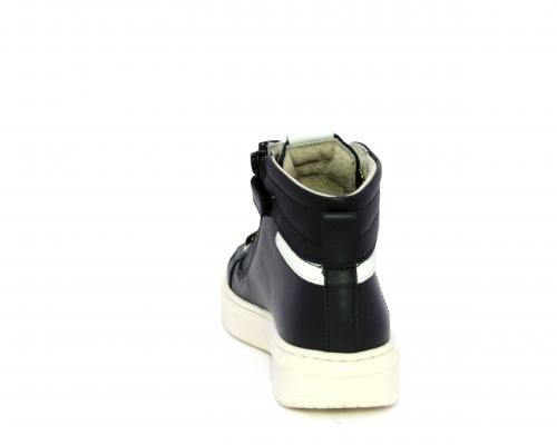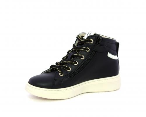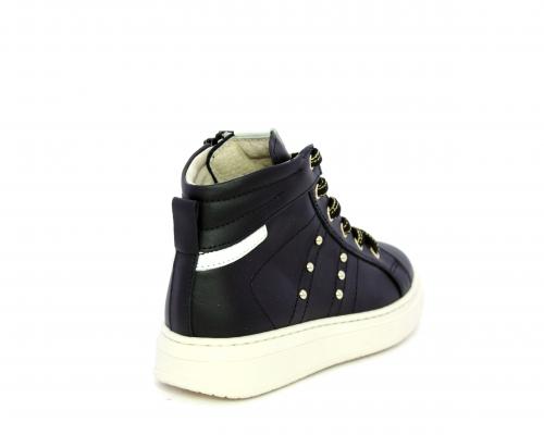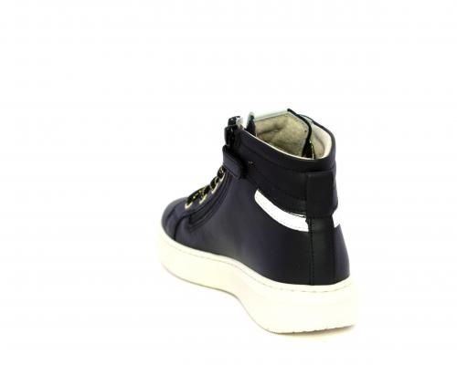Sneakers in pelle alta alla caviglia con lacci e chiusura laterale per facilitare la calzata, rifiniture color platino, sottopiede e fodera interna in pelle, fusbet estraibile.