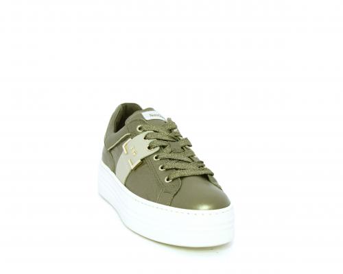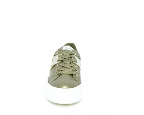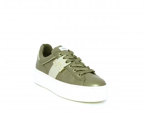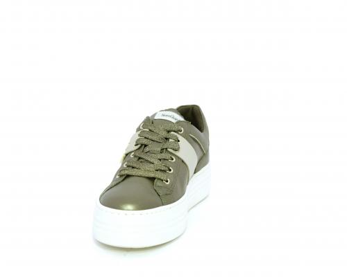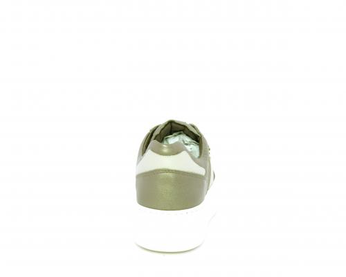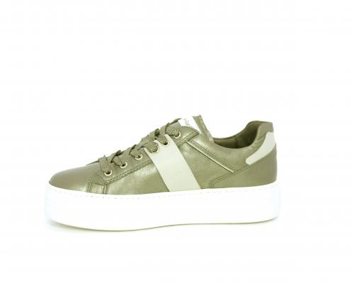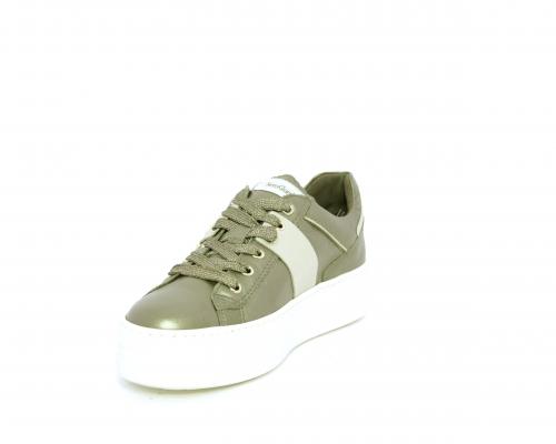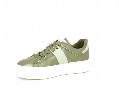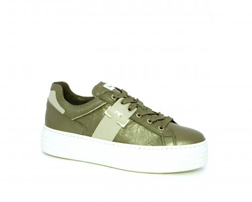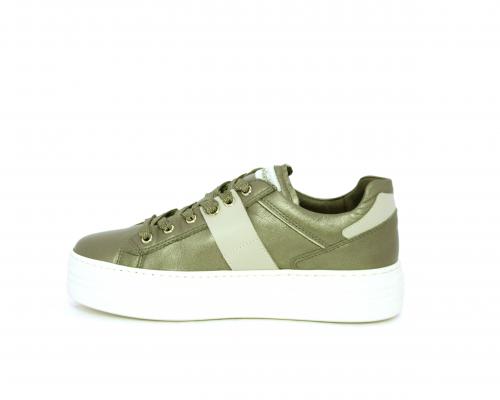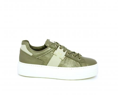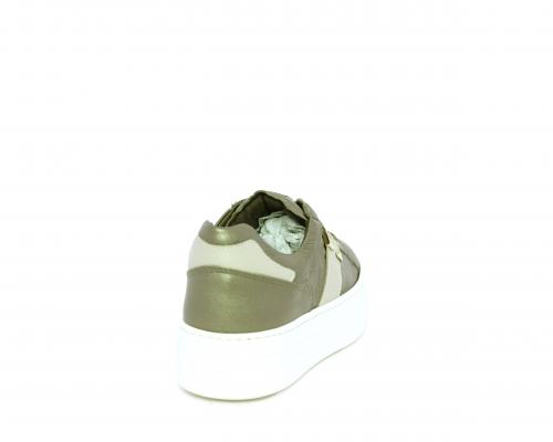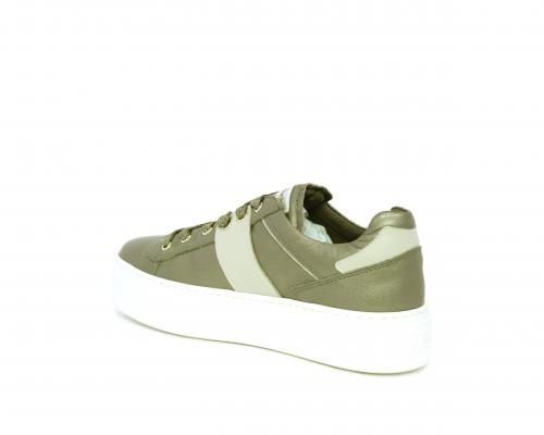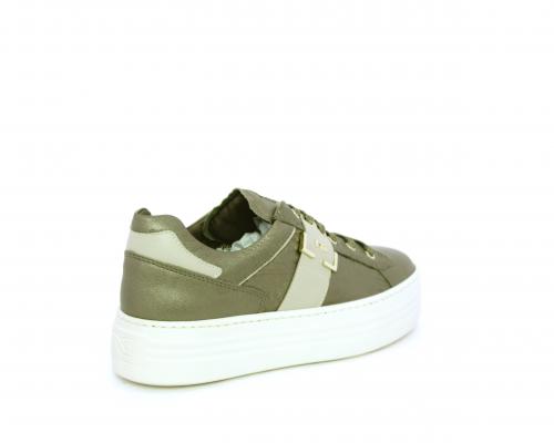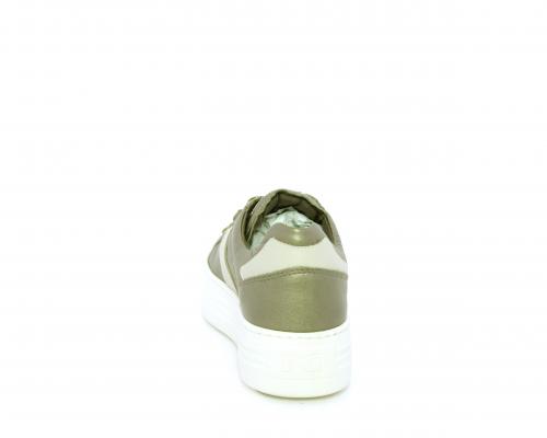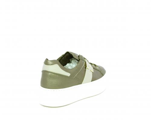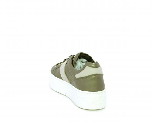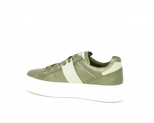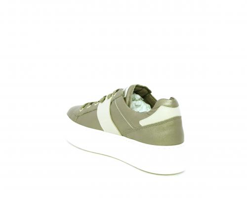 Sneakers allacciata con platform alto, tomaia in pelle con banda laterale in pelle e rifiniture color oro , sottopiede e fodera interna in pelle, fusbet estraibile con sistema DryGo, che svolge una doppia azione assorbe l'umidità quando la scarpa è indossata e si asciuga rapidamente quando si toglie la calzatura.