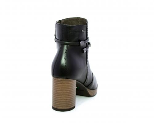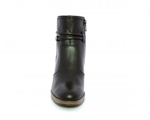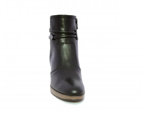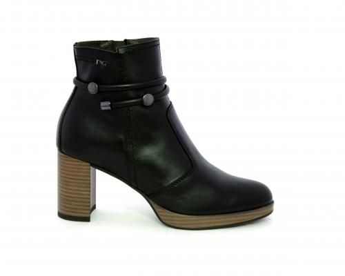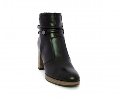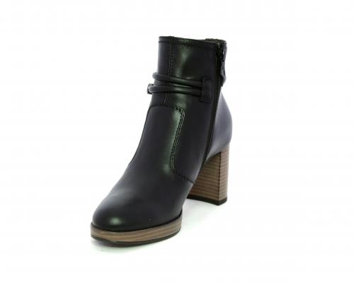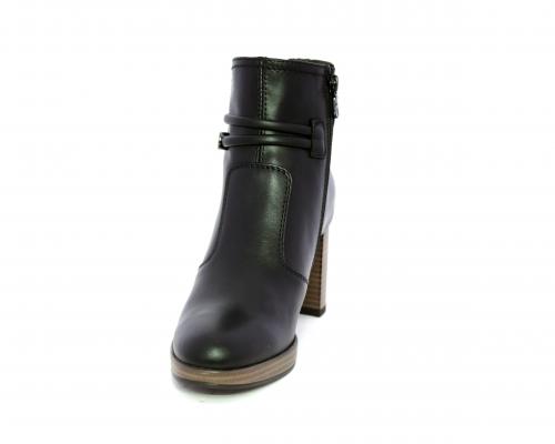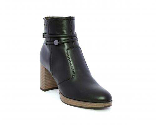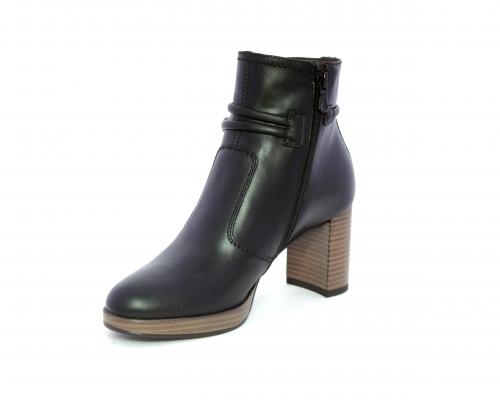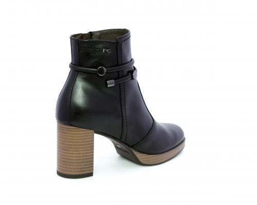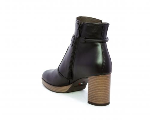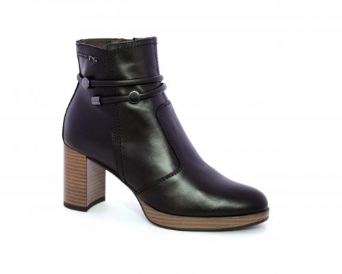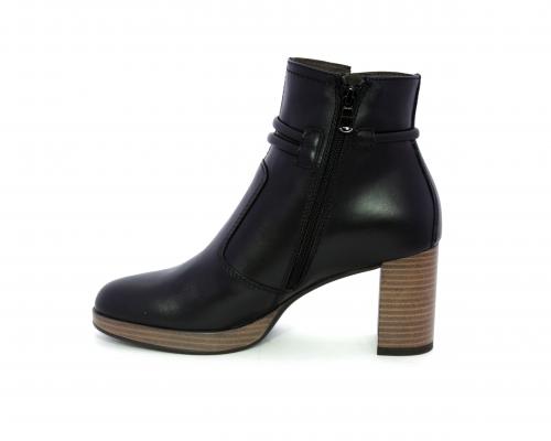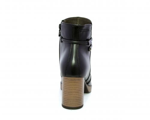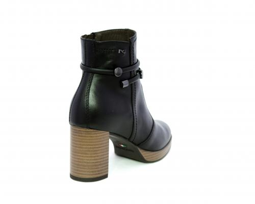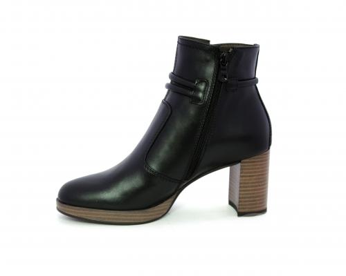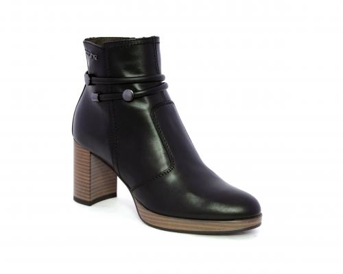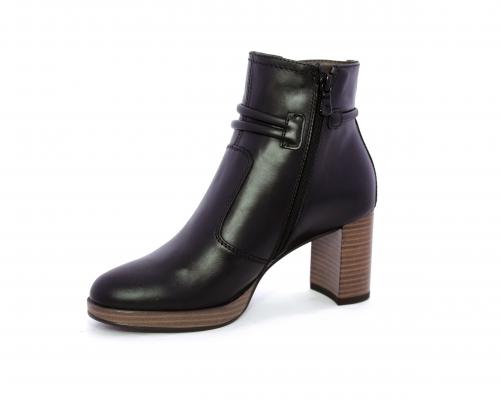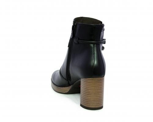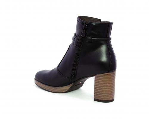 Tronchetto in pelle, tacco largo e plateaux con effetto legno, chiusura laterale, sottopiede e fodera interna in pelle, fusbet con memory.
