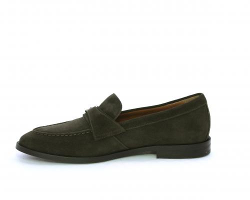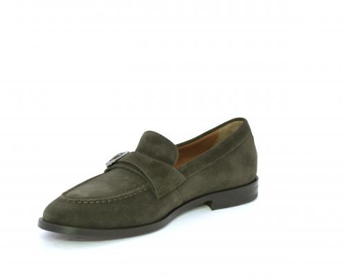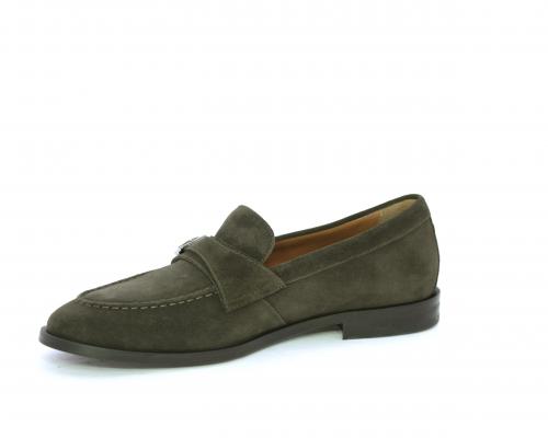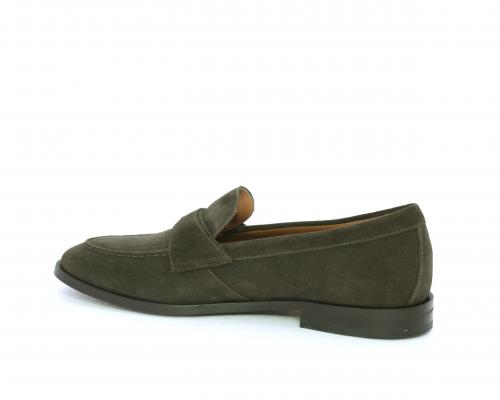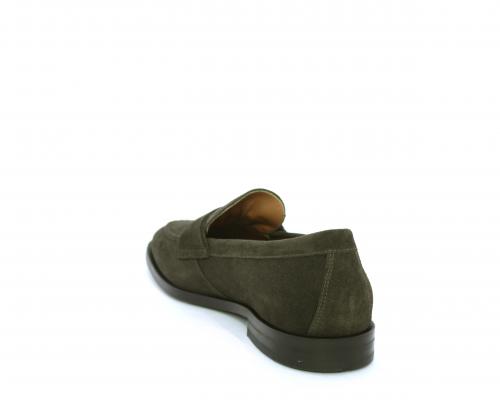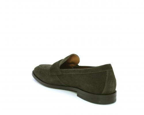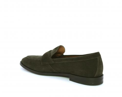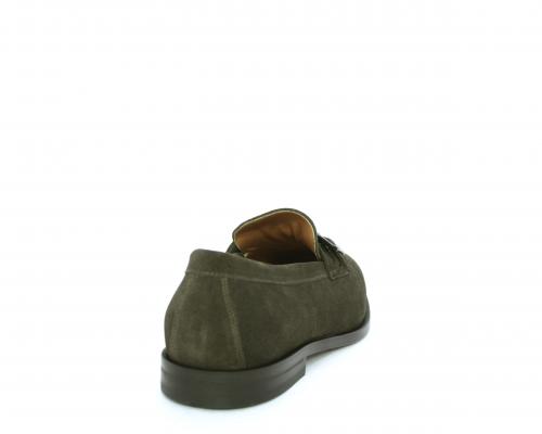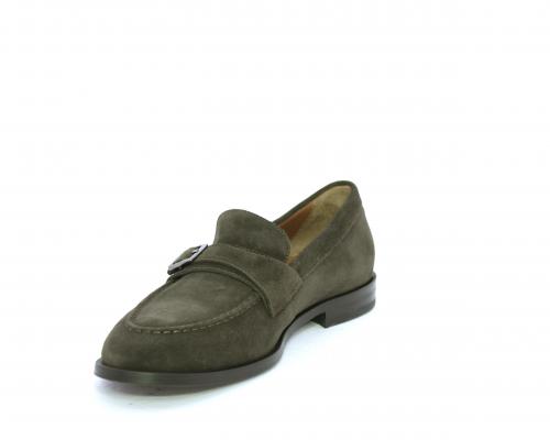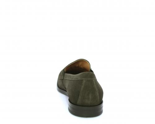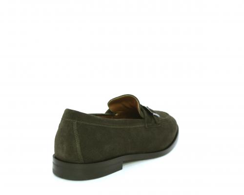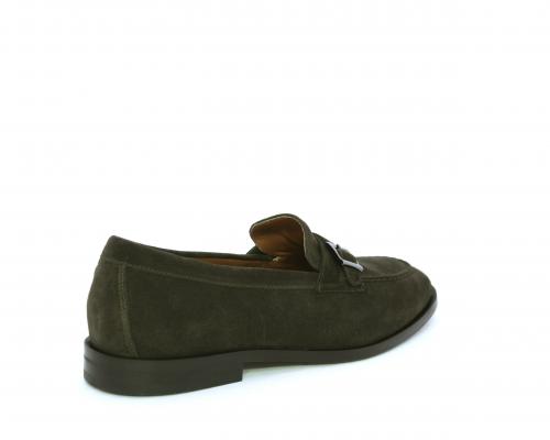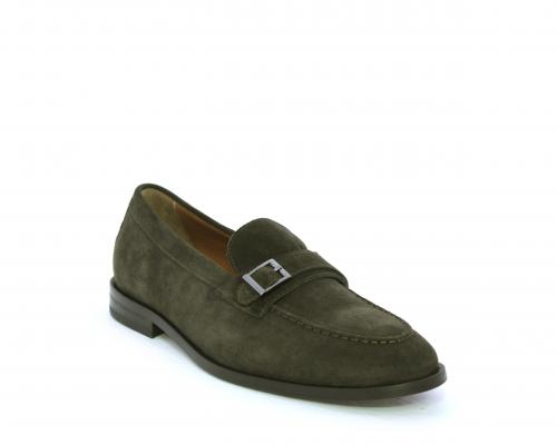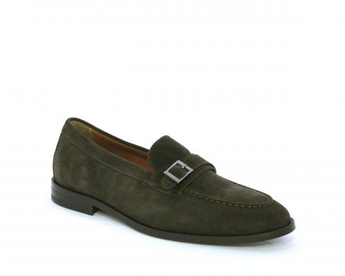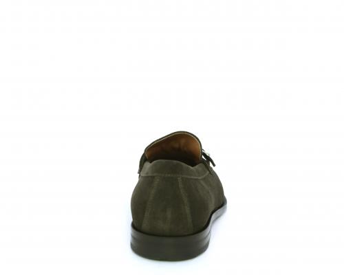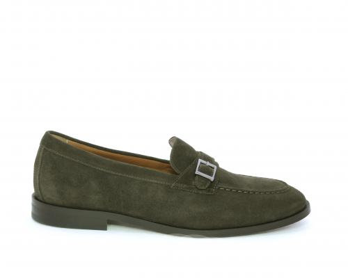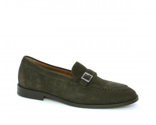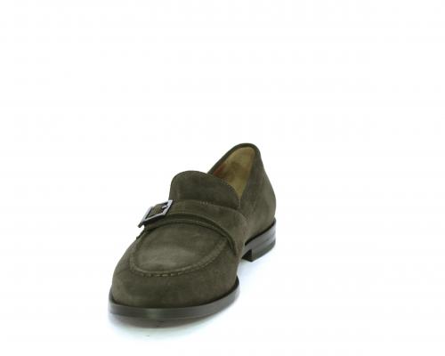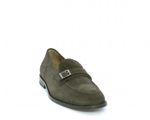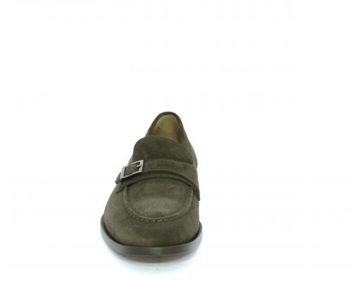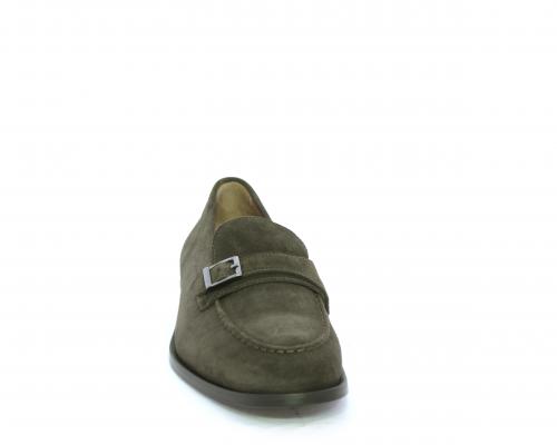 Mocassino in camoscio con fibbia regolabile sul collo del piede, fondo cuoio con mezza soletta in gomma, sottopiede e fodera interna in pelle.