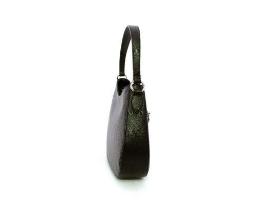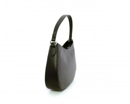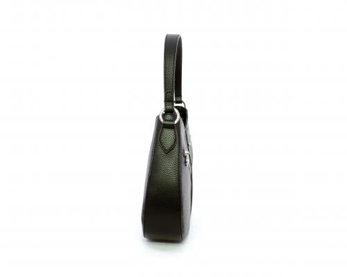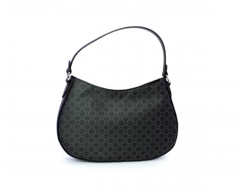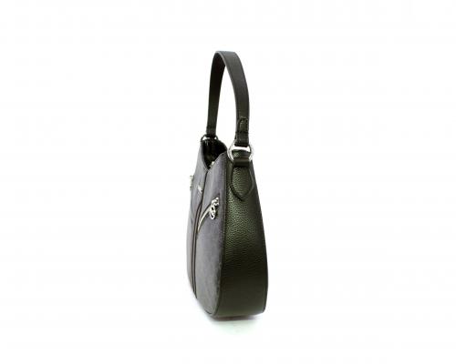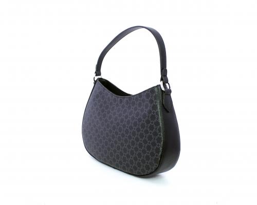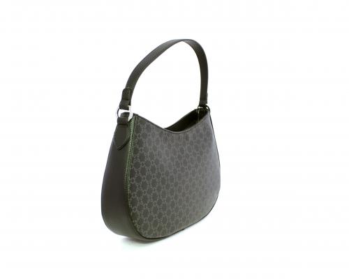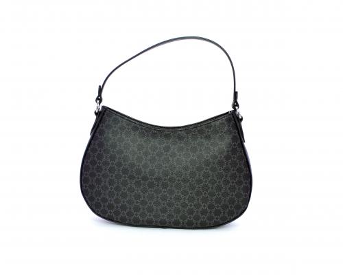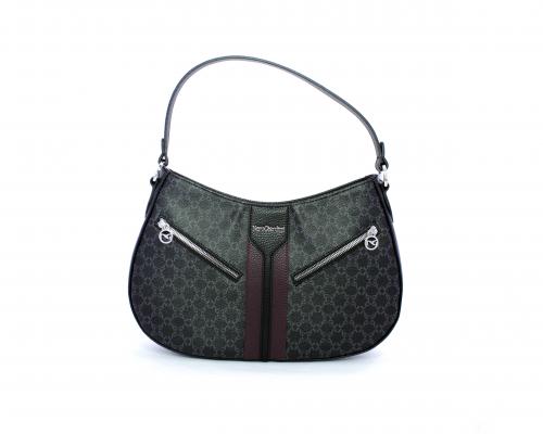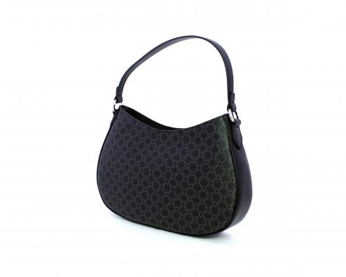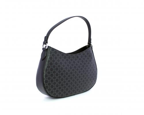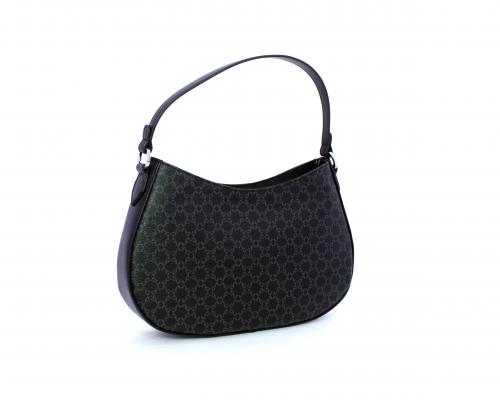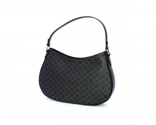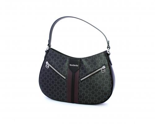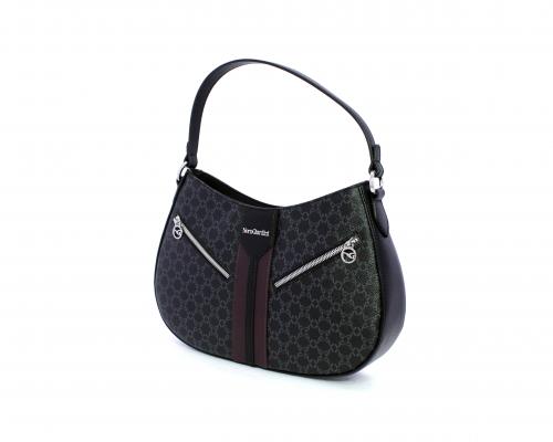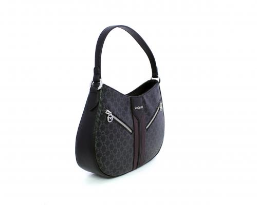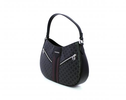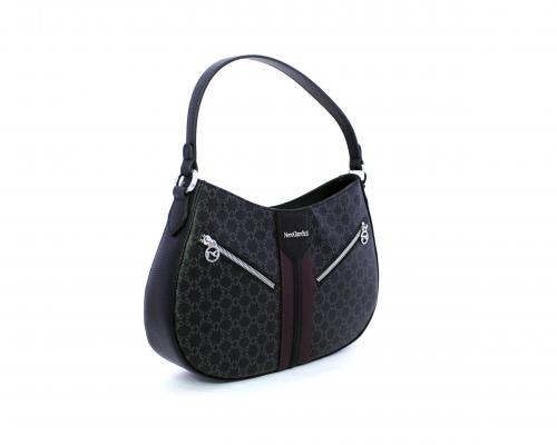Borsa monospalla a forma di mezzaluna in pelle stampata, manico in pelle e possibilità di aggiungere la tracolla in pelle e regolabile, nella parte frontale banda centrale in pelle bordò con due taschini trasversali chiusi con zip, chiusura della borsa con zip, fodera interna in tessuto.