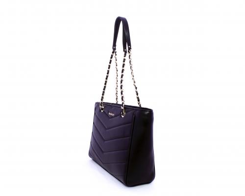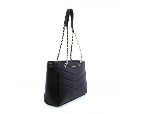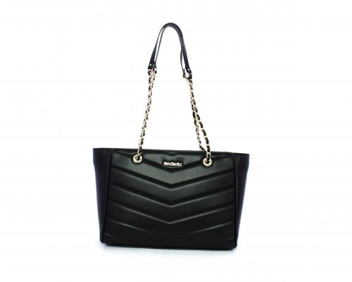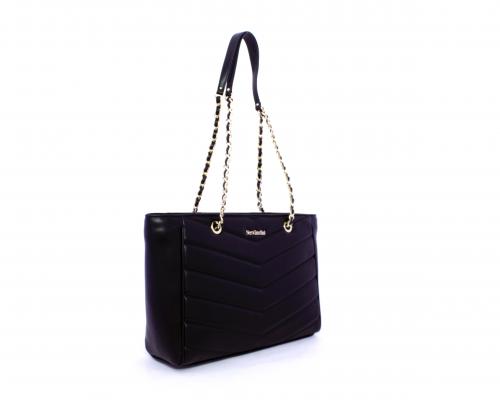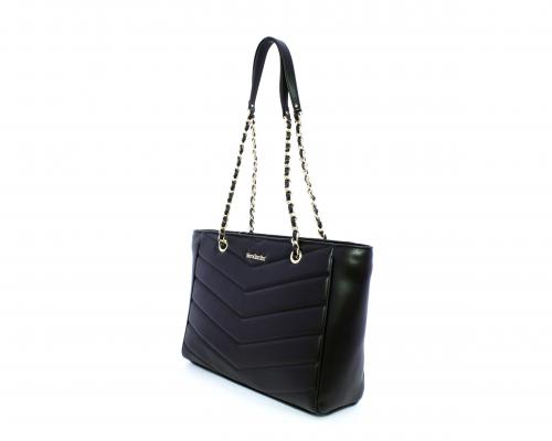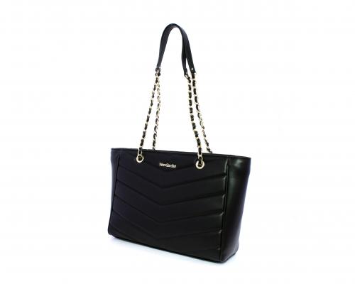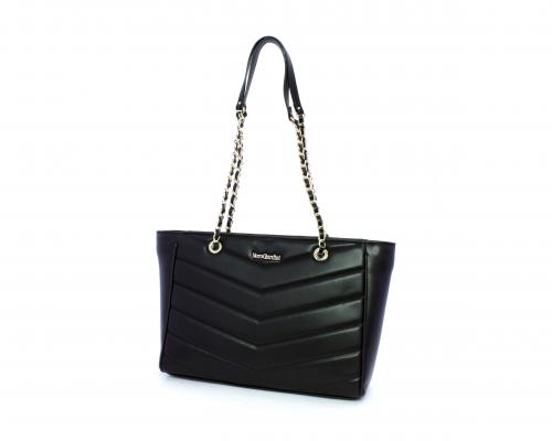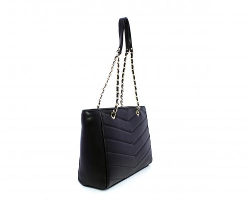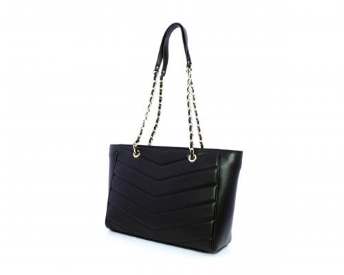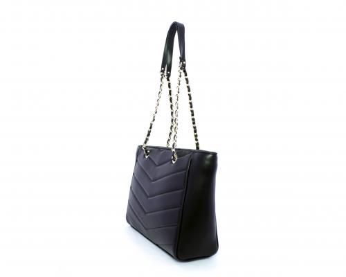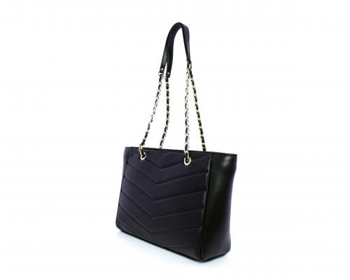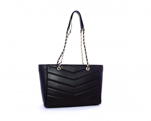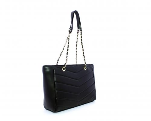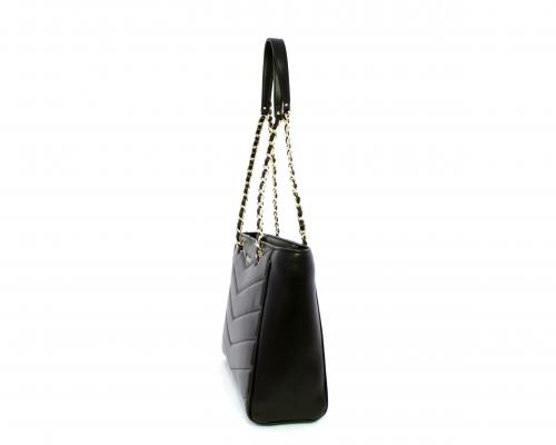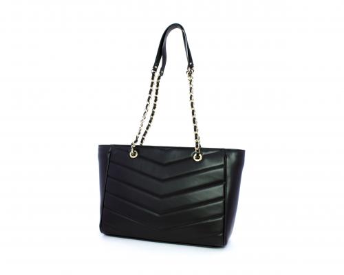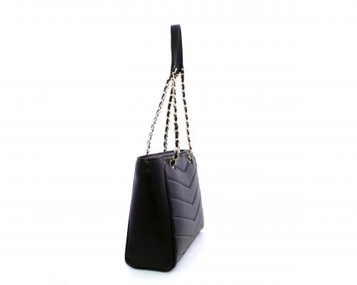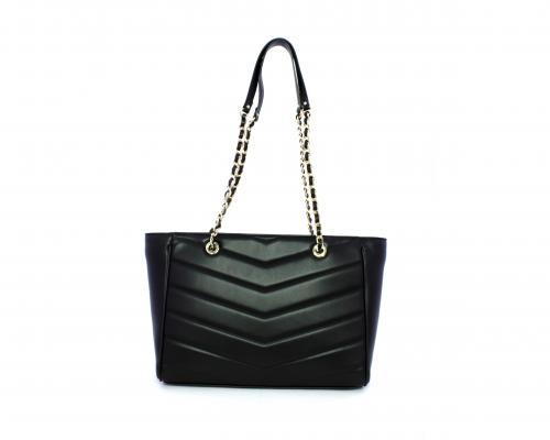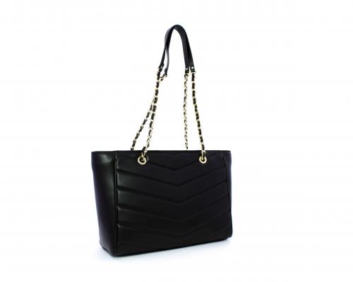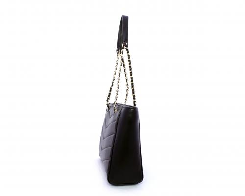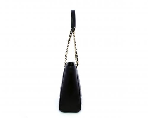 Borsa shopping in pelle trapuntata, doppio manico lungo formato per metà in pelle e metà in catena, rifiniture color oro, chiusura della borza con zip, fodera interna in tessuto.