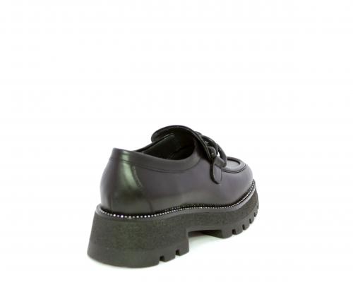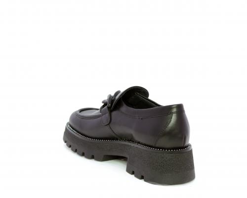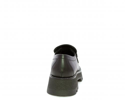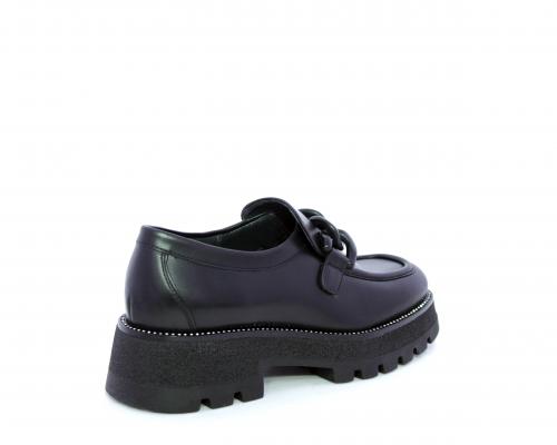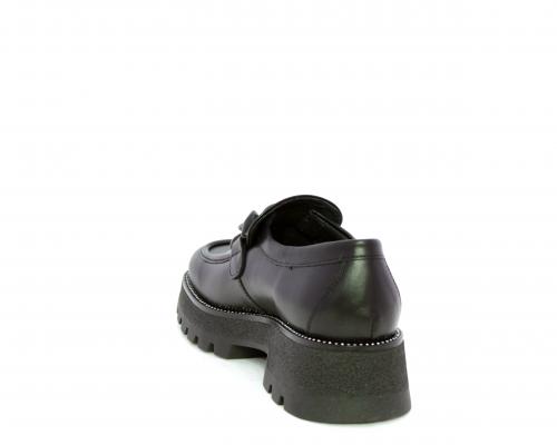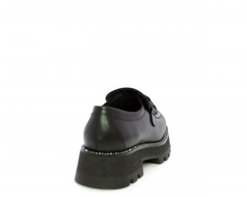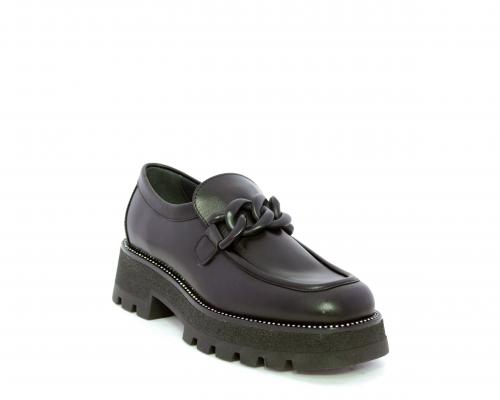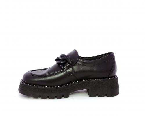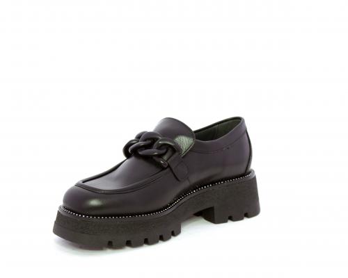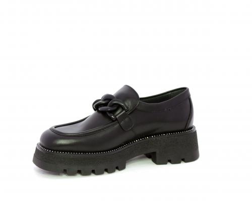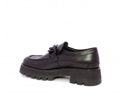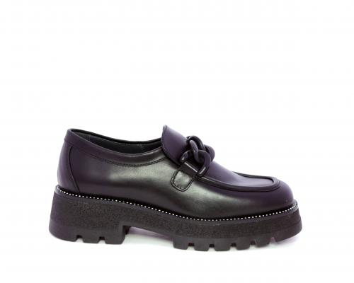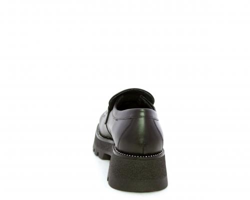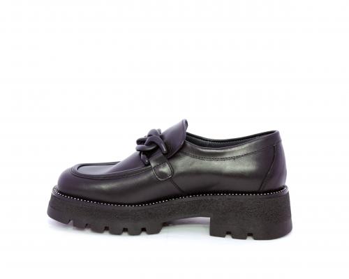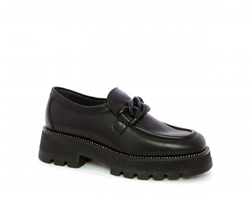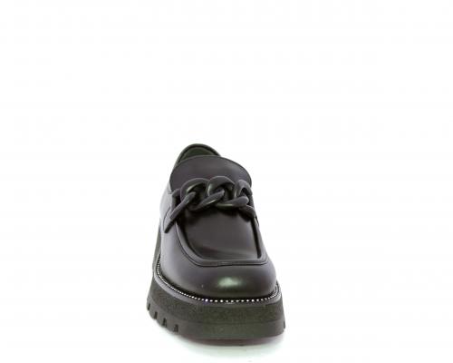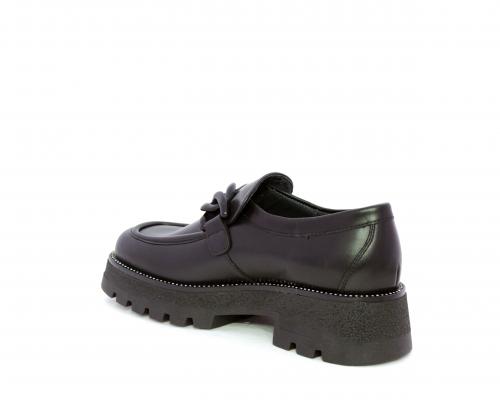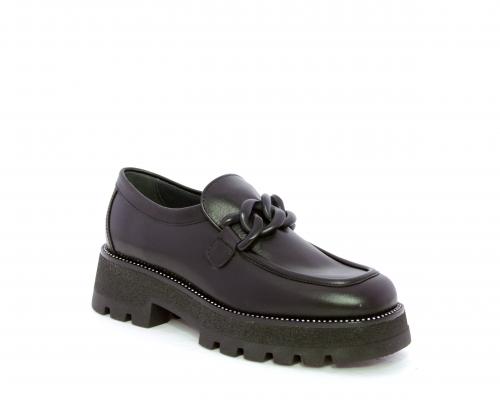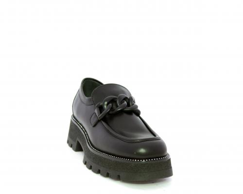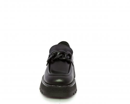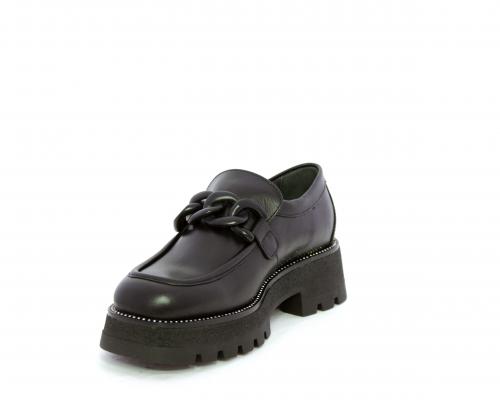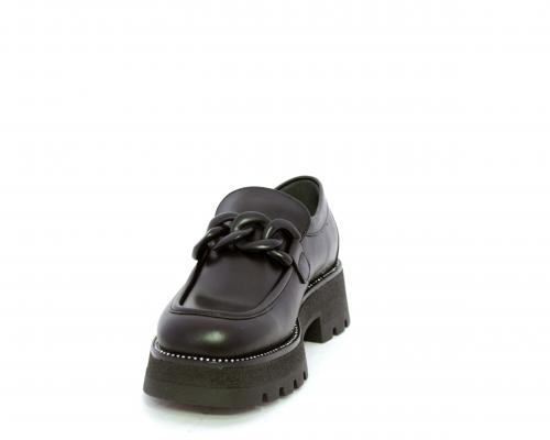 Mocassino in pelle con catena nera sul collo del piede, nella parte interna del collo del piede elestico per facilitare la calzata, banda di brillantini sul bordo superiore della gomma, sottopiede e fodera interna in pelle, fusbet anatomico.
