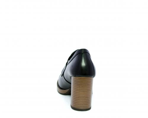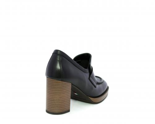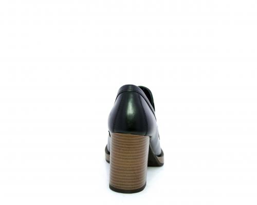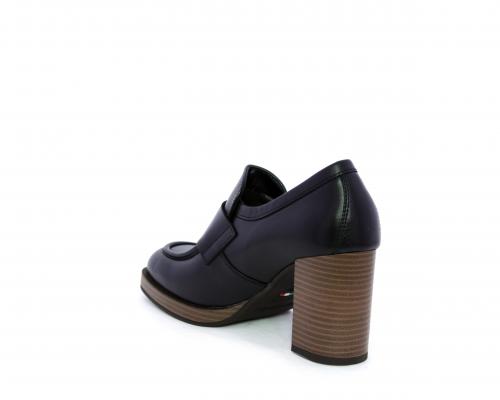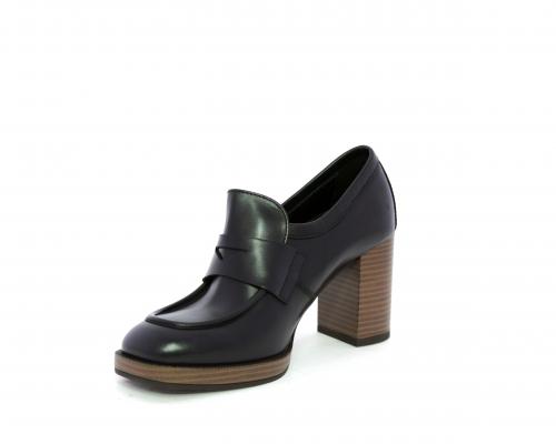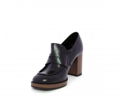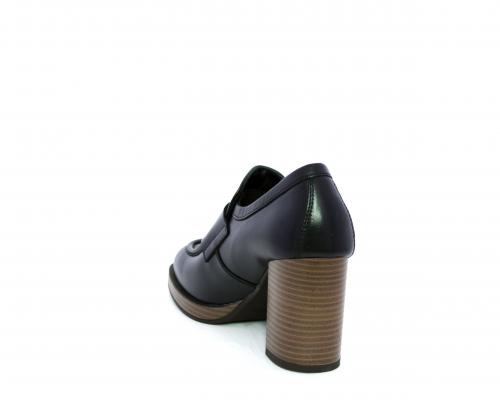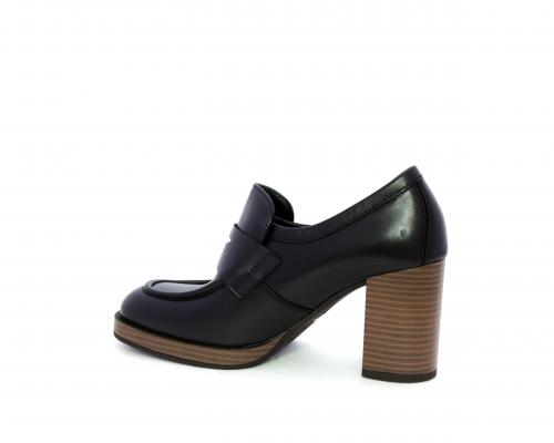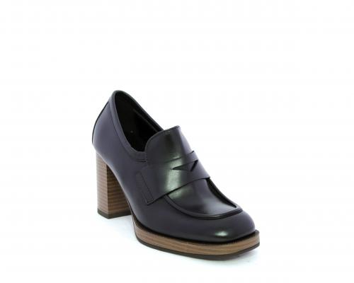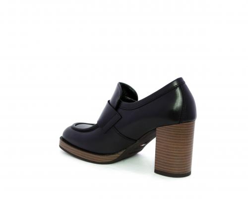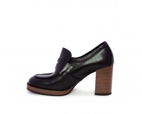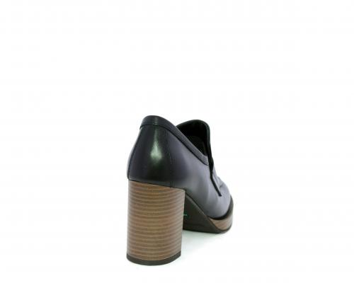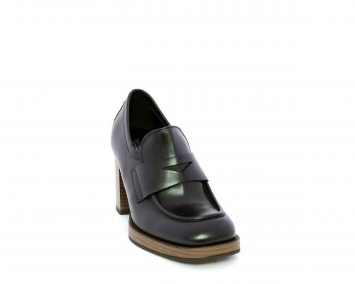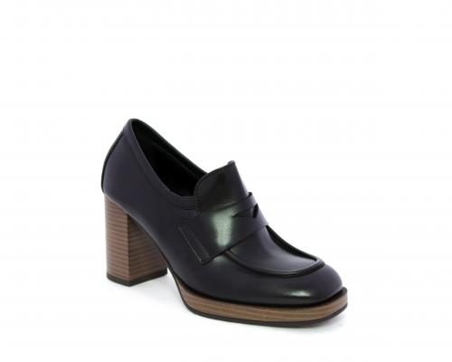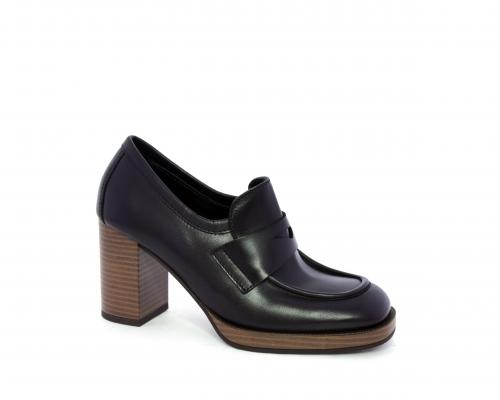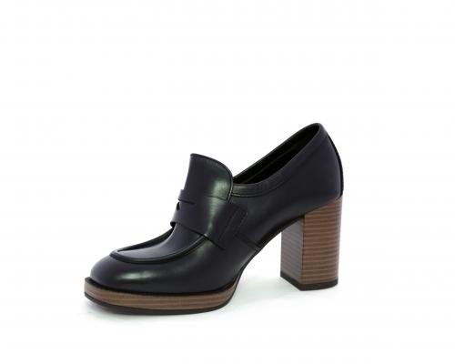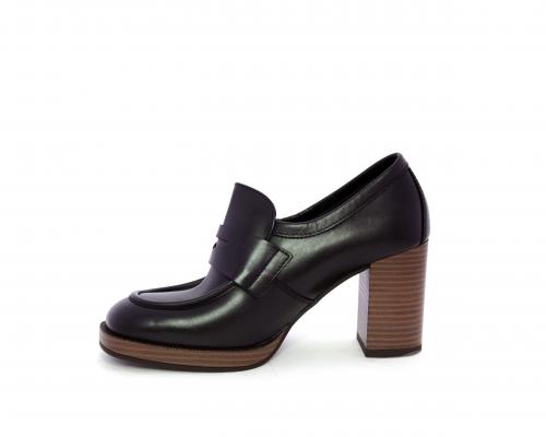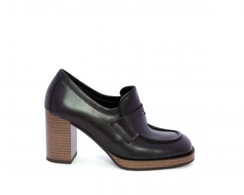 Mocassino in pelle con tacco largo e plateaux effetto finto legno, sottopiede e fodera interna in pelle, fusbet con memory.
