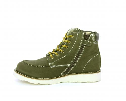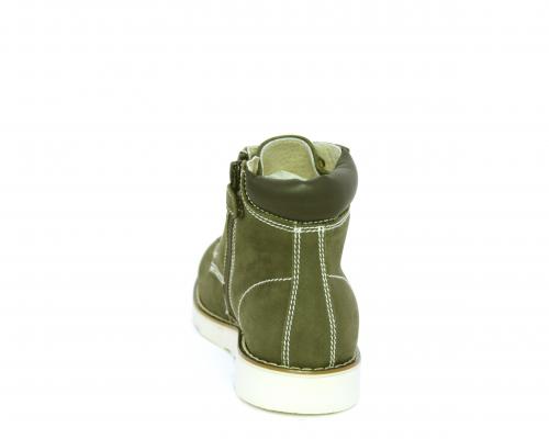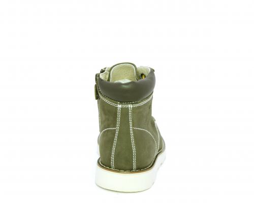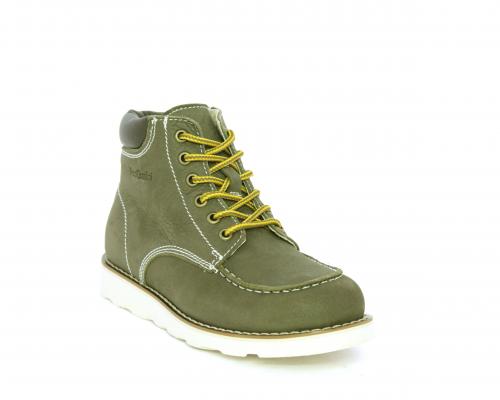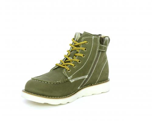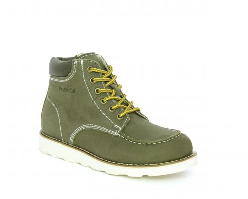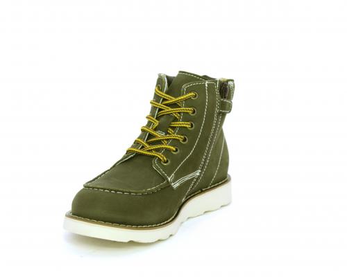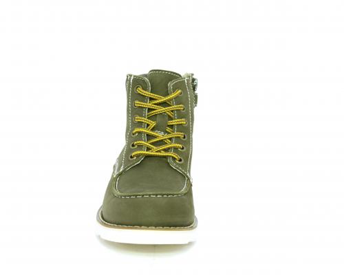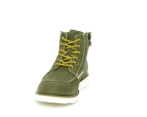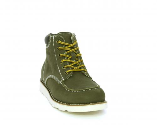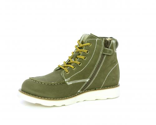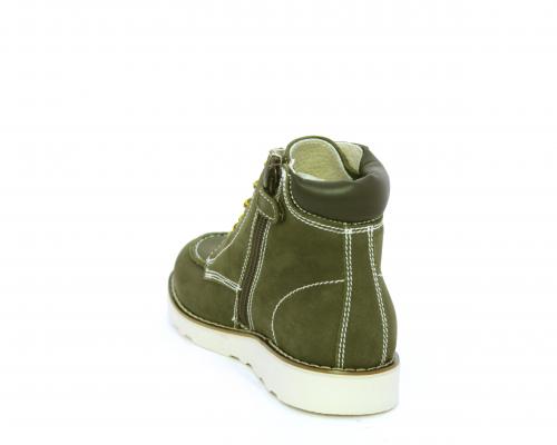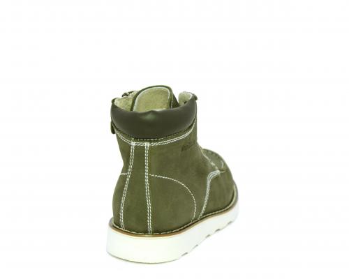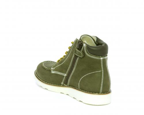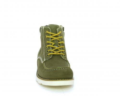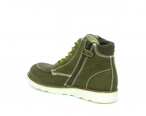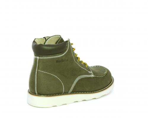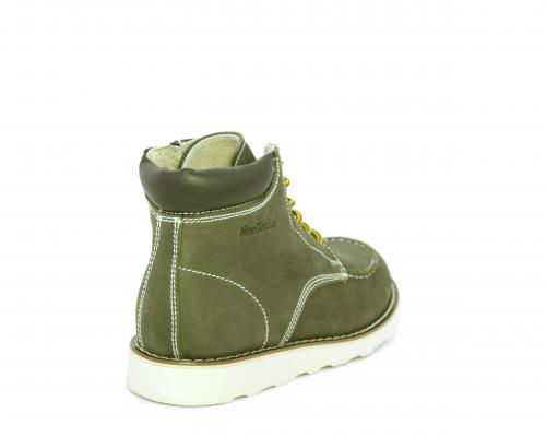 Scarponcino modello ingegnere, con lacci e chiusura laterale per facilitare la calzata, tomaia in nabuk e rifinitura in pelle intorno alla caviglia, sottopiede e fodera interna in pelle.