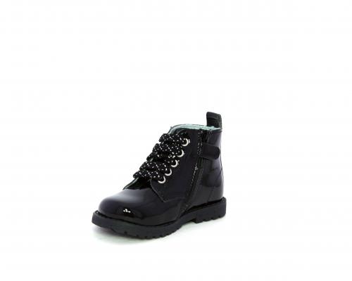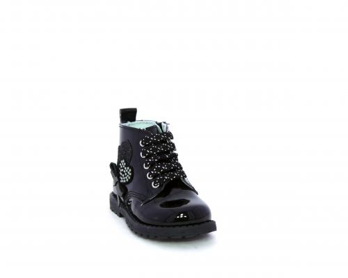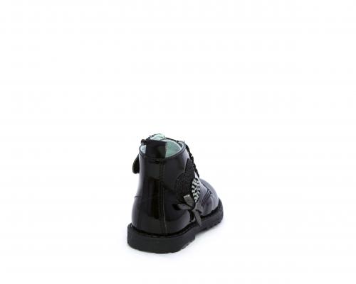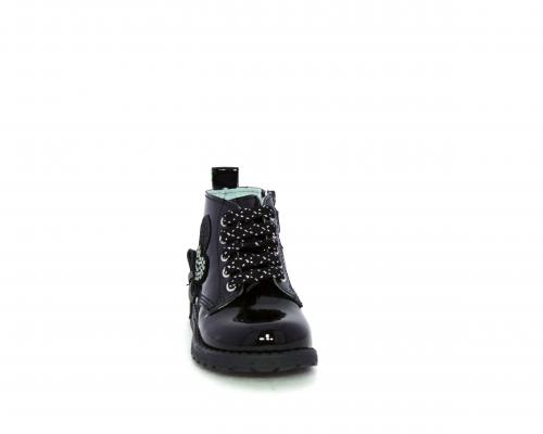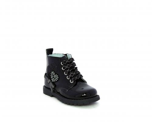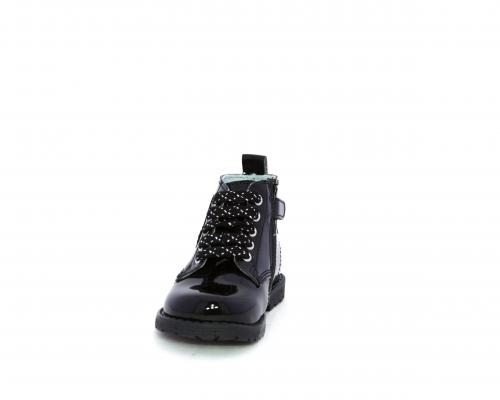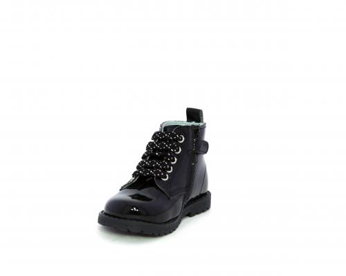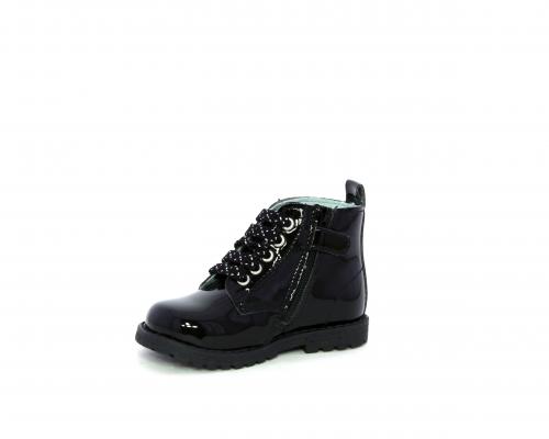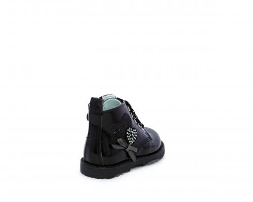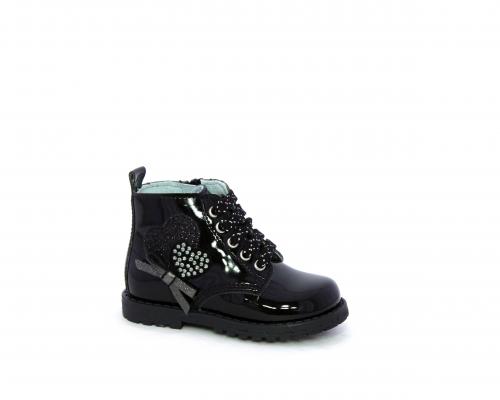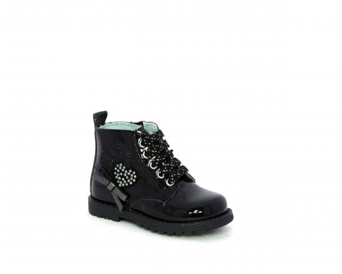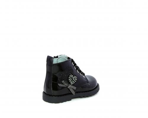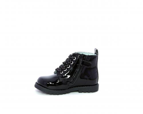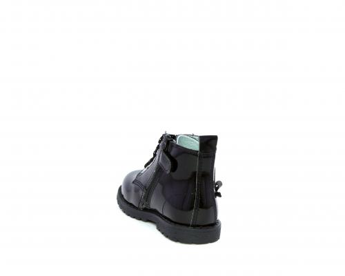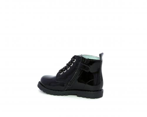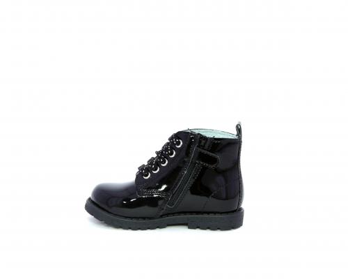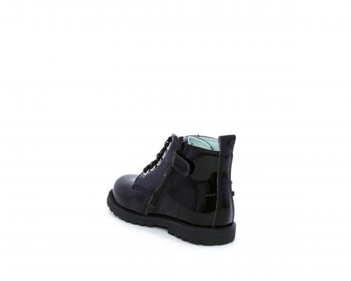 Anfibio con lacci e chiusura laterale per facilitare la calzata, tomaia in vernice con decorazioni laterali, sottopiede e fodera interna in pelle.
