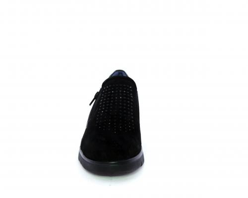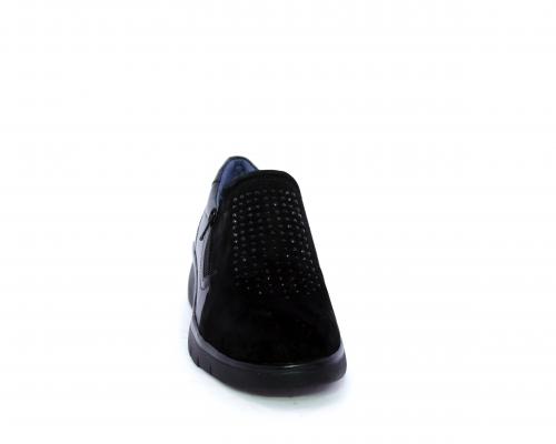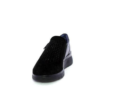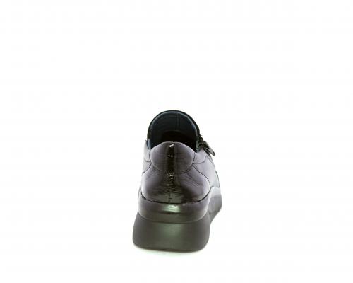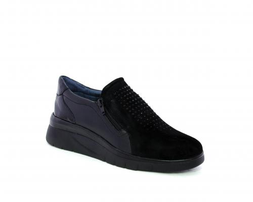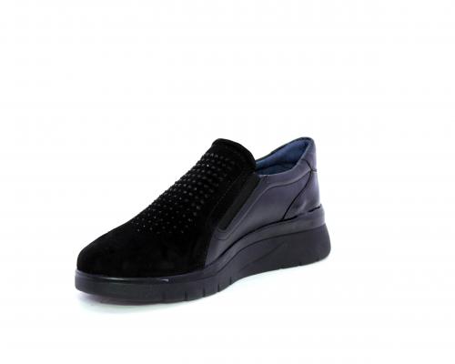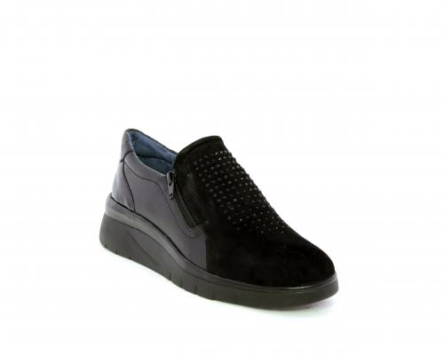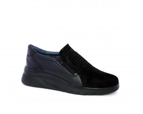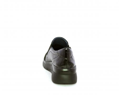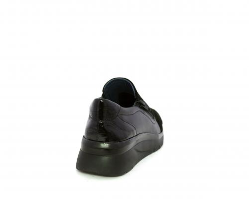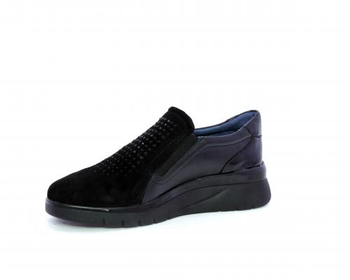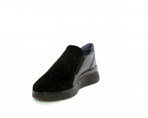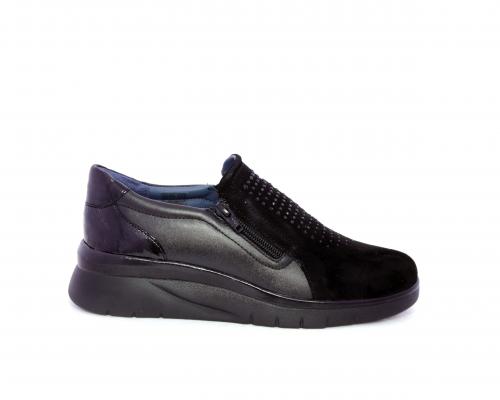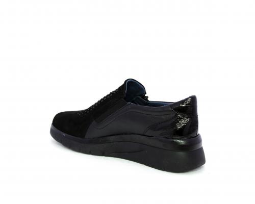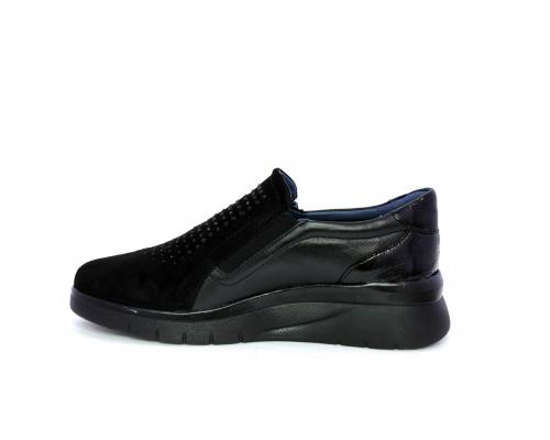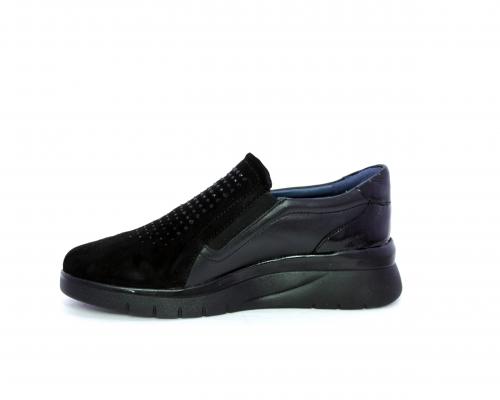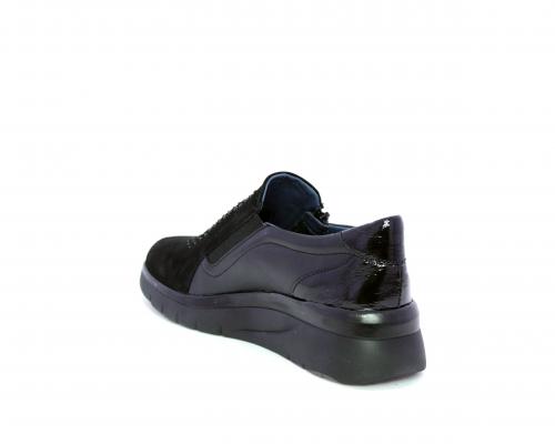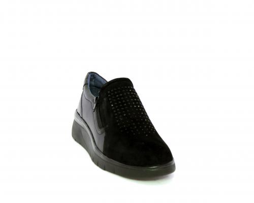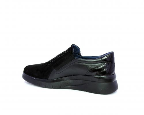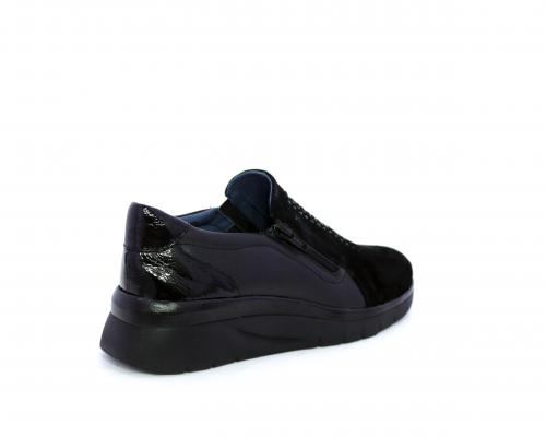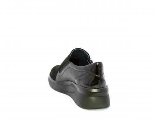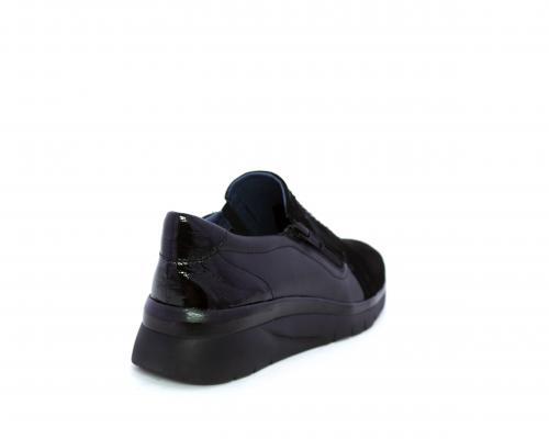Sneakers senza lacci con chiusura laterale ed elastico per facilitare la calzata, tomaia in camoscio con parti in pelle e vernice, sottopiede e fodera interna in tessuto, fusbet anatomico estraibile.