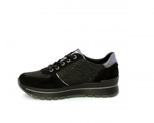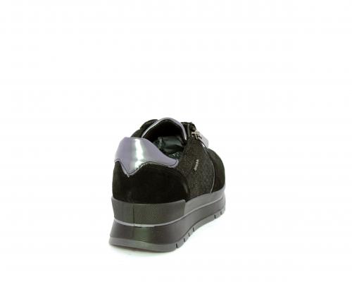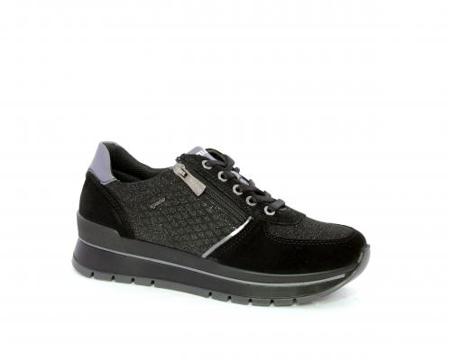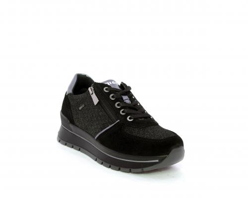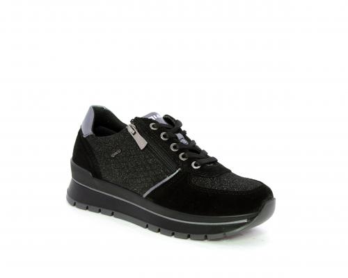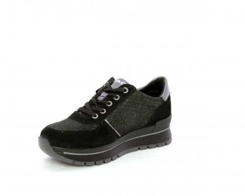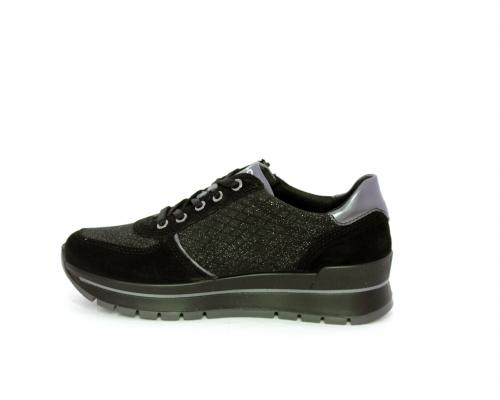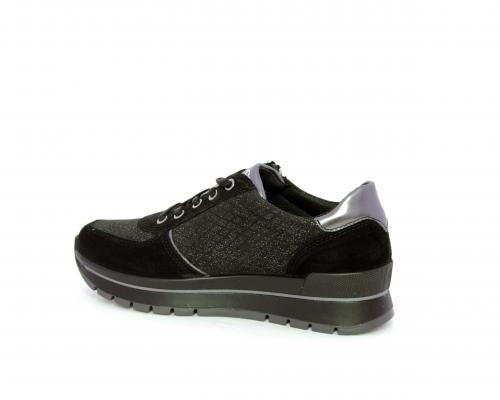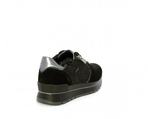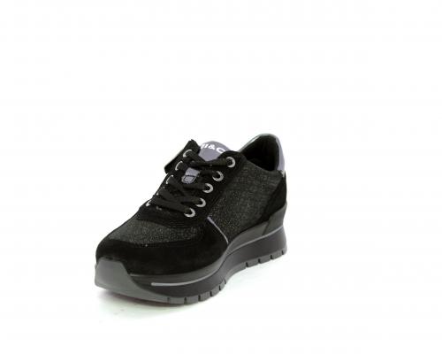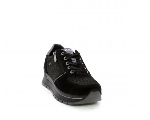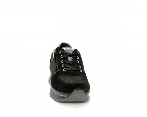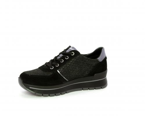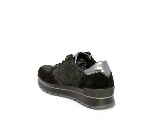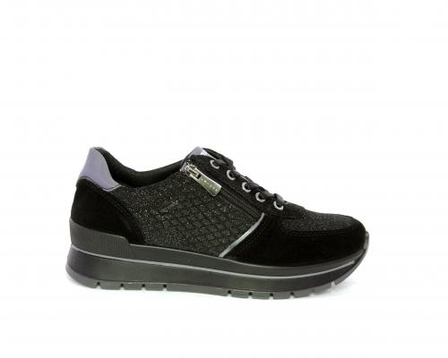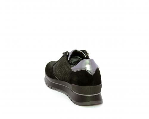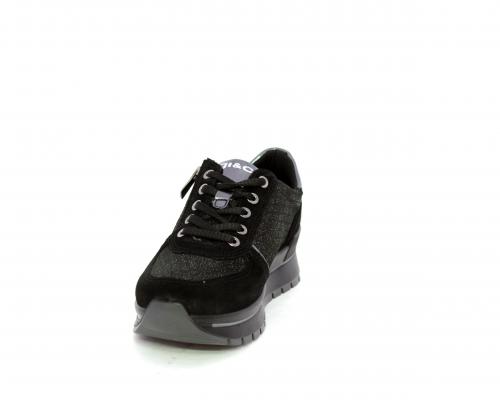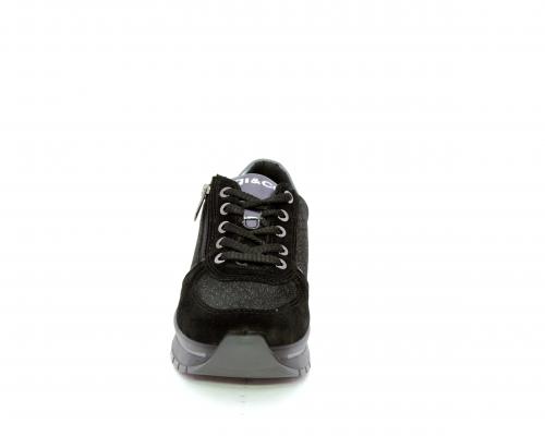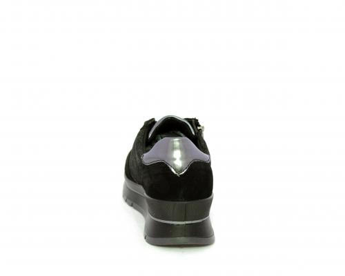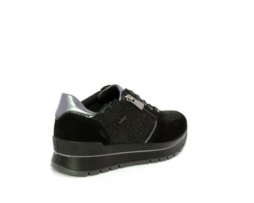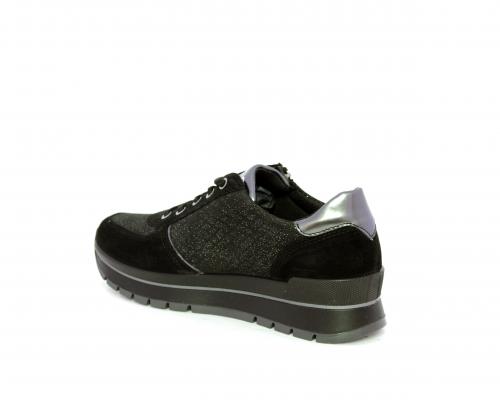Sneakers allacciata con chiusura laterale per facilitare la calzata, tomaia in camoscio con inserti in lurex, sottopiede in pelle, fodera interna in tessuto, fusbet estraibile con memory foam.