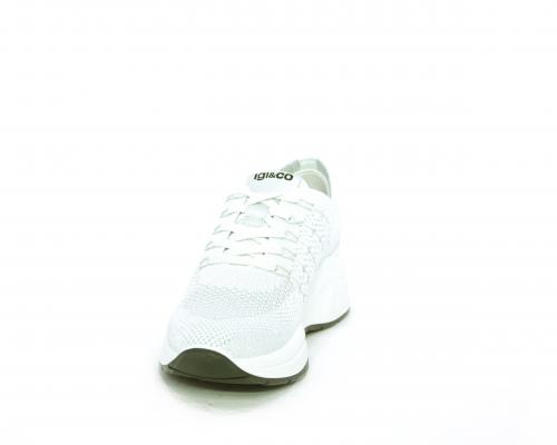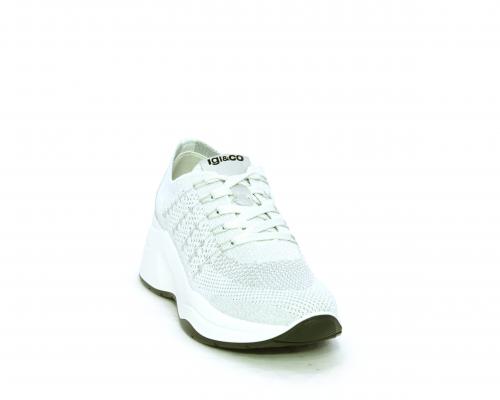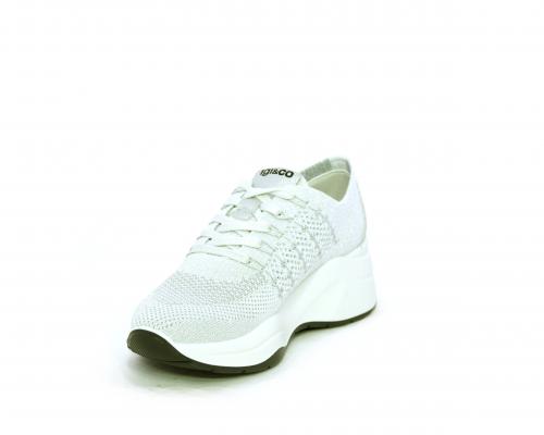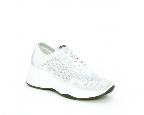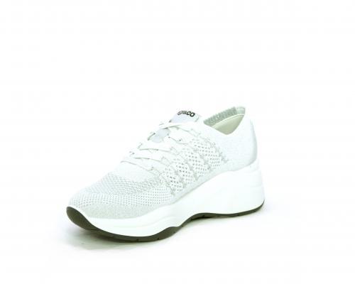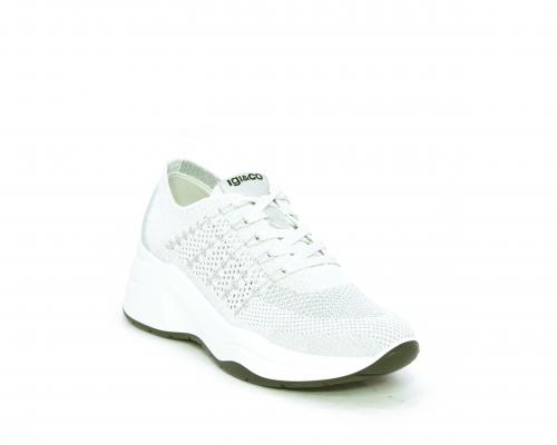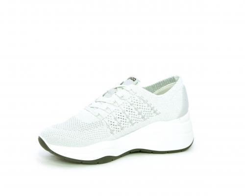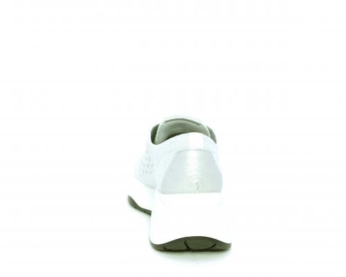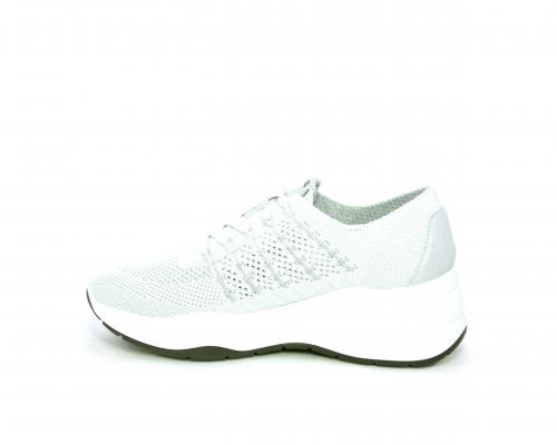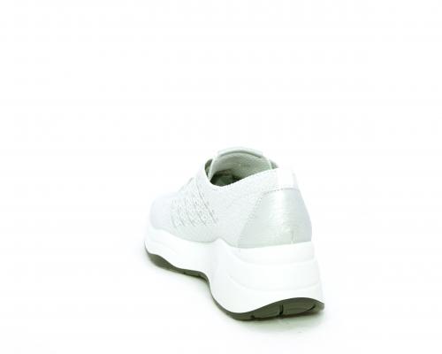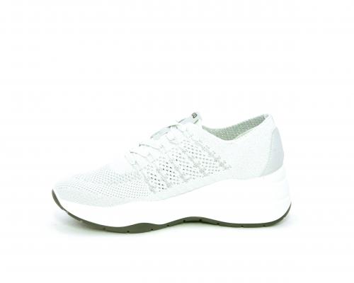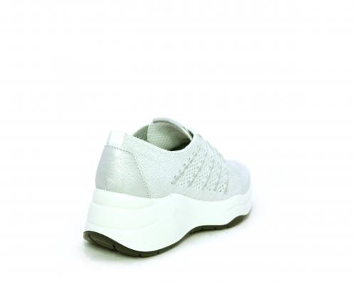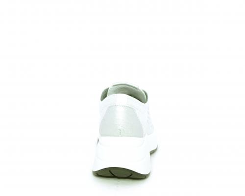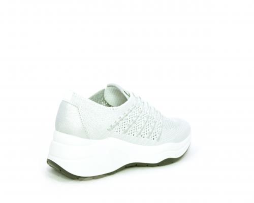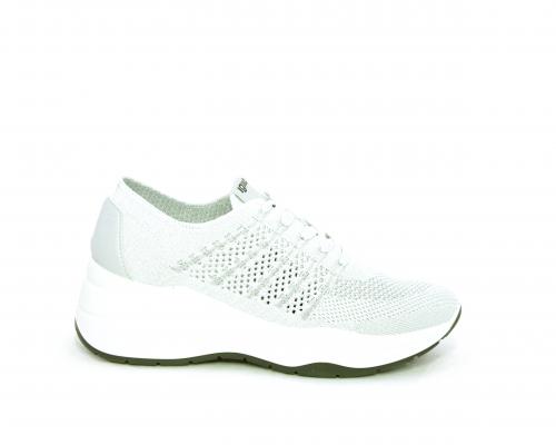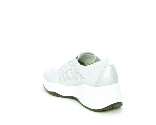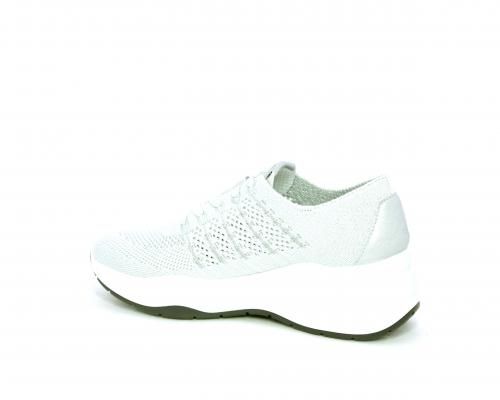 Sneakers allacciata, tomaia in tessuto elasticizzato, sottopiede in vera pelle, fusbet anatomico estraibile, la calzatura è realizzata a basso inquinamento ambientale utilizzando plastica riciclata.