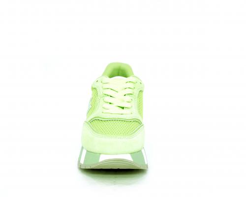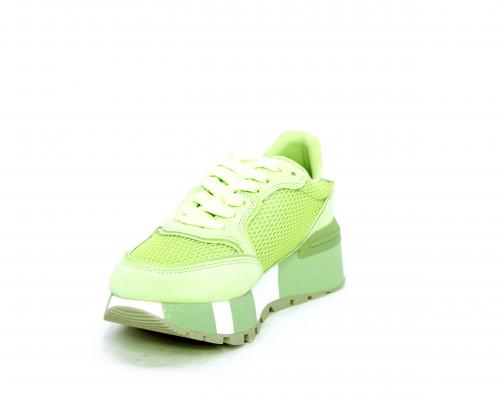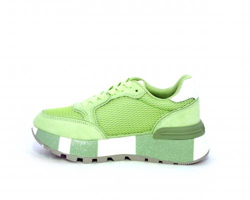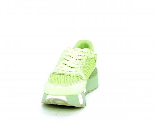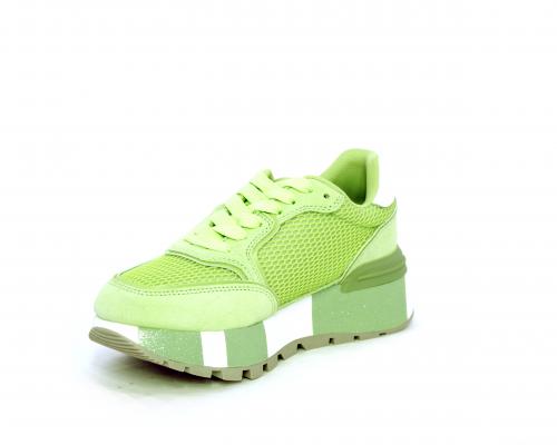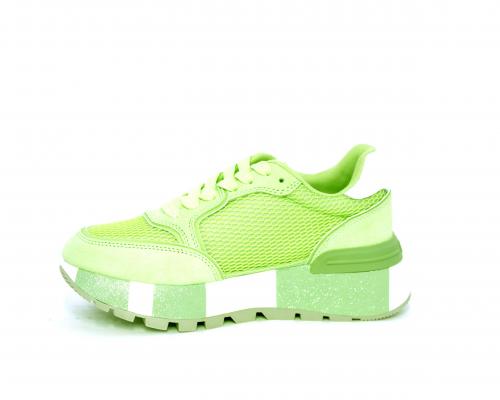 Sneaker allacciata con platform in gomma colorblock glitterato, tomaia in nabuk e tessuto con logo glitterato, sottopiede e fodera interna in tessuto effetto spugna, fusbet anatomico estraibile.