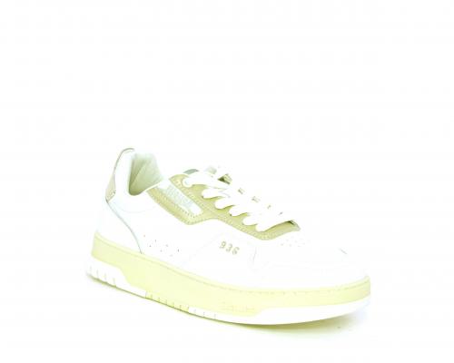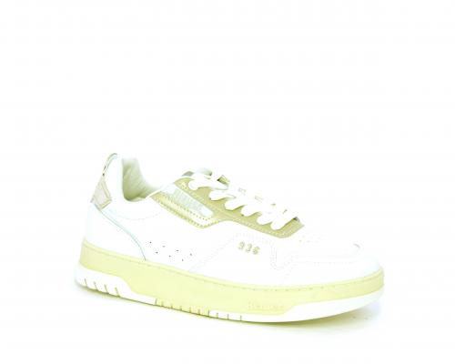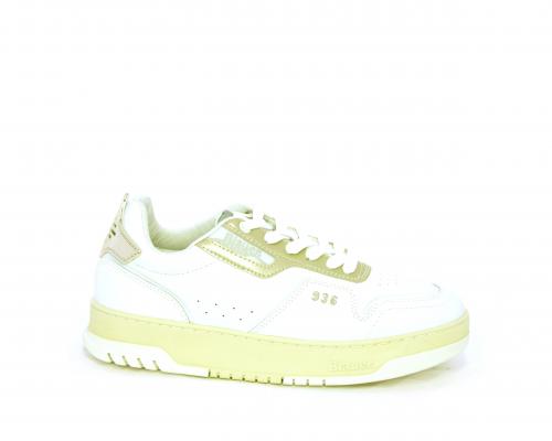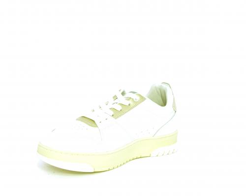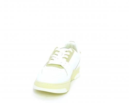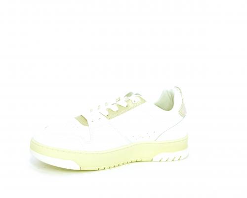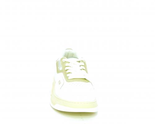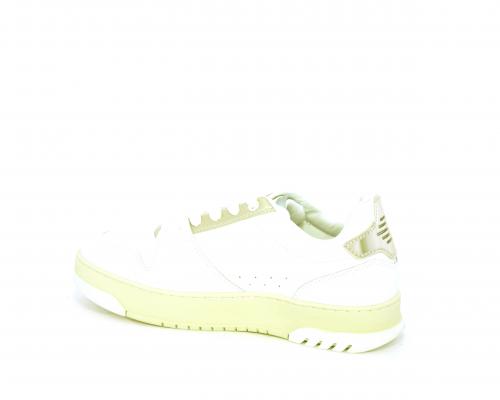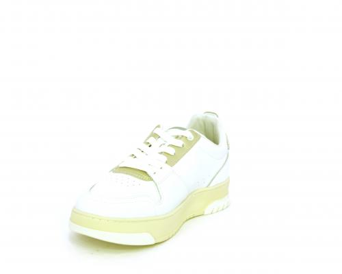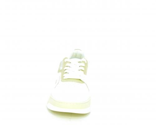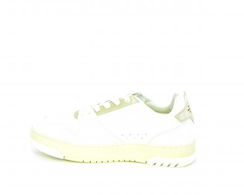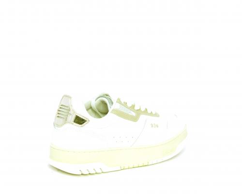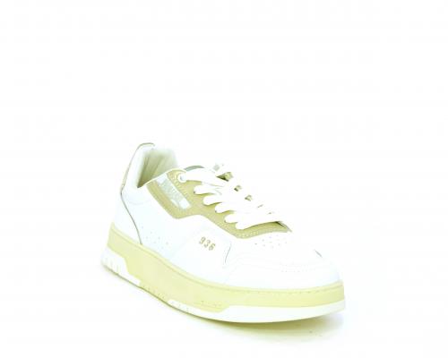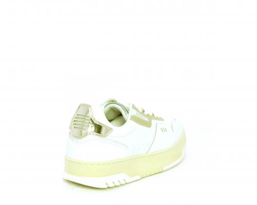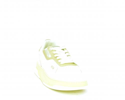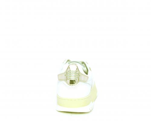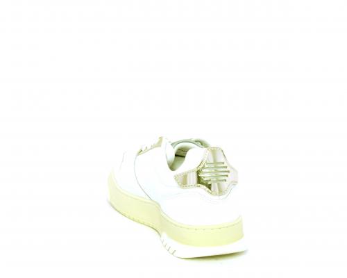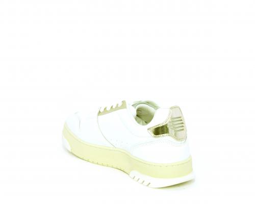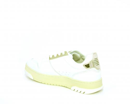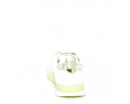 Sneakers allacciata con platform alto in gomma, tomaia in pelle con rifiniture color platino, sottopiede e fodera interna in pelle, fusbet anatomico estraibile.