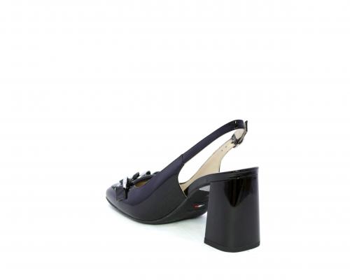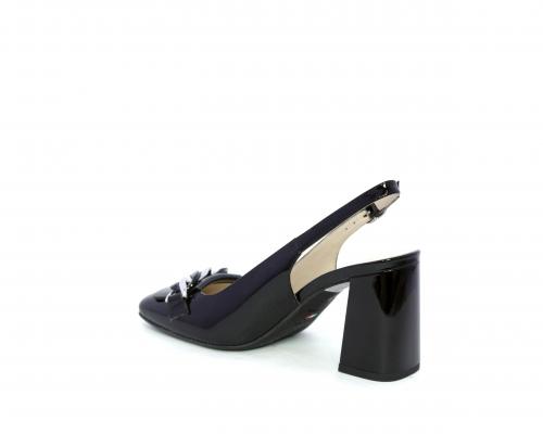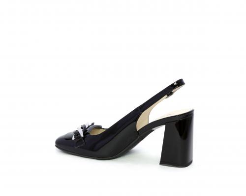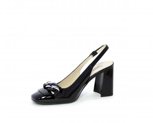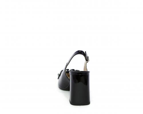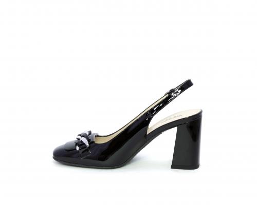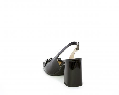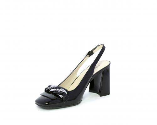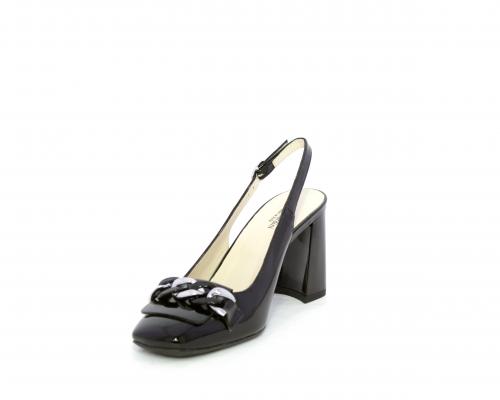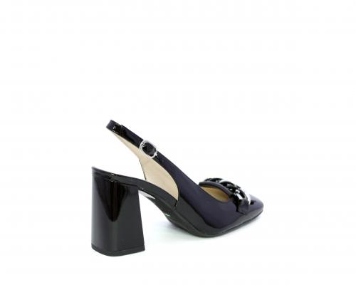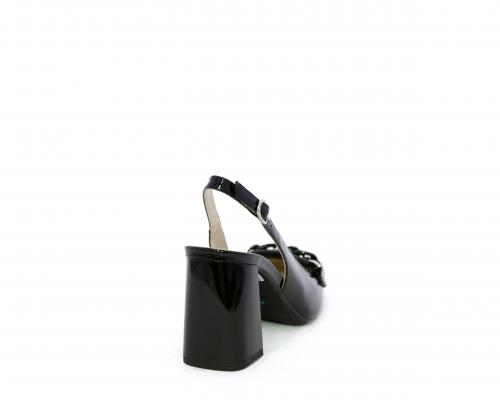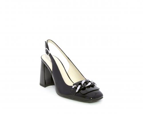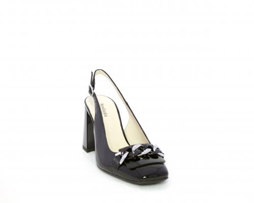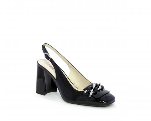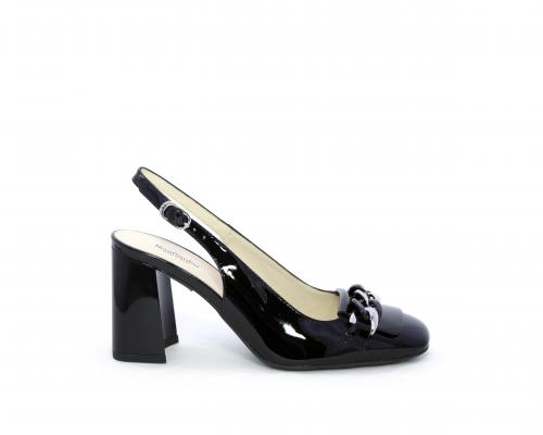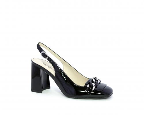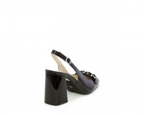 Chanel in vernice, tacco largo rivestito in vernice, catena in acciaio sul collo del piede, cinturino regolibe con fibbia, sottopiede e fodera interna in pelle, fusbet anatomico.