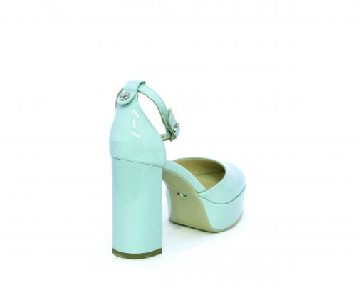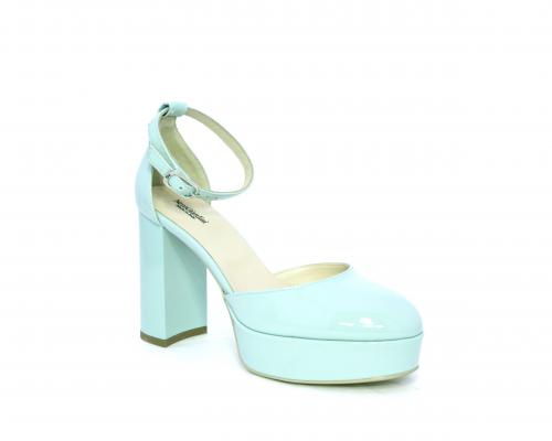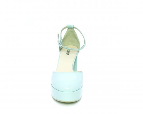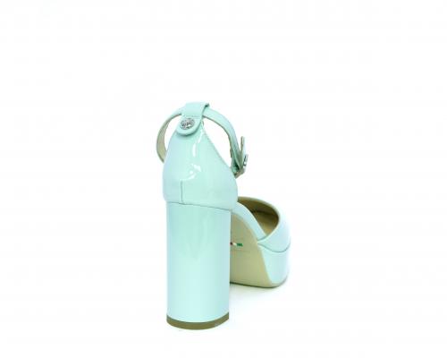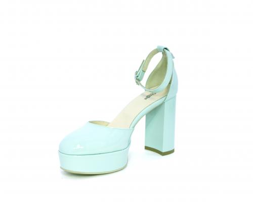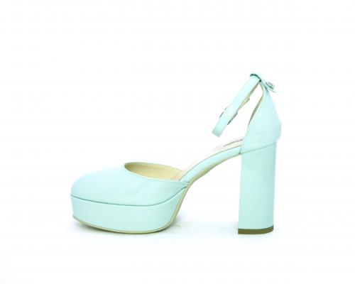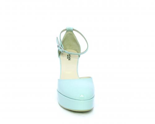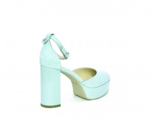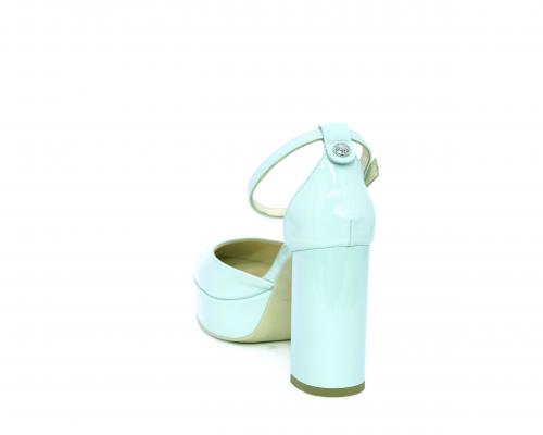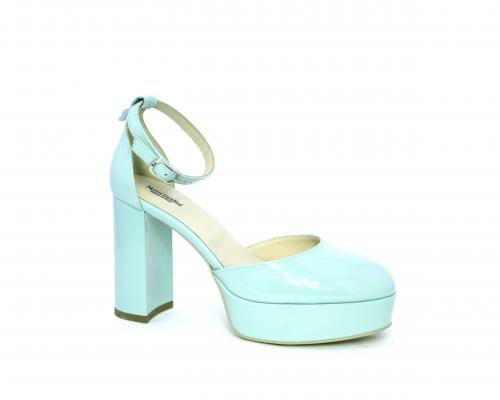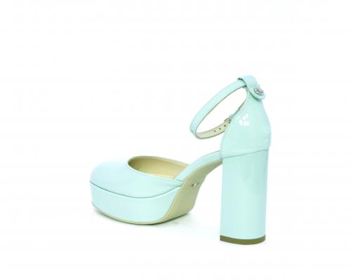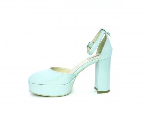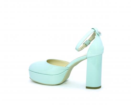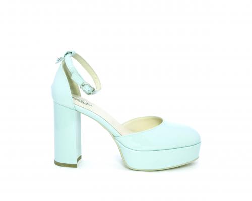 Chanel in vernice, con tacco largo e plateaux sempre in vernice, cinturino regolabile intorno alla caviglia, sottopiede e fodera interna in pelle, fusbet con memory.