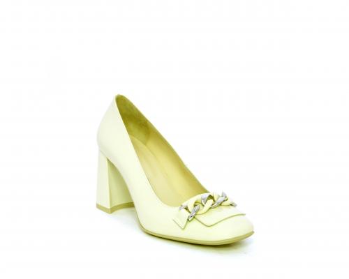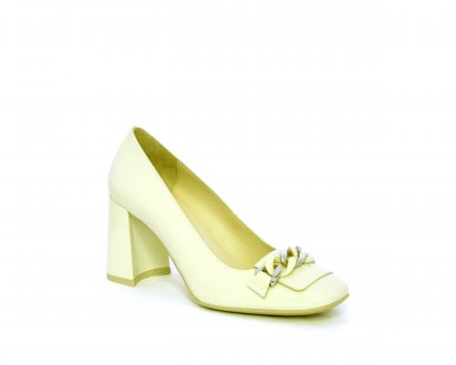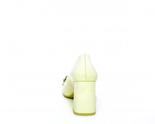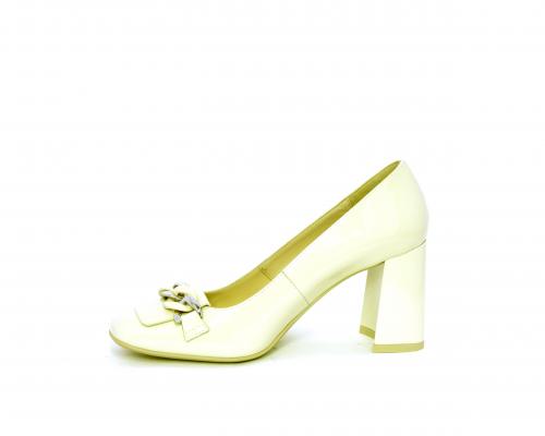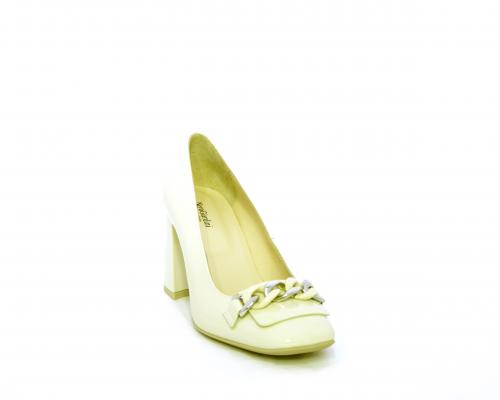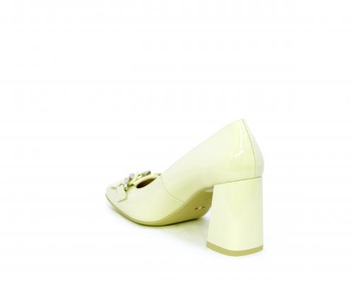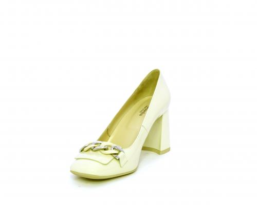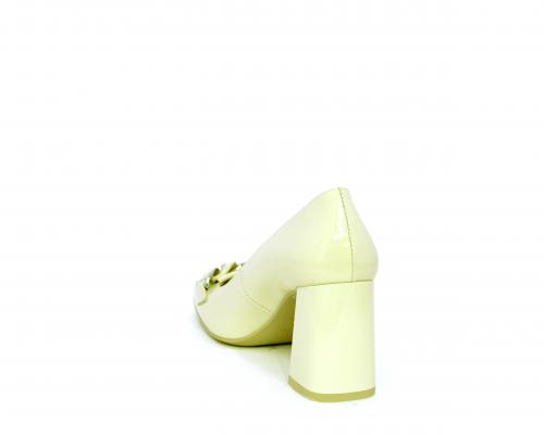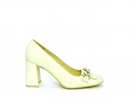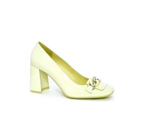 Decollettè in vernice, tacco largo rivestito in vernice, catena in acciaio sul collo del piede, sottopiede e fodera interna in pelle, fusbet anatomico.