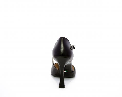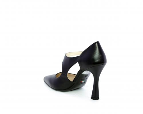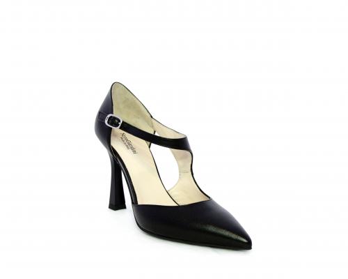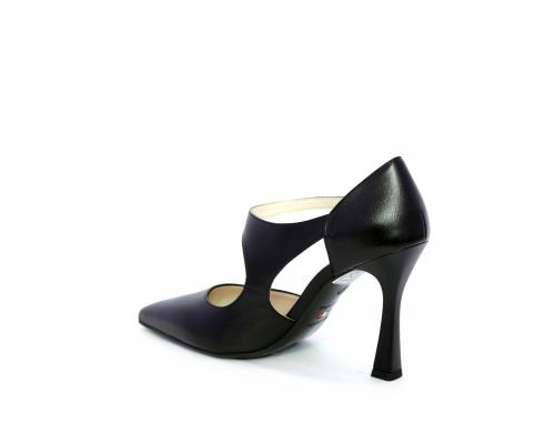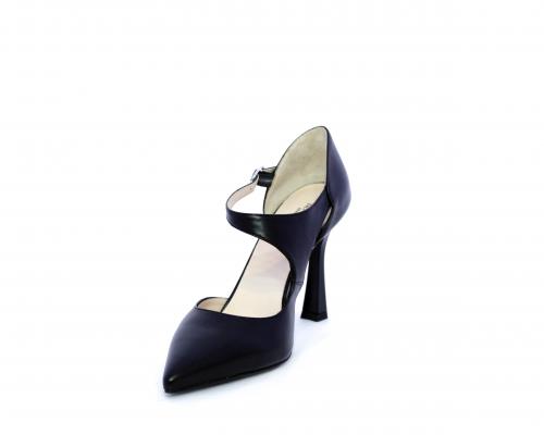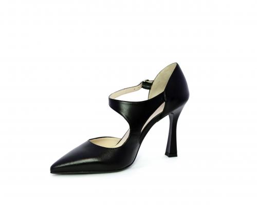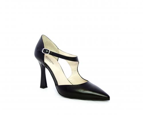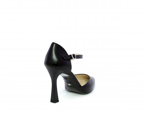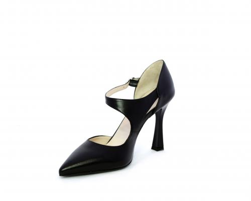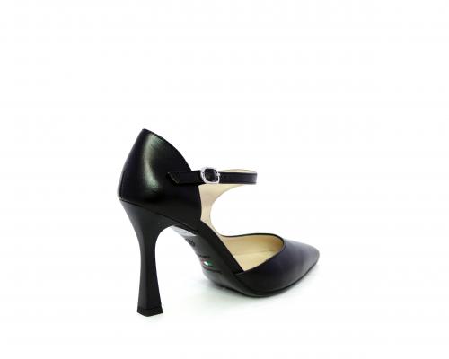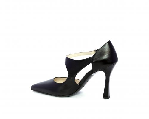 Decollettè con tacco a rocchetto, tomaia in pelle con apertura laterale e cinturino regolabile sul collo del piede, sottopiede e fodera interna in pelle, fusbet anatomico.