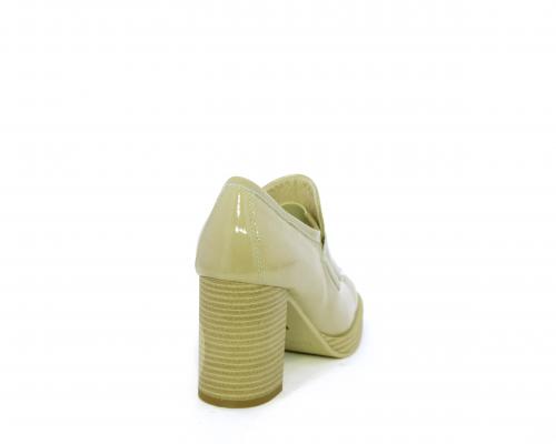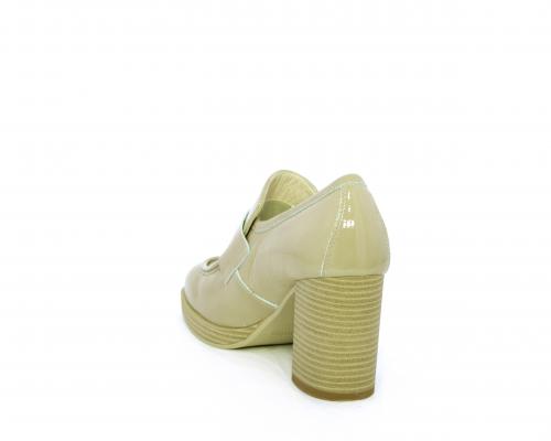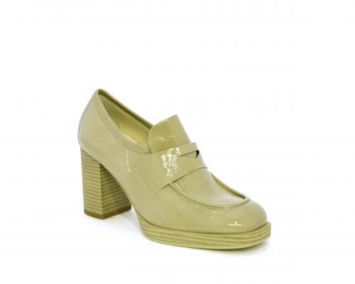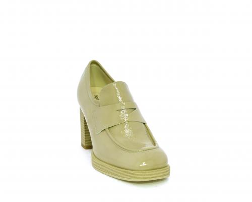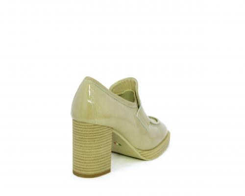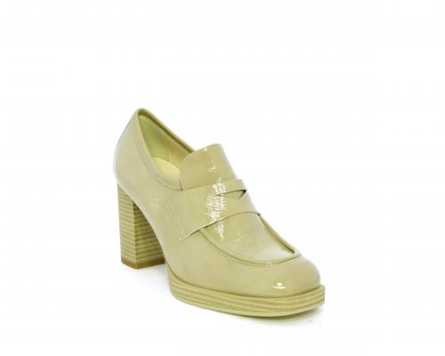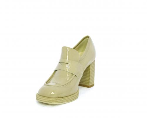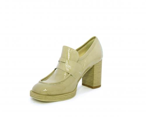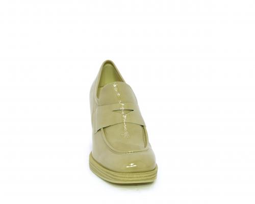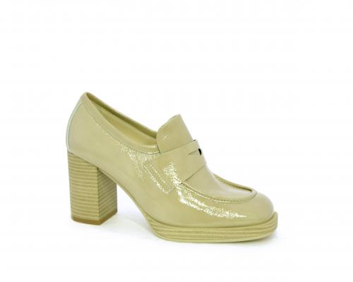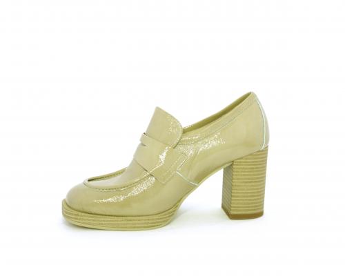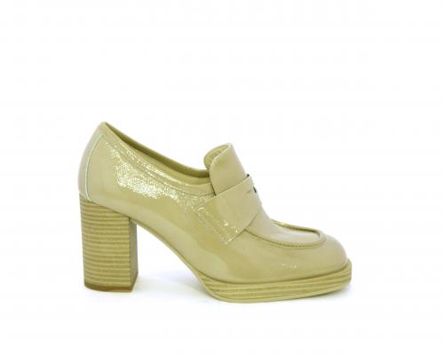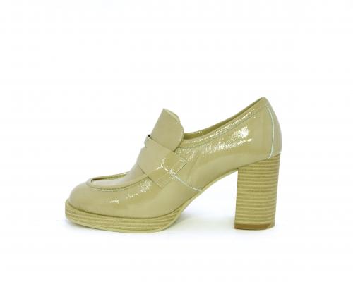 Mocassino in vernice con elastico interno sul collo del piede, tacco e plateaux rivestiti con effetto legno, sottopiede e fodera interna in pelle, fusbet anatomico.