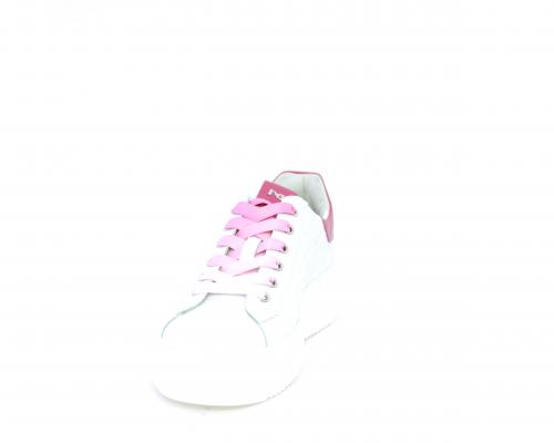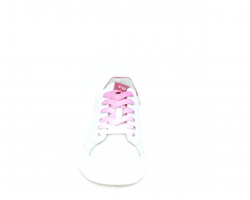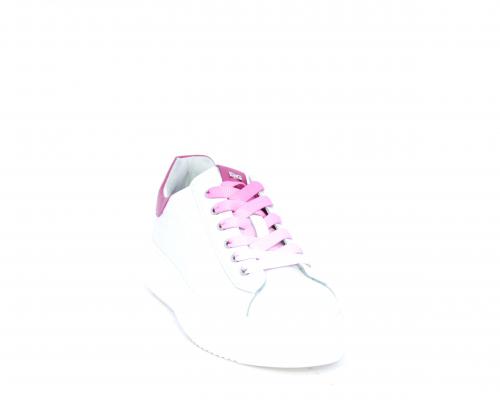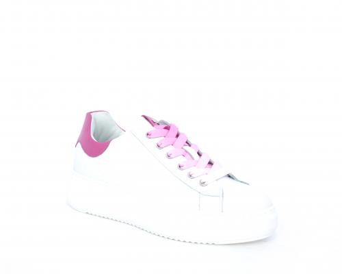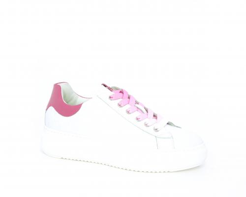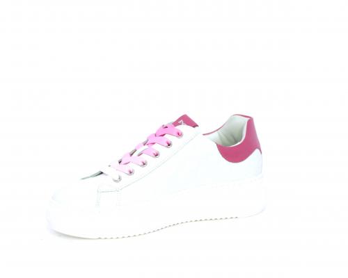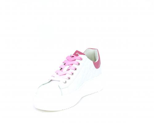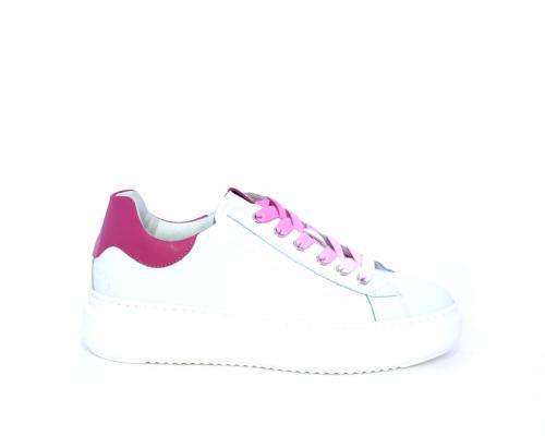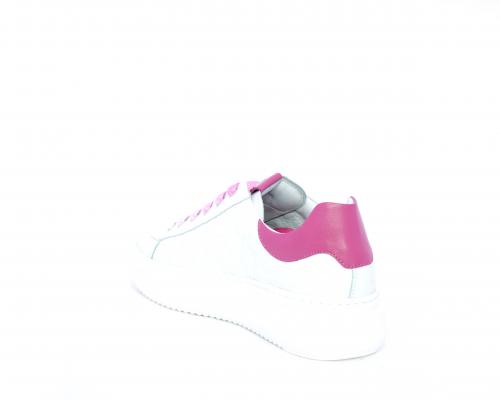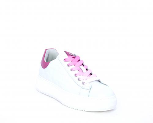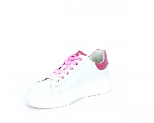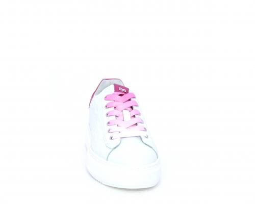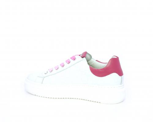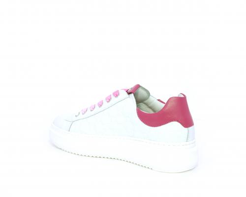 Sneakers allacciata, tomaia in pelle trapuntata con stampe, dietro al tallone pelle colorata, platform in gomma bianca, sottopiede e fodera interna in pelle, fusbet estraibile con sistema DryGo che svolge una doppia azione, assorbe l'umidità quando si indossa la scarpa e si asciuga rapidamente quando si toglie la calzatura.