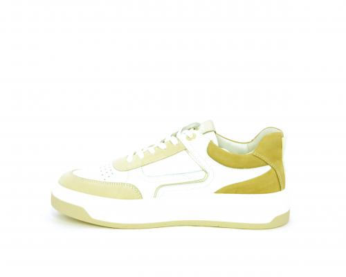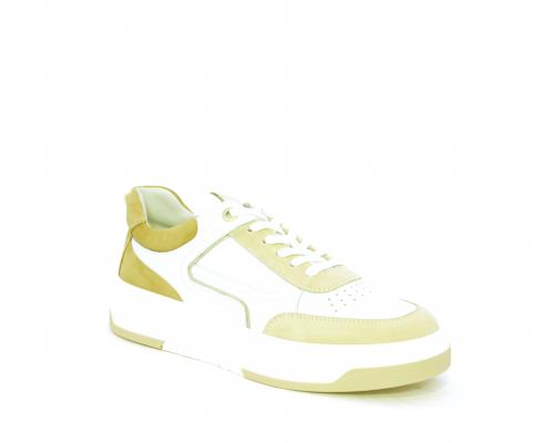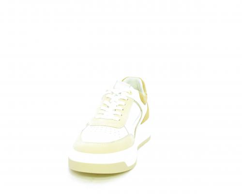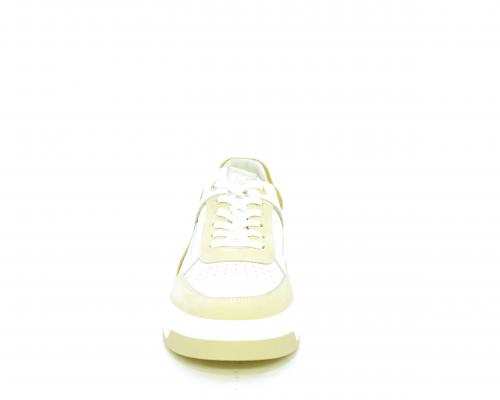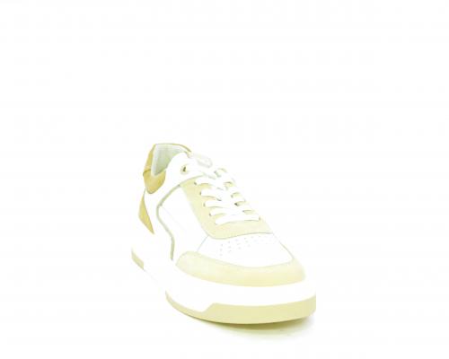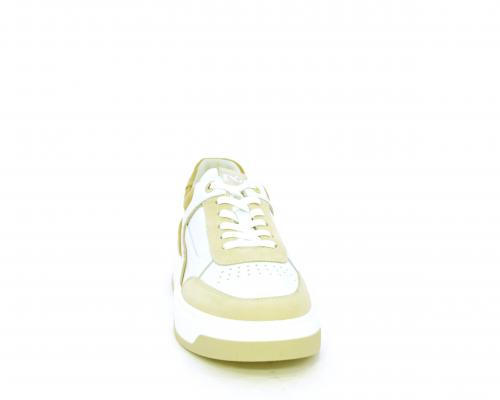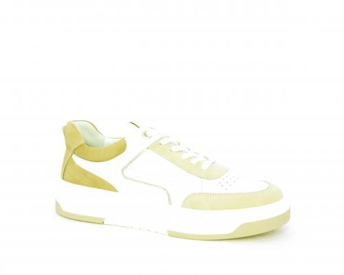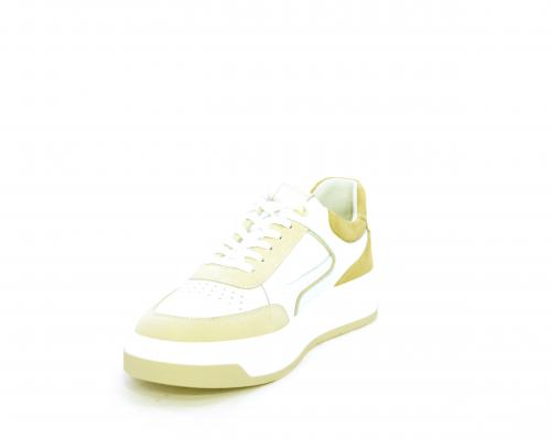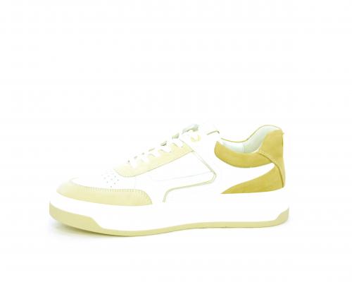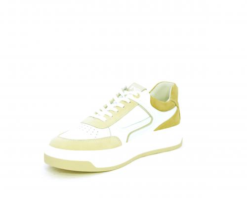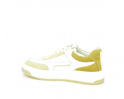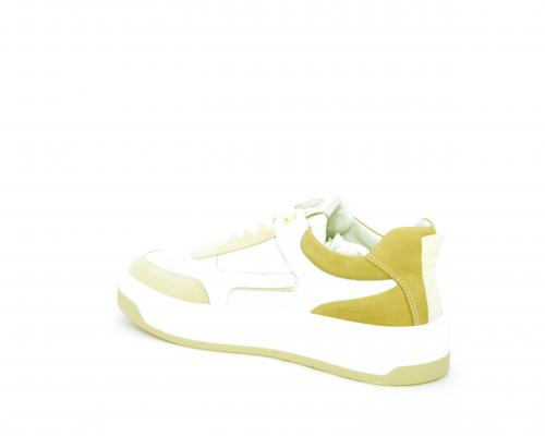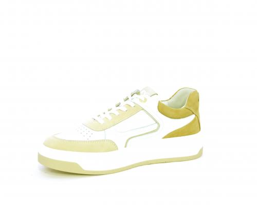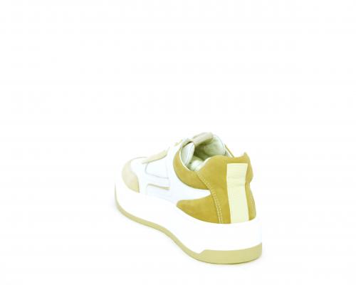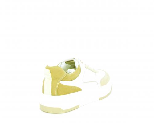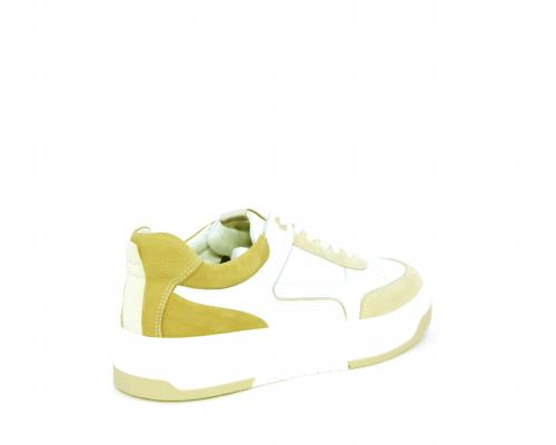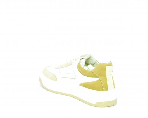 Sneakers allacciata, tomaia in pelle con parti in suede colorata, platform in gomma bianca e parti colorate, sottopiede e fodera interna in pelle, fusbet estraibile con sistema DryGo che svolge una doppia azione, assorbe l'umidità quando si indossa la scarpa e si asciuga rapidamente quando si toglie la calzatura.