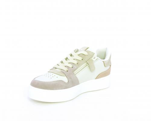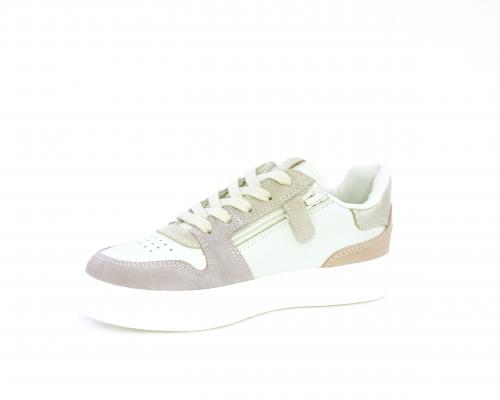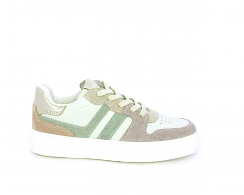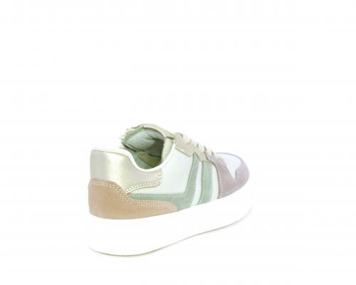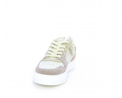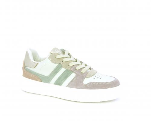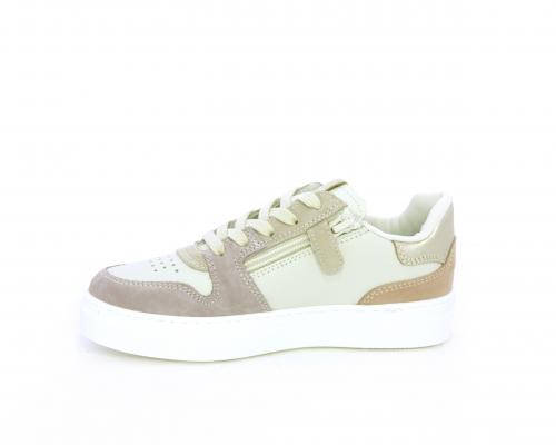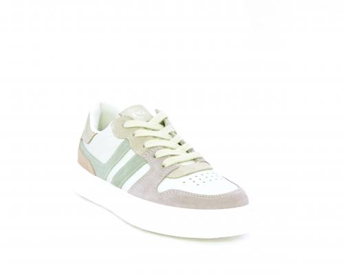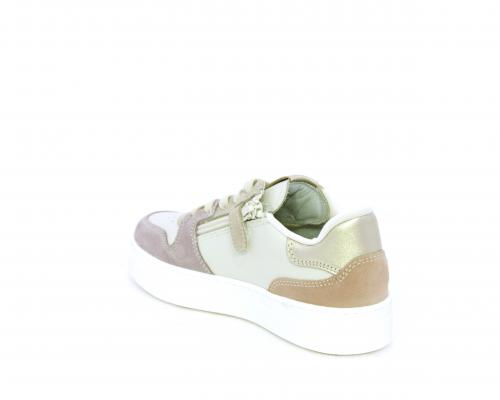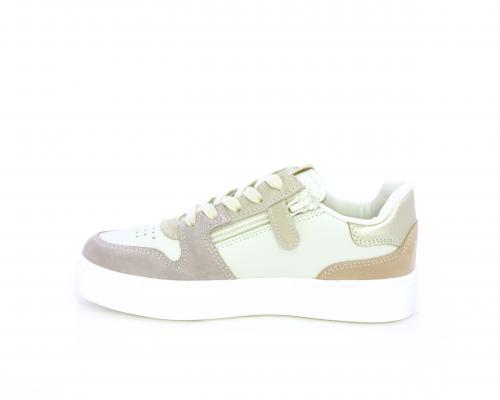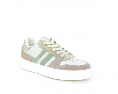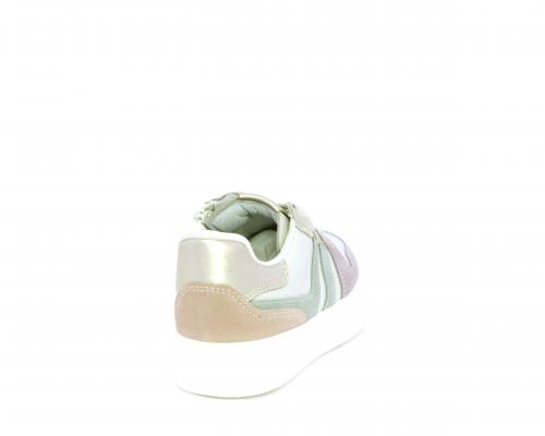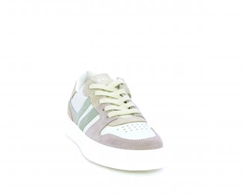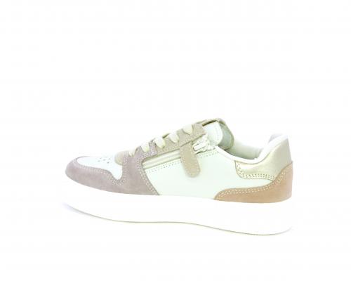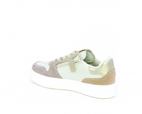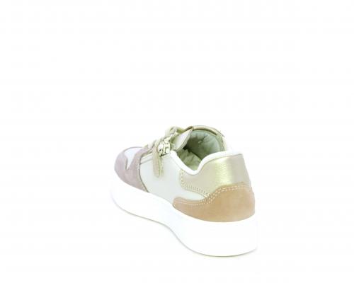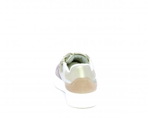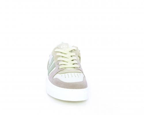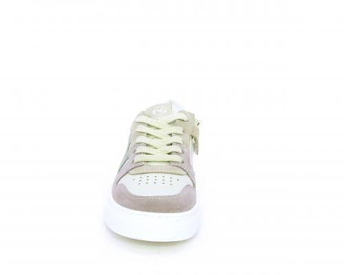 Scarpa con lacci e chiusura laterale per facilitare la calzata, tomaia in pelle e parti colorate in suede, cuscinetto in tessuto nella parte interna intorno alla caviglia, sottopiede e fodera interna in pelle, fusbet estraibile.