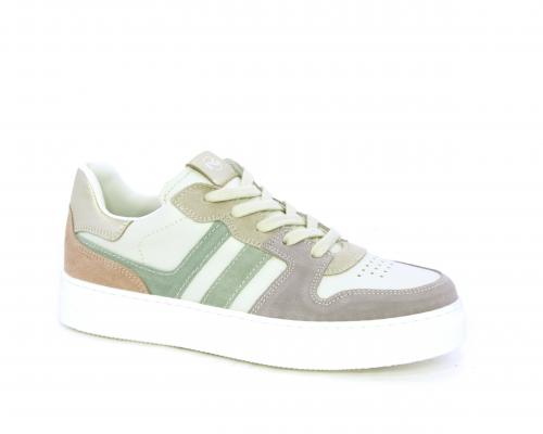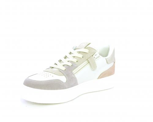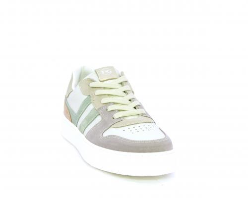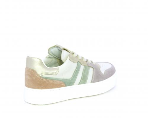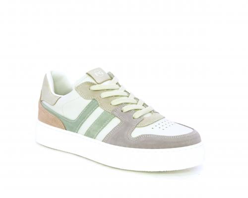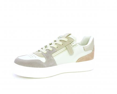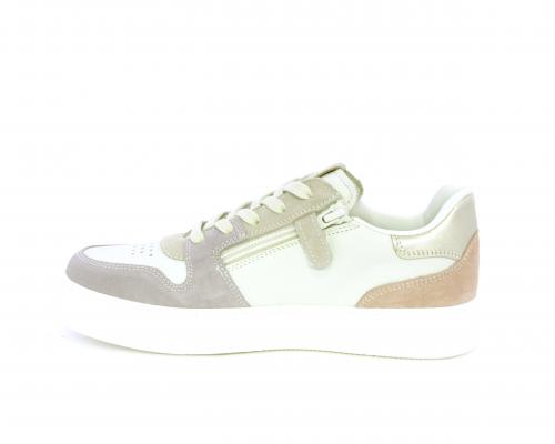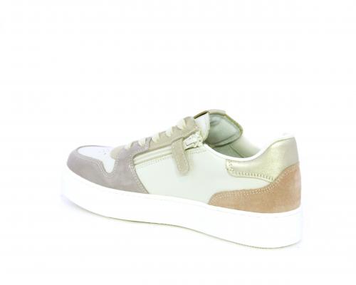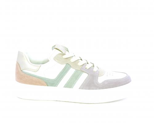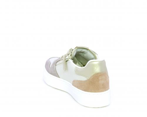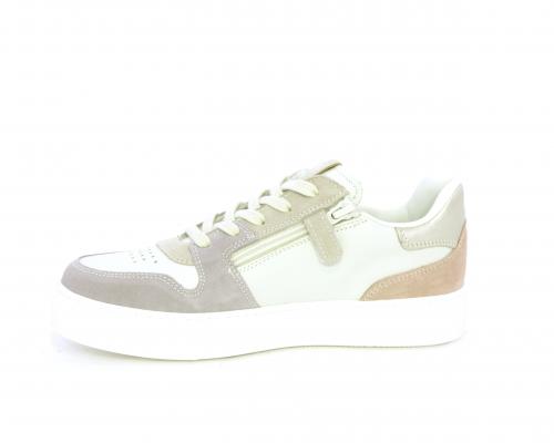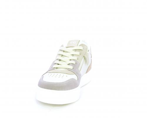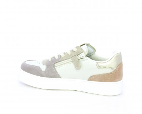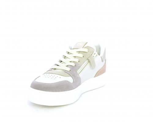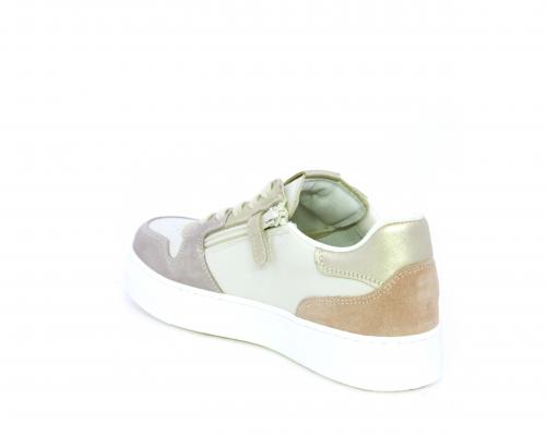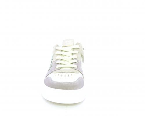 Scarpa con lacci e chiusura laterale per facilitare la calzata, tomaia in pelle e parti colorate in suede, cuscinetto in tessuto nella parte interna intorno alla caviglia, sottopiede e fodera interna in pelle, fusbet estraibile.