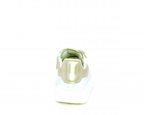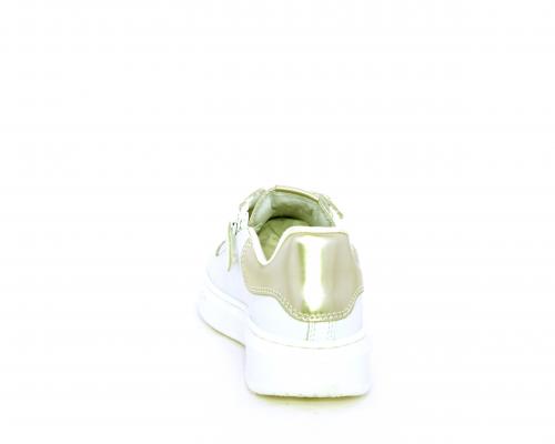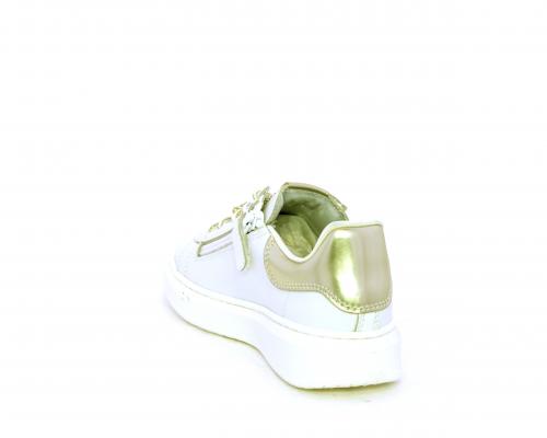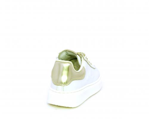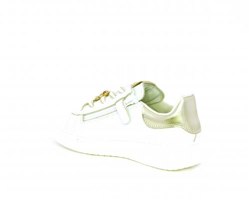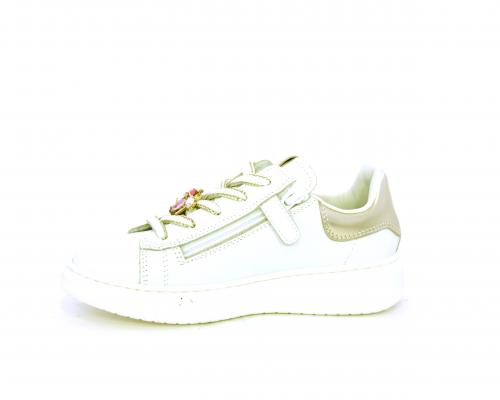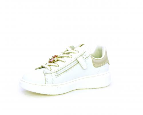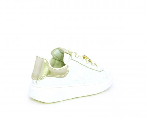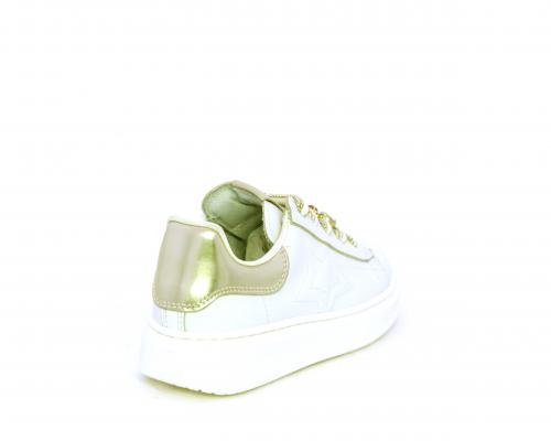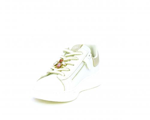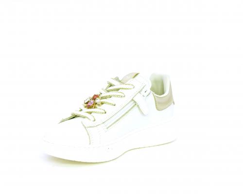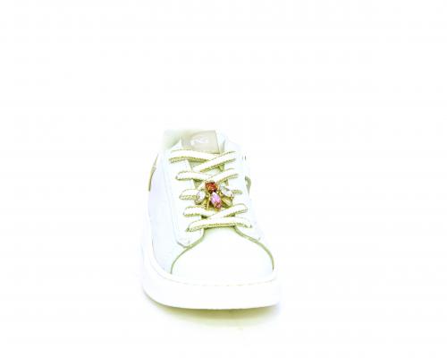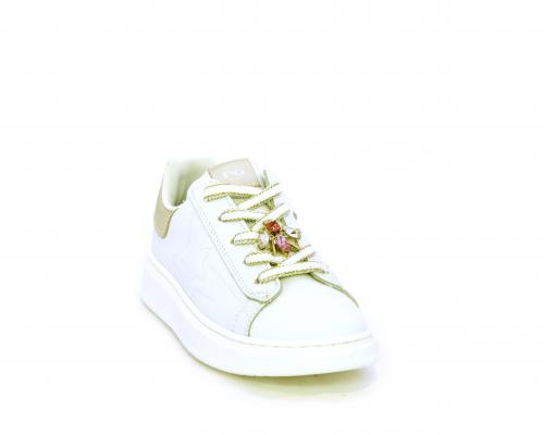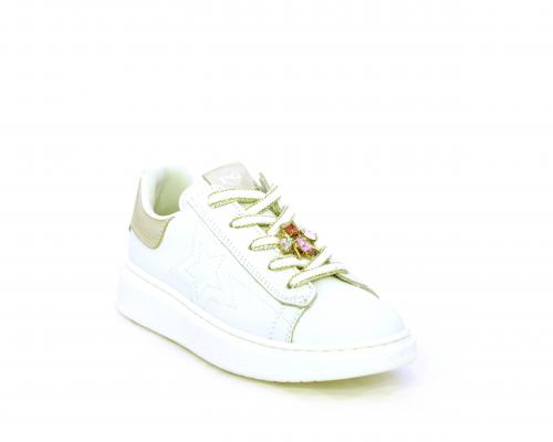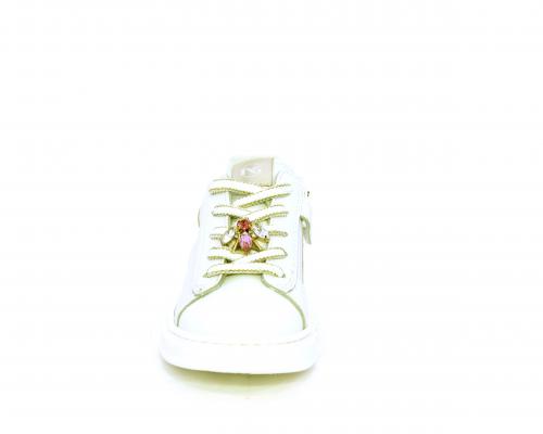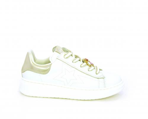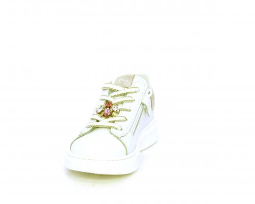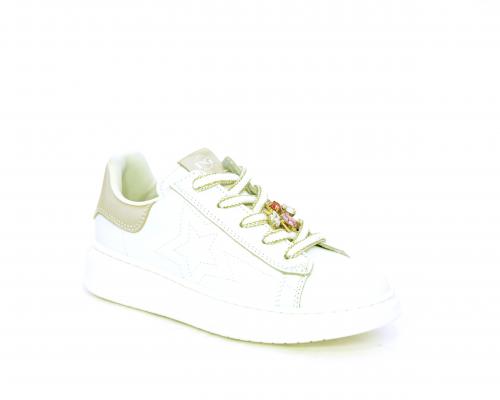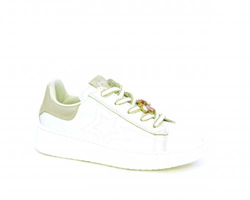 Scarpa con lacci e chiusura laterale per facilitare la calzata, tomaia in pelle con cuciture laterali a forma di stella e accessorio in swaroski sui lacci, cuscinetto in tessuto nella parte interna intorno alla caviglia, sottopiede e fodera interna in pelle, fusbet estraibile.