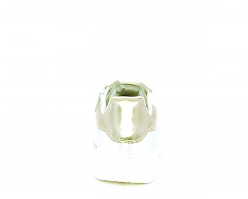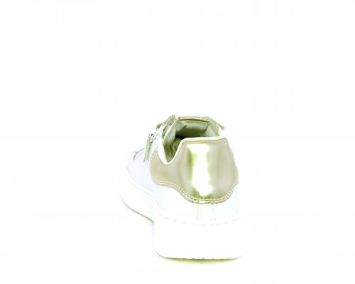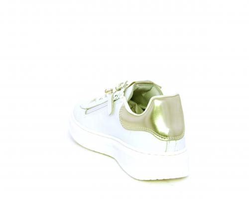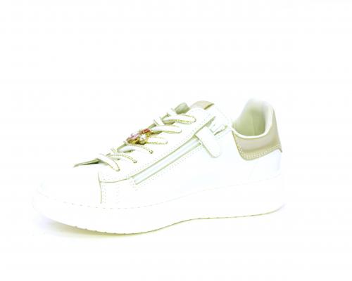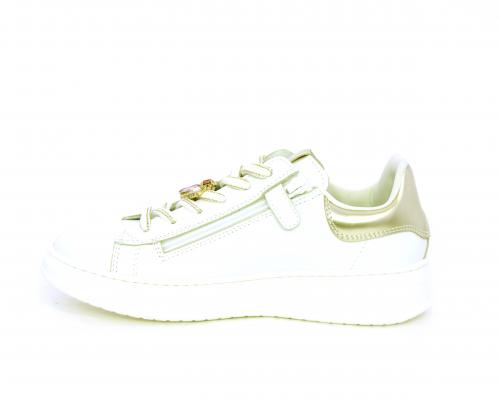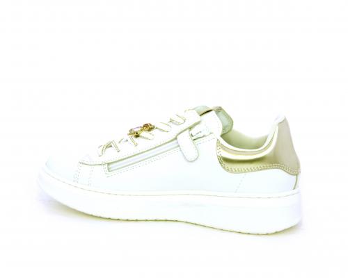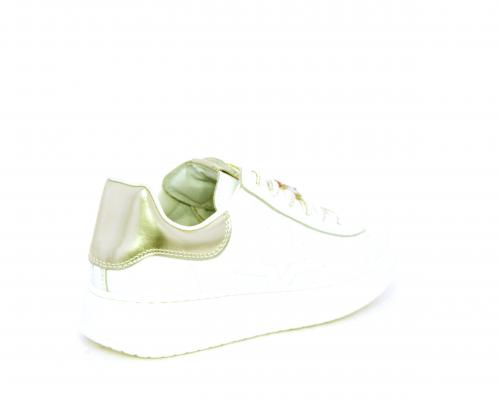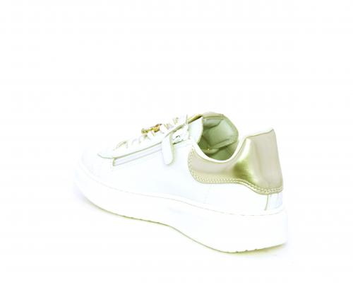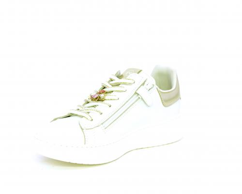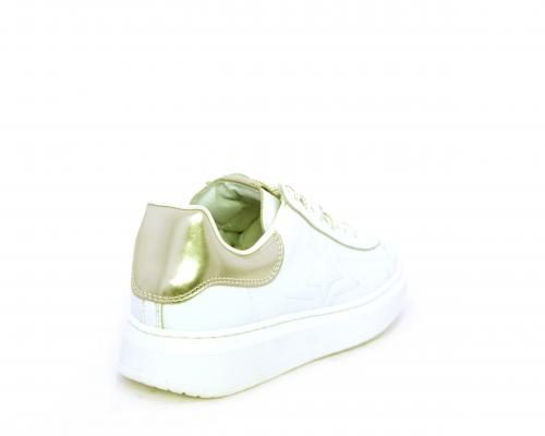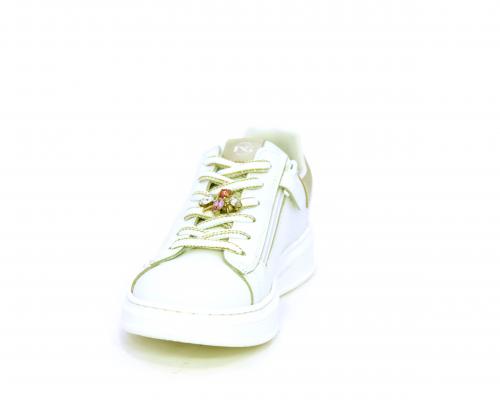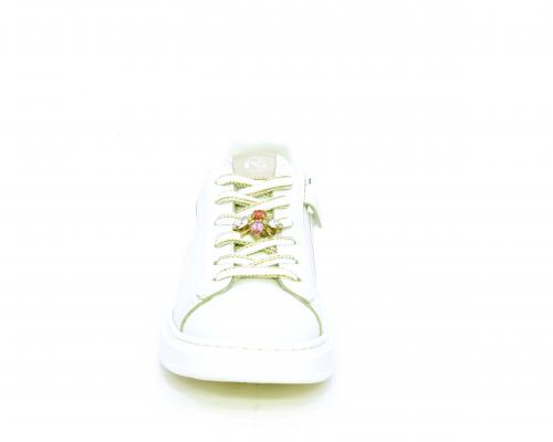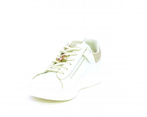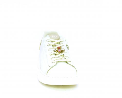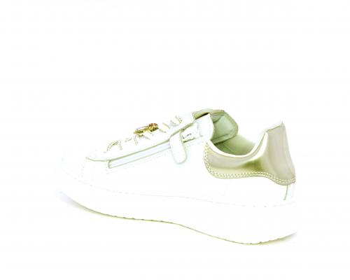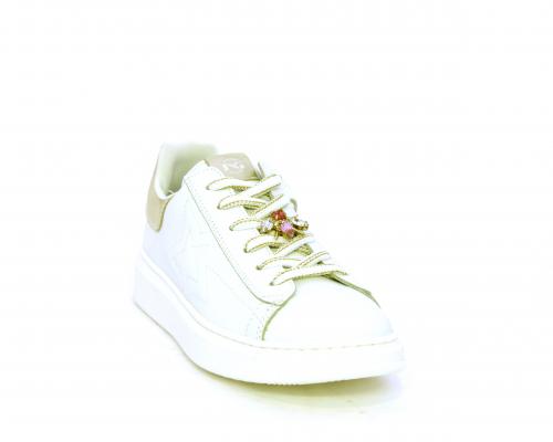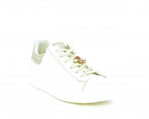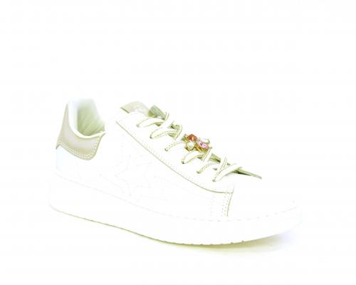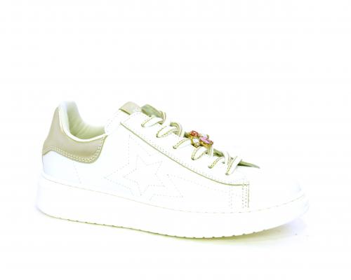 Scarpa con lacci e chiusura laterale per facilitare la calzata, tomaia con cuciture laterali a forma di stella e accessorio in swaroski sui lacci, cuscinetto in tessuto nella parte interna intorno alla caviglia, sottopiede e fodera interna in pelle, fusbet estraibile.