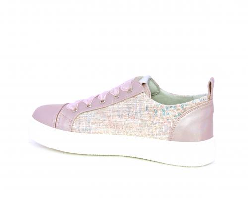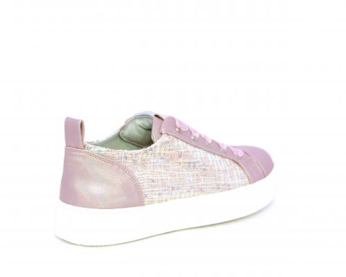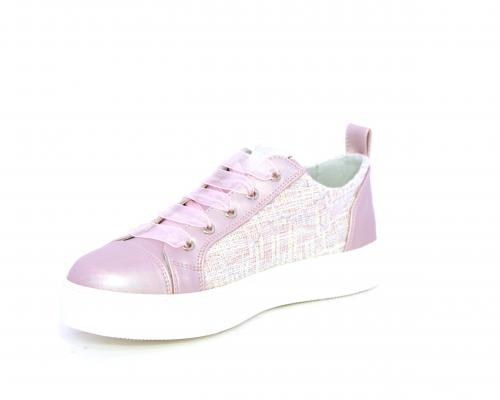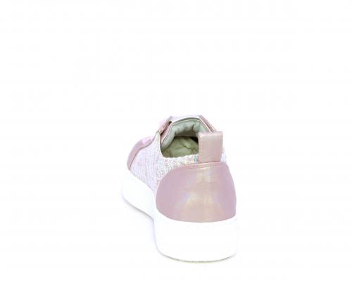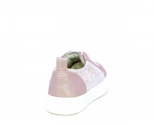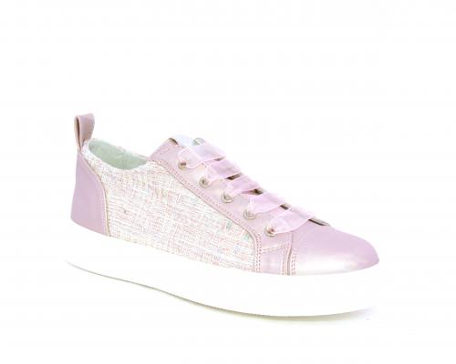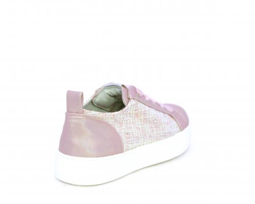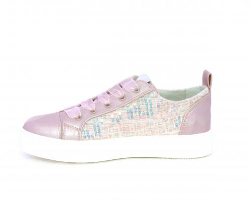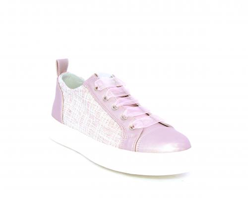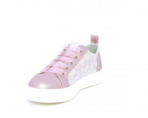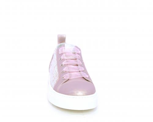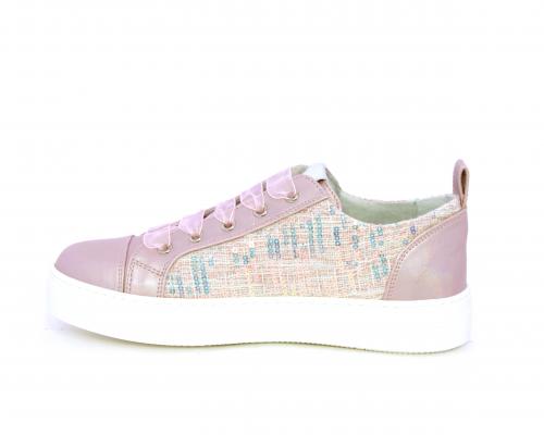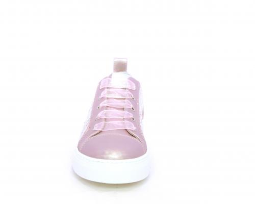 Sneakers bambina con lacci in raso, tomaia in pelle laminata con banda laterale in tessuto con paillettes, sottopiede e fodera interna in pelle, fusbet estraibile.